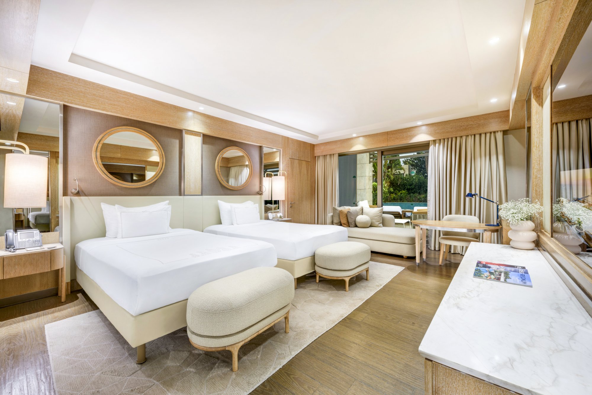 Tento unikátní pokoj se pyšní přímým přístupem do společného bazénu stejně jako venkovní terasou s opalovacími lehátky, slunečníkem a sedací soupravou. Uvnitř najdete ložnici s manželskou postelí nebo dvěma samostatnými lůžky, šatnu a velkou mramorovou koupelnu. Maximální kapacita: 3 dospělí + 1 dítě