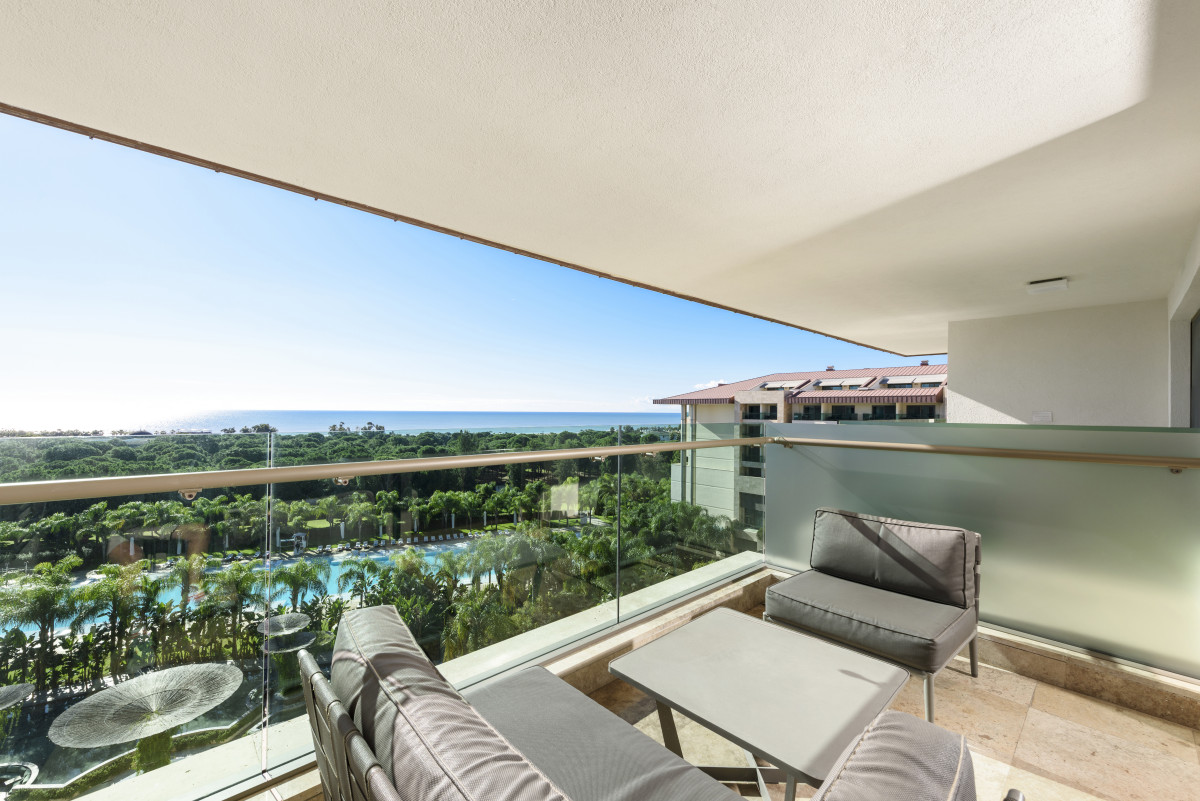 Toto krásné apartmá nabízí úchvatný výhled na moře spolu s velkorysým obytným prostorem, který se skládá z ložnice s manželskou postelí, samostatného obývacího pokoje s posezením, šatny a dvou koupelen. Velkou předností apartmá jsou také dva balkóny s posezením. Maximální kapacita: 4 dospělí + 1 dítě