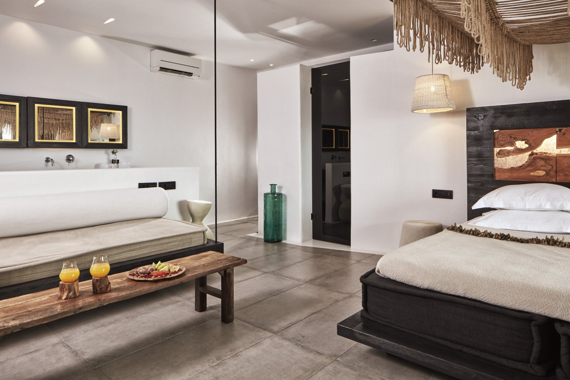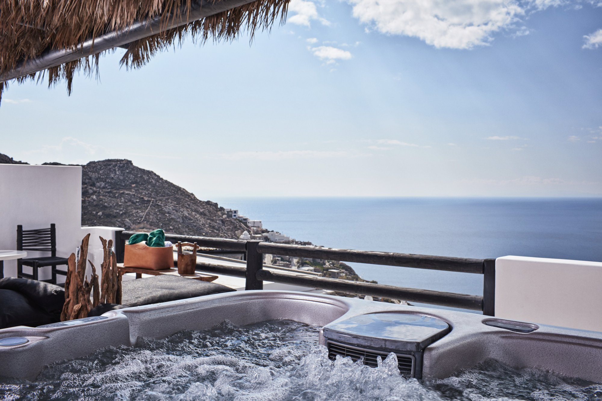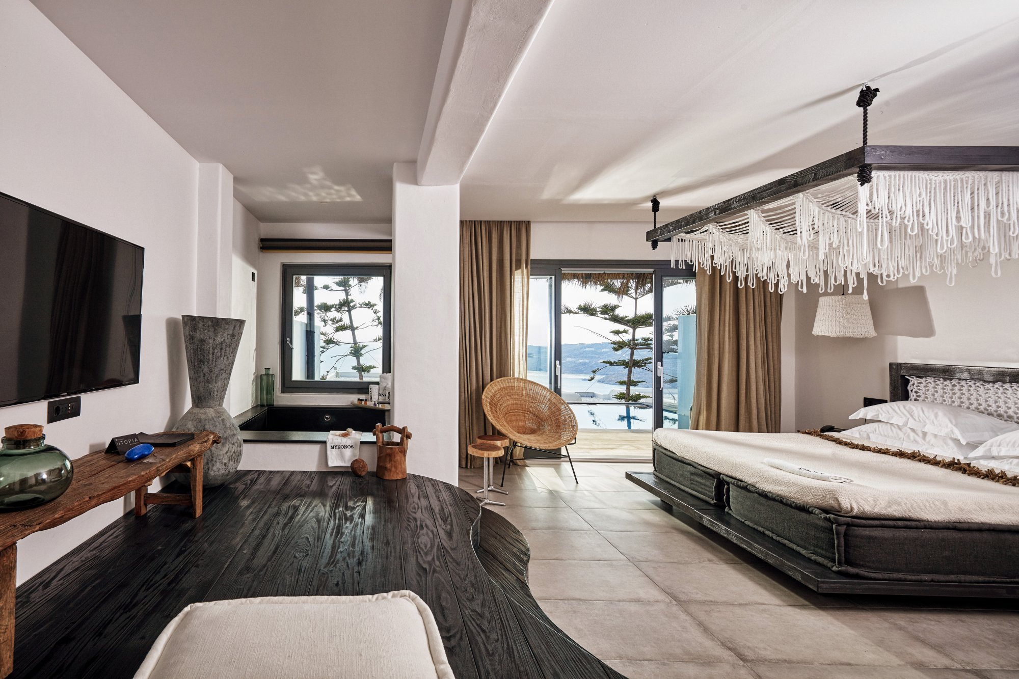 Doprajte si dokonalé pohodlie v podobe tejto štýlovej izby (35 m2) s vonkajšou vírivkou ako stvorenou pre nerušenú relaxáciu. Elegantný interiér sa skladá z manželskej postele alebo dvoch samostatných lôžok, pohovky (alebo prístelky) a dizajnovej kúpeľne s dažďovou sprchou. Súčasťou izby je tiež špičkové vybavenie vrátane denne doplňovaných kúpeľňových produktov, luxusných bavlnených obliečok, prémiovej kozmetiky, vysokorýchlostného internetu, dokovacích staníc a tichej klimatizácie. Okrem toho sa môžete tešiť na súkromný balkón s nádherným výhľadom na záliv Elia a ostrov Mykonos. Maximálna kapacita: 3 dospelí.
