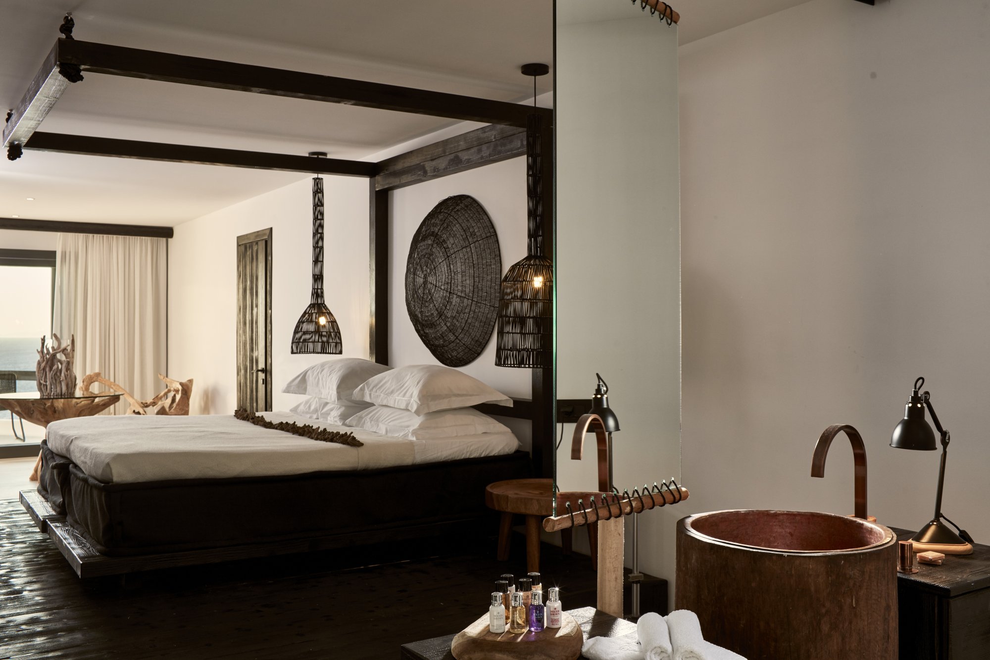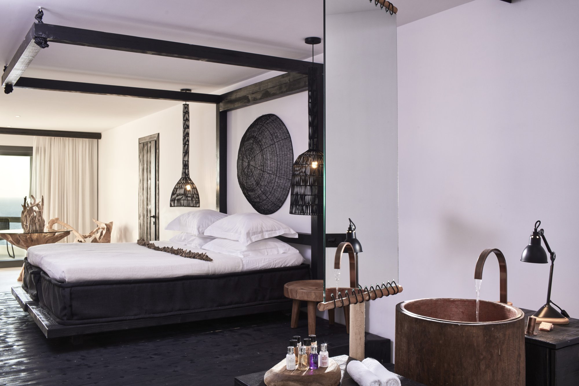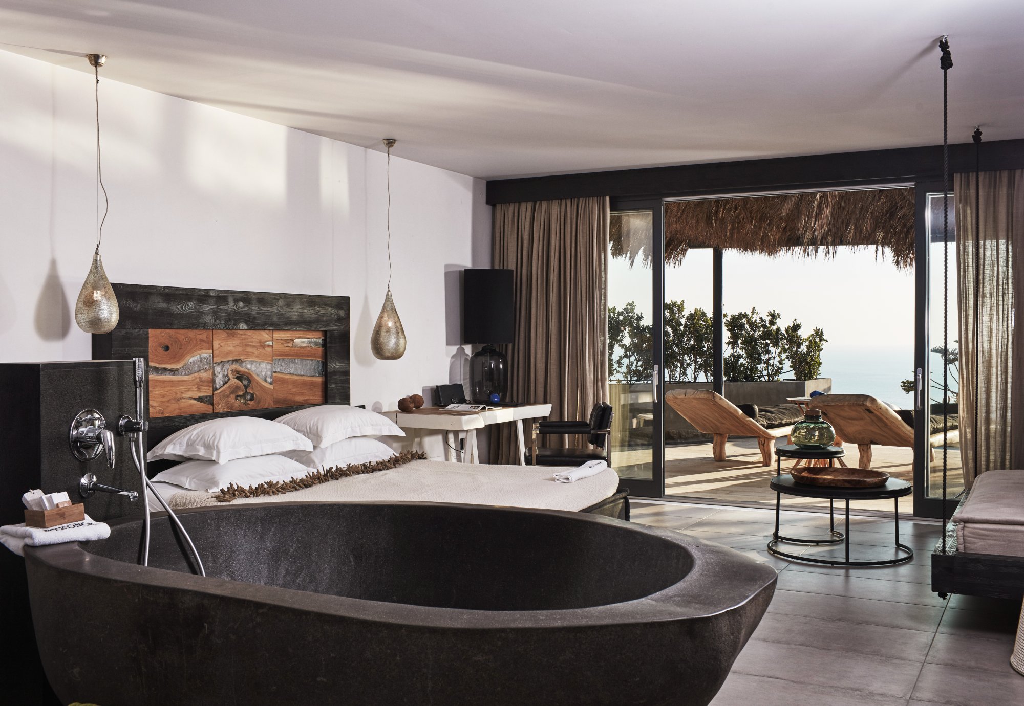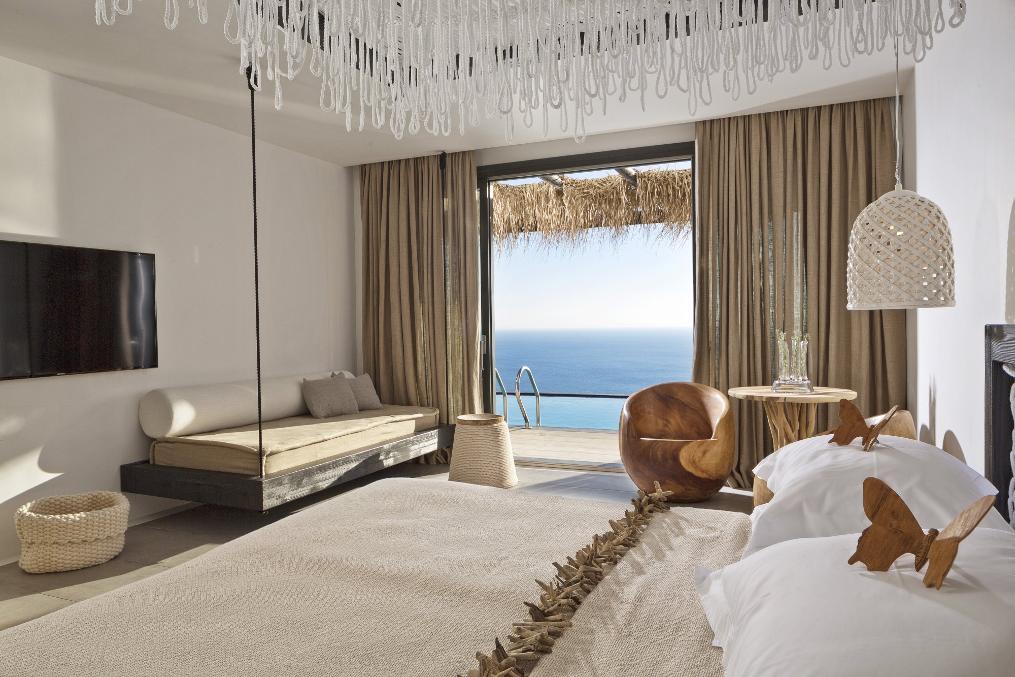 Doprajte si dokonalé pohodlie v podobe tejto štýlovej izby (35 m2) s vonkajšou vírivkou ako stvorenou pre nerušenú relaxáciu. Elegantný interiér sa skladá z manželskej postele alebo dvoch samostatných lôžok, pohovky (alebo prístelky) a dizajnovej kúpeľne s dažďovou sprchou. Súčasťou izby je tiež špičkové vybavenie vrátane denne doplňovaných kúpeľňových produktov, luxusných bavlnených obliečok, prémiovej kozmetiky, vysokorýchlostného internetu, dokovacích staníc a tichej klimatizácie. Okrem toho sa môžete tešiť na súkromný balkón s nádherným výhľadom na záliv Elia a ostrov Mykonos. Maximálna kapacita: 3 dospelí.
