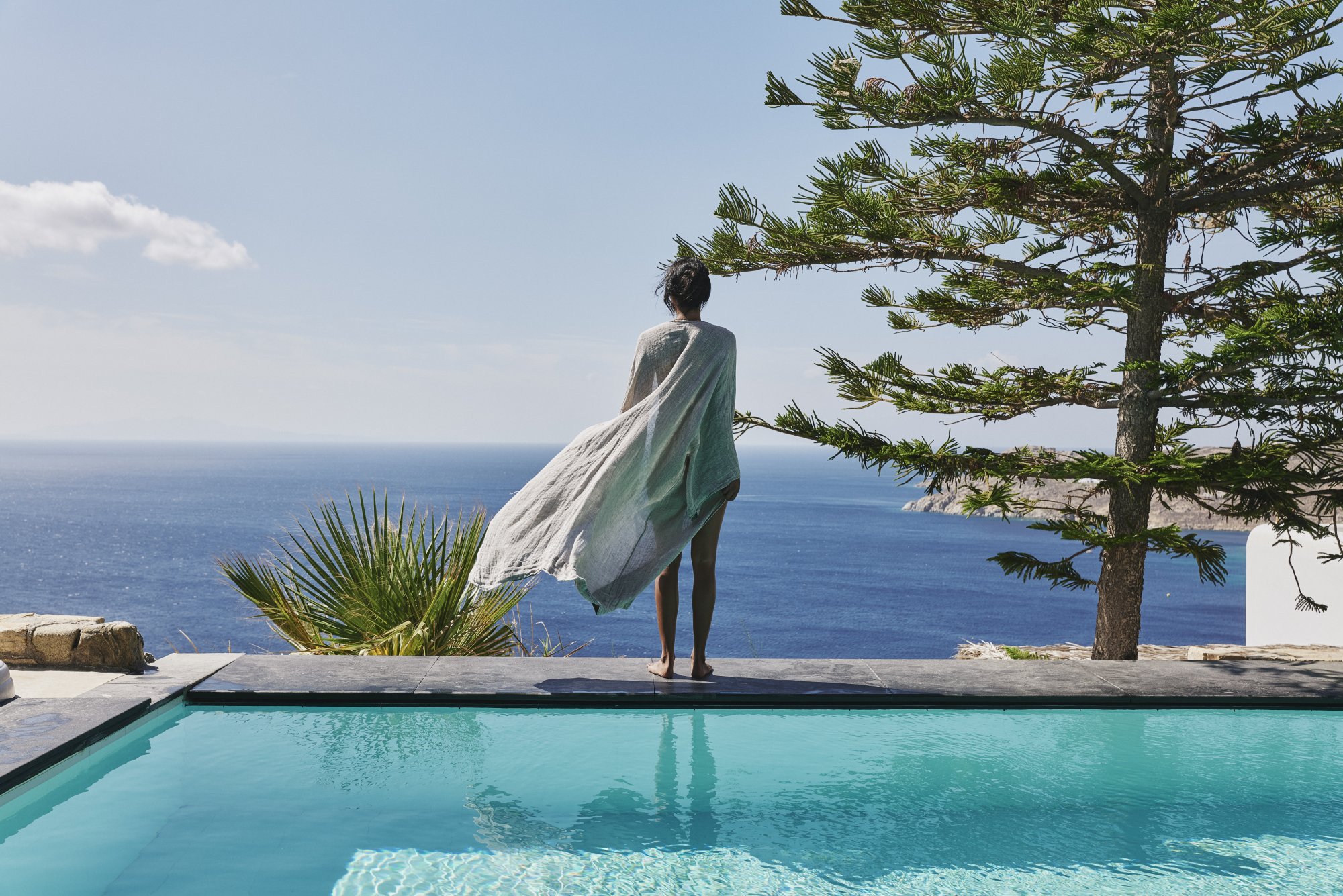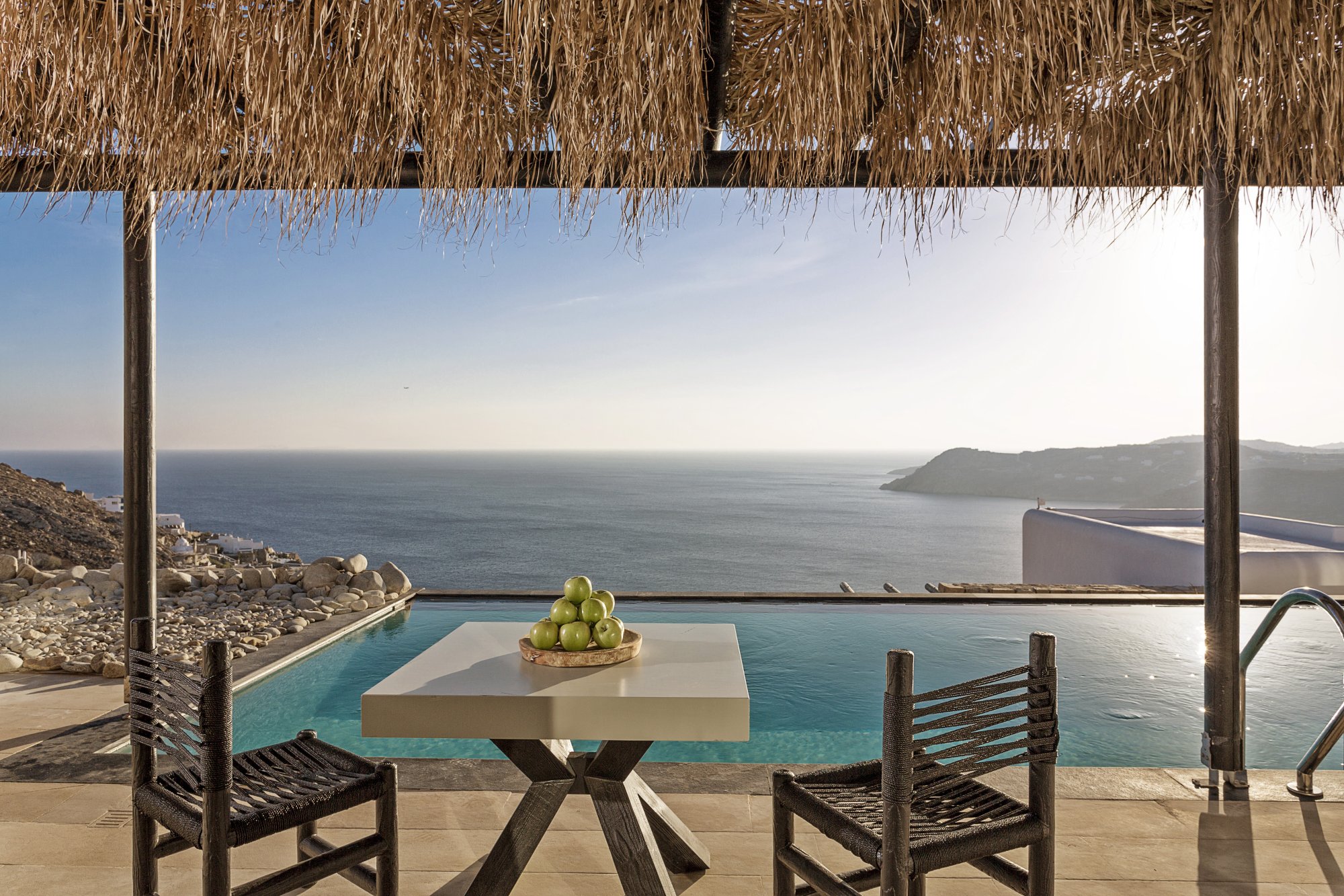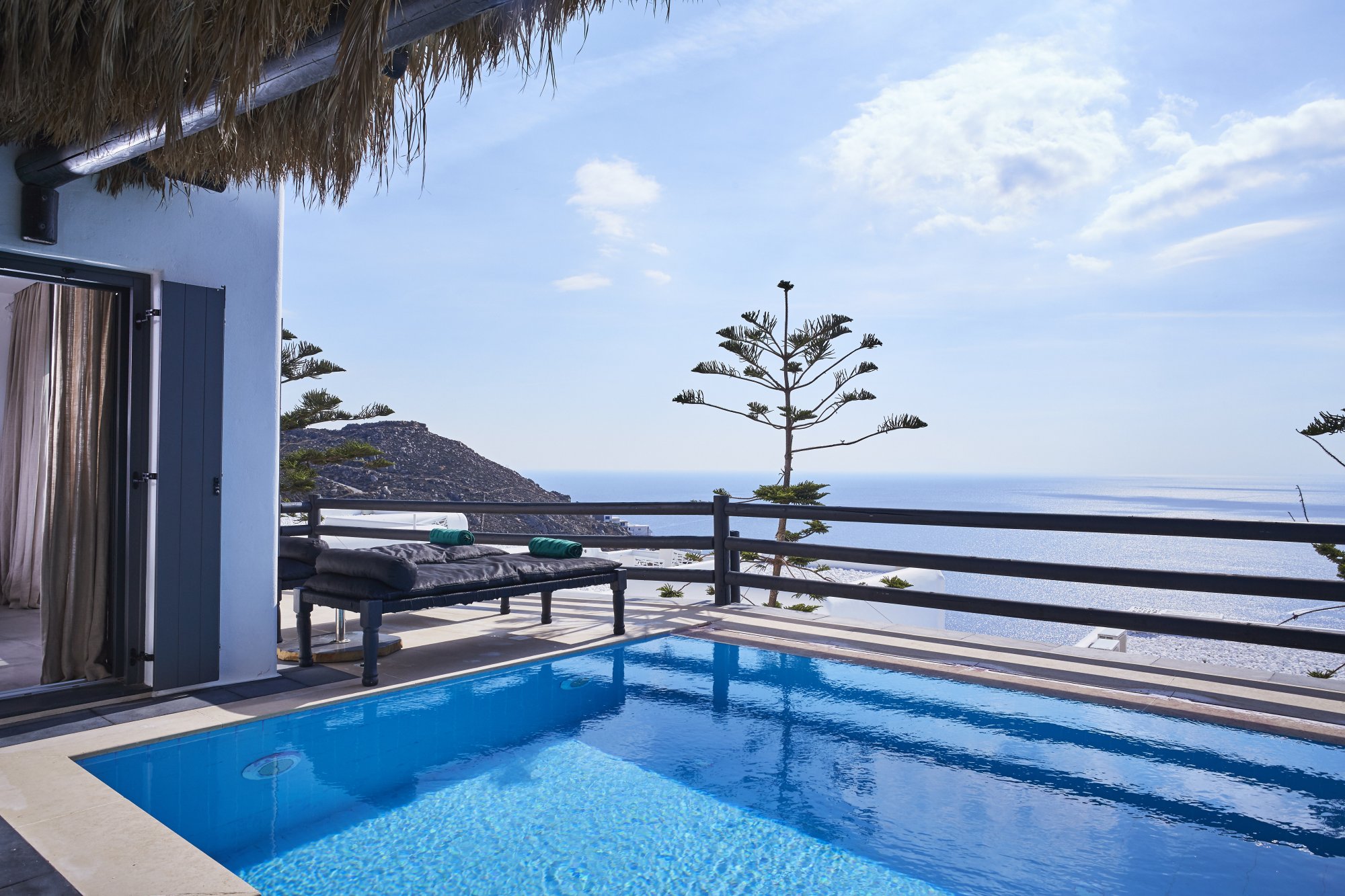 Vychutnajte si dych vyrážajúci výhľad na pláž Elia a Egejské more z balkóna tejto exkluzívnej izby (28 m2), ktorá sa pýši súkromným bazénom ako stvoreným pre nerušenú relaxáciu. Vnútri nájdete manželskú posteľ alebo dve samostatné lôžka a dizajnovú kúpeľňu s dažďovou sprchou alebo vaňou. Sofistikovaný interiér je zariadený v minimalistickom štýle s dôrazom na dokonalé pohodlie. Špeciálne vybavenie zahŕňa luxusné bavlnené obliečky, exkluzívne kozmetické produkty, vysokorýchlostný internet, dokovaciu stanicu a tichú klimatizáciu. Maximálna kapacita: 2 dospelí.