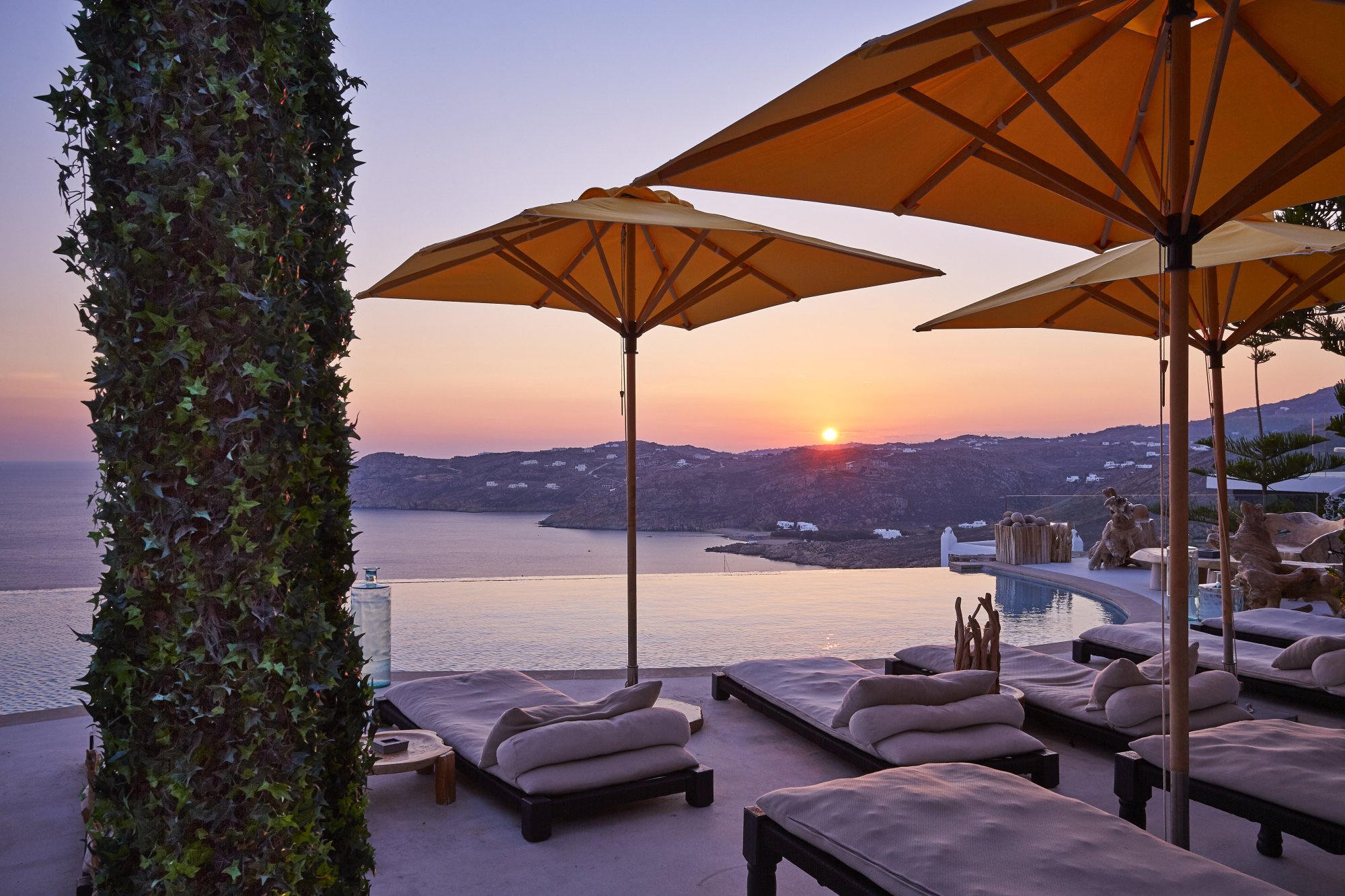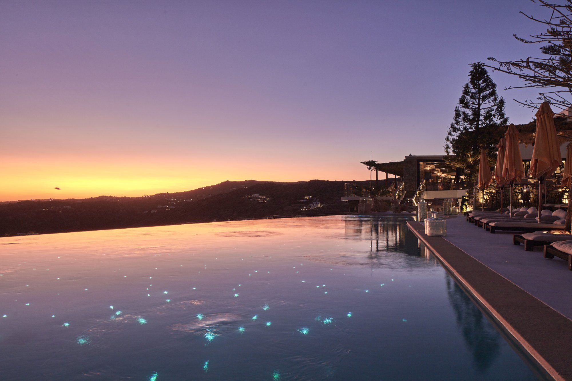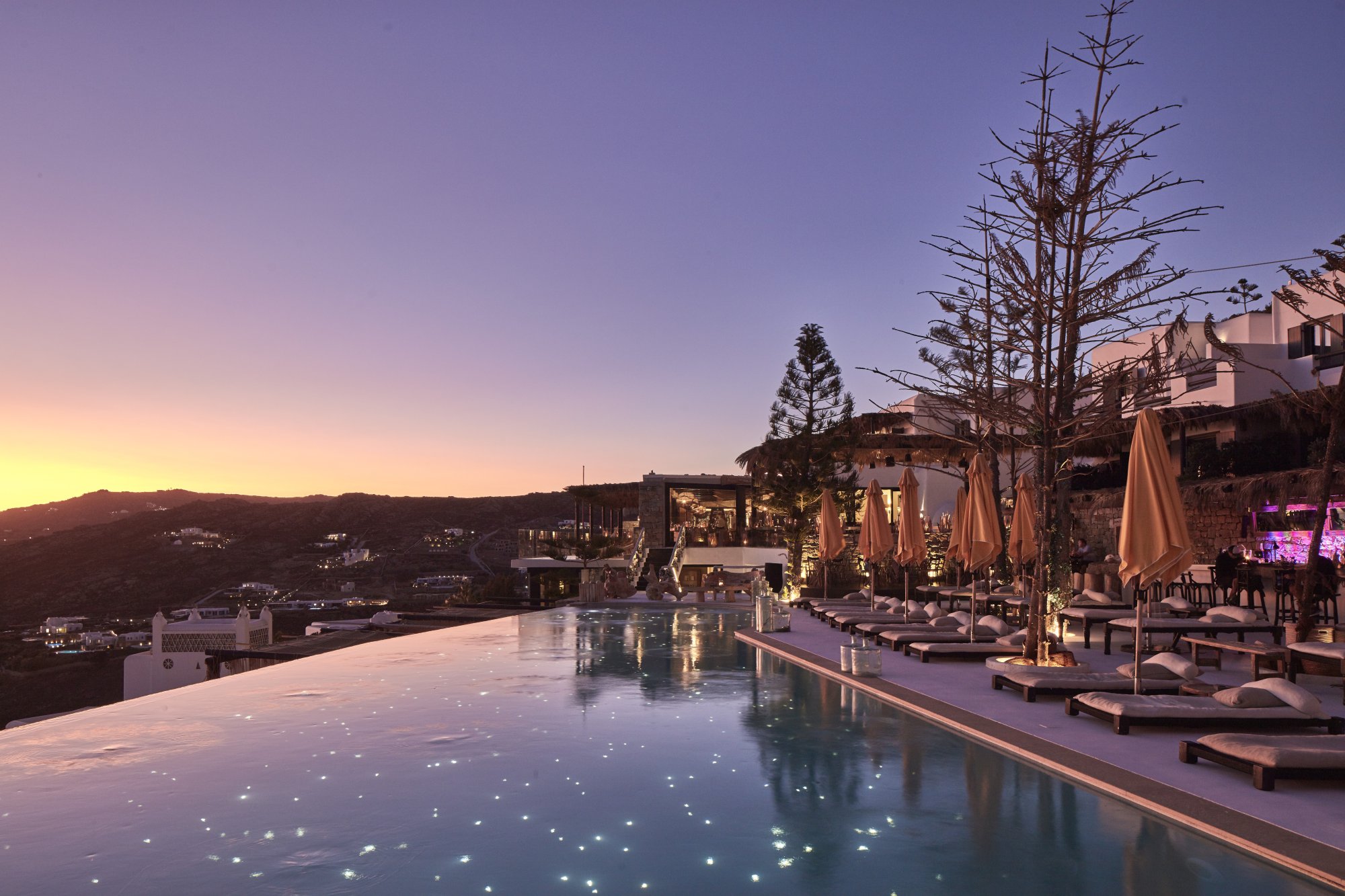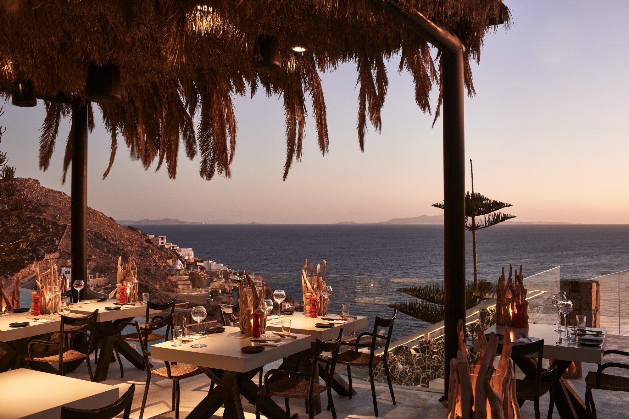 The Pool Club – Tento štýlový bar pri nekonečnom bazéne s panoramatickým výhľadom na pláž Elia je otvorený od rána až do neskorých nočných hodín a ponúka uvoľnenú atmosféru ako stvorenú na nerušený odpočinok. V ktorúkoľvek dennú dobu tu nájdete presne to, na čo máte práve chuť – od osviežujúcich nápojov ráno cez ľahké občerstvenie a exotické koktaily počas popoludnia, aperitívy pri západe slnka až po sofistikovaný výber destilátov po zotmení. Vyberte si z ponuky osviežujúcich smoothies, ľadovej kávy, originálnych koktailov a prémiových liehovín, ktoré dopĺňa menu s drobnými špecialitami. So západom slnka sa Pool Club mení na večerný lounge bar s ožiareným bazénom v pozadí, ktorý prináša do hotela kus vyhláseného nočného života na ostrove Mykonos. Otváracia doba: 11:00–1:00.