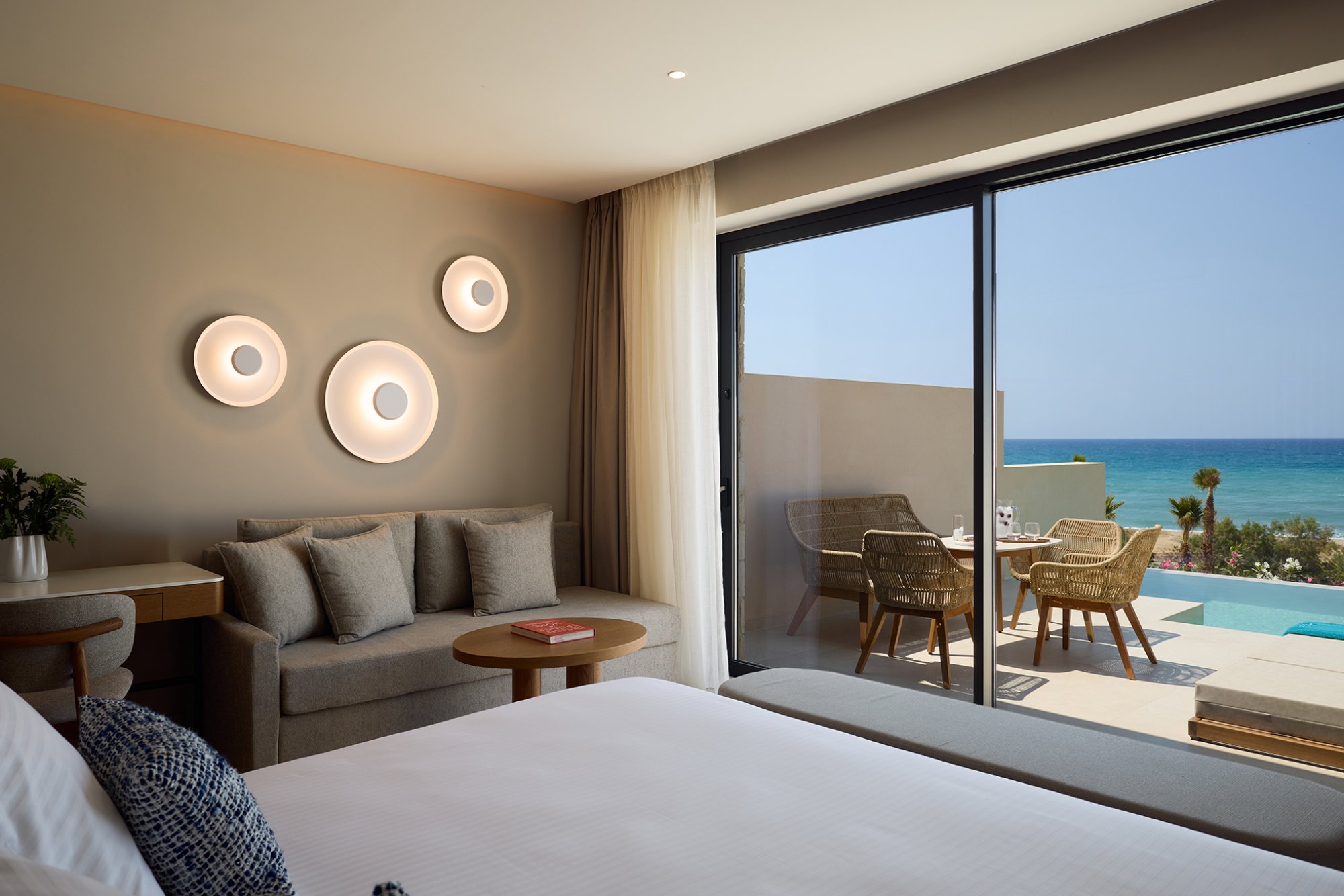 Tento priestranný apartmán je ideálnou voľbou, ak cestujete s celou rodinou. Disponuje totiž dvoma spálňami (jedna je vybavená manželskou posteľou a rozkladacou pohovkou, druhá samostatnými lôžkami), obývacím kútom, kúpeľňou a terasou so súkromným bazénom, odkiaľ sa otvára čiastočný výhľad na more. Maximálna kapacita: 5 dospelých osôb.