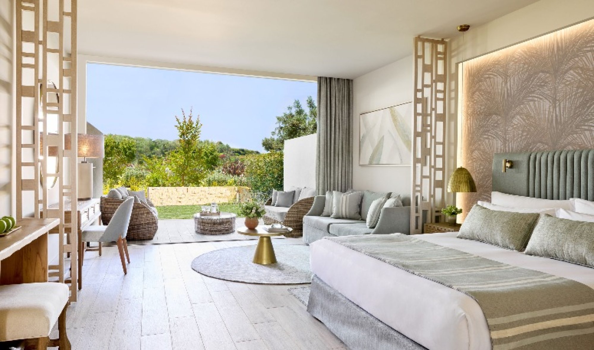 Junior Suite Private Garden, Pool View (48 m², celkom 10) ponúkajú úplne prerobené interiéry a rozšírené kúpeľne. Otvorený priestor na posedenie a ich súkromná záhrada zaisťujú pohodlný pobyt s nádherným výhľadom. Môžu sa tu ubytovať max. 2 dospelí a dve deti do 11,99 rokov.