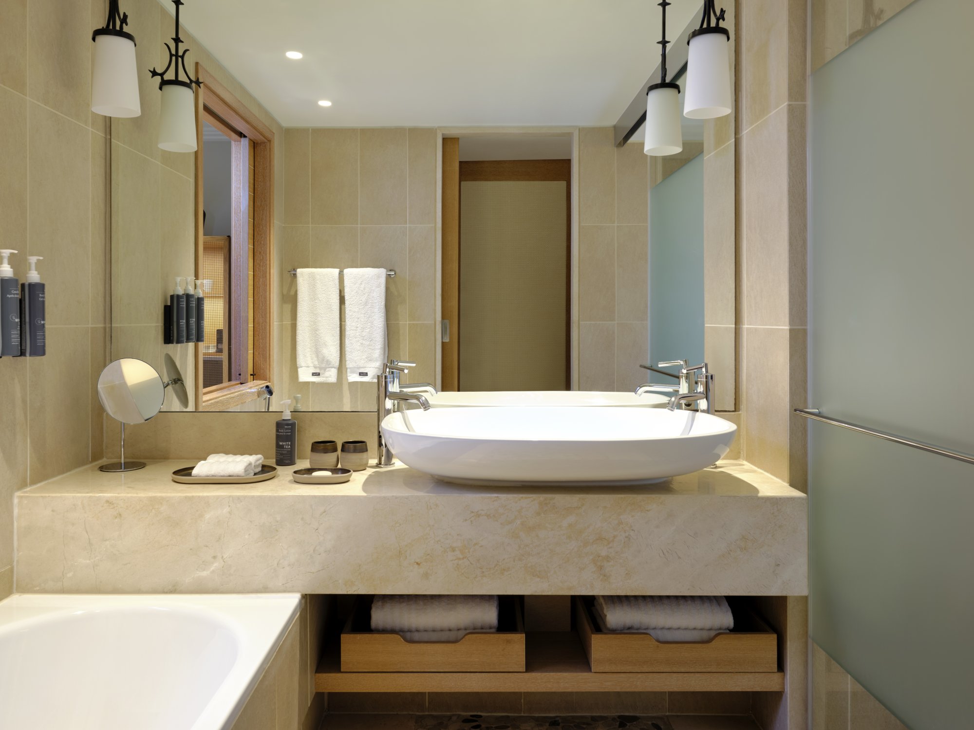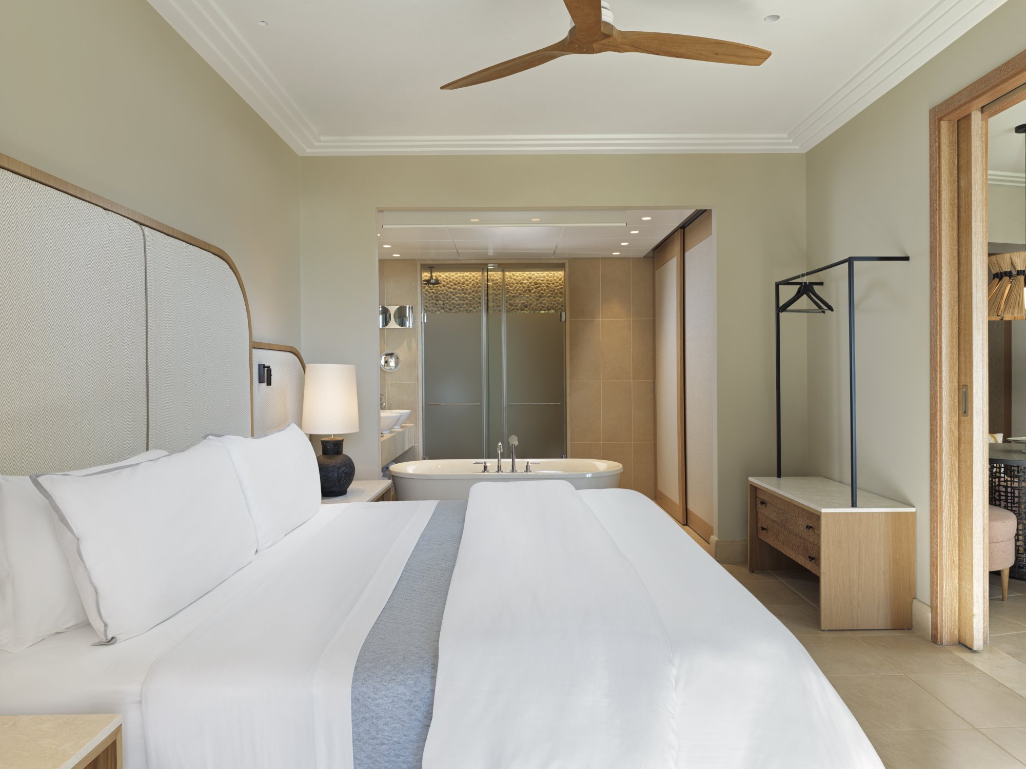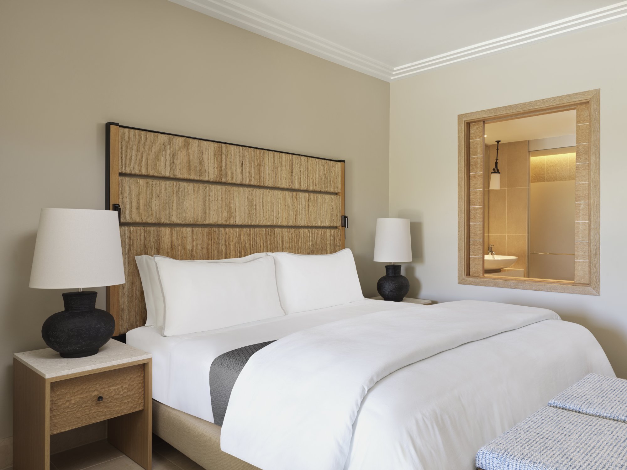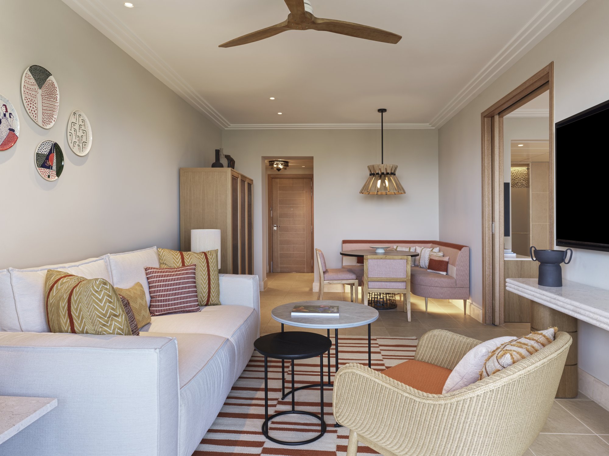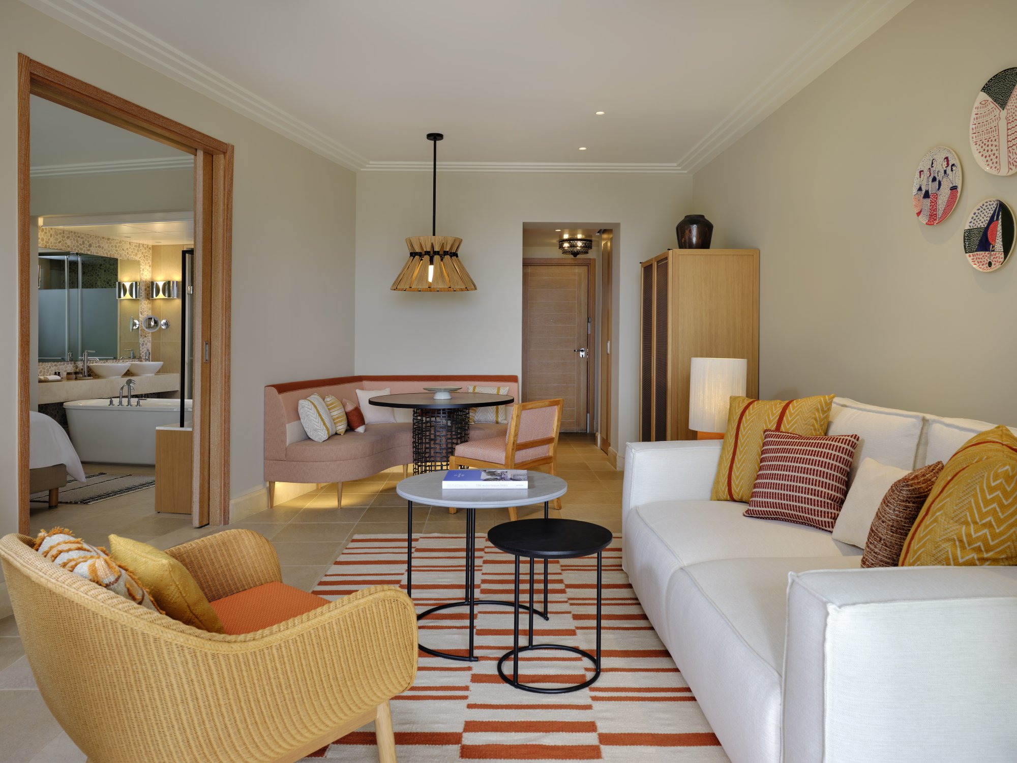 Celá rodina si užije dostatok priestoru v suite s rozľahlou obývacou izbou, ktorá plní funkciu ako relaxačnú tak spoločenskú. Úplne oddelená spálňa s manželskou posteľou king zaručí súkromie. Súkromná terasa ponúka výhľady na bazény rezortu, na olivovníky a krásne upravené záhrady. Suita má dve kúpeľne a na spanie pre ďalších hostí poslúži rozkladacia pohovka.