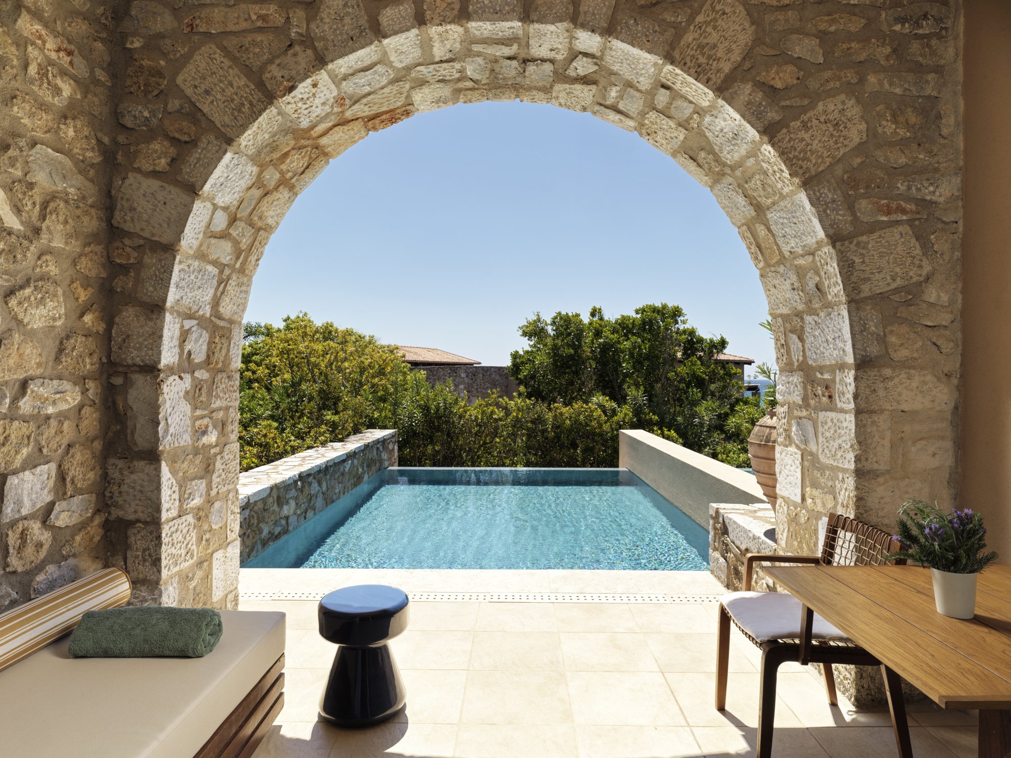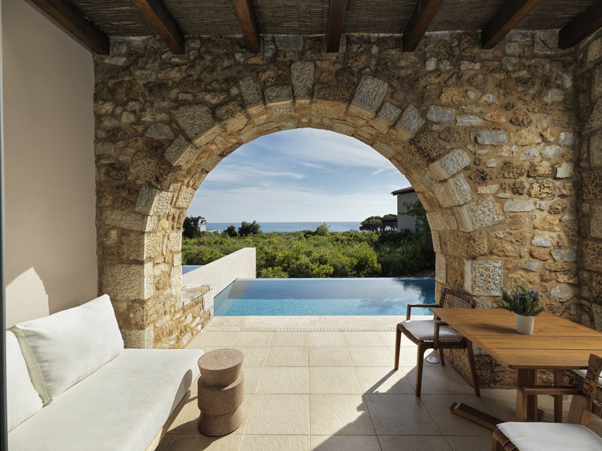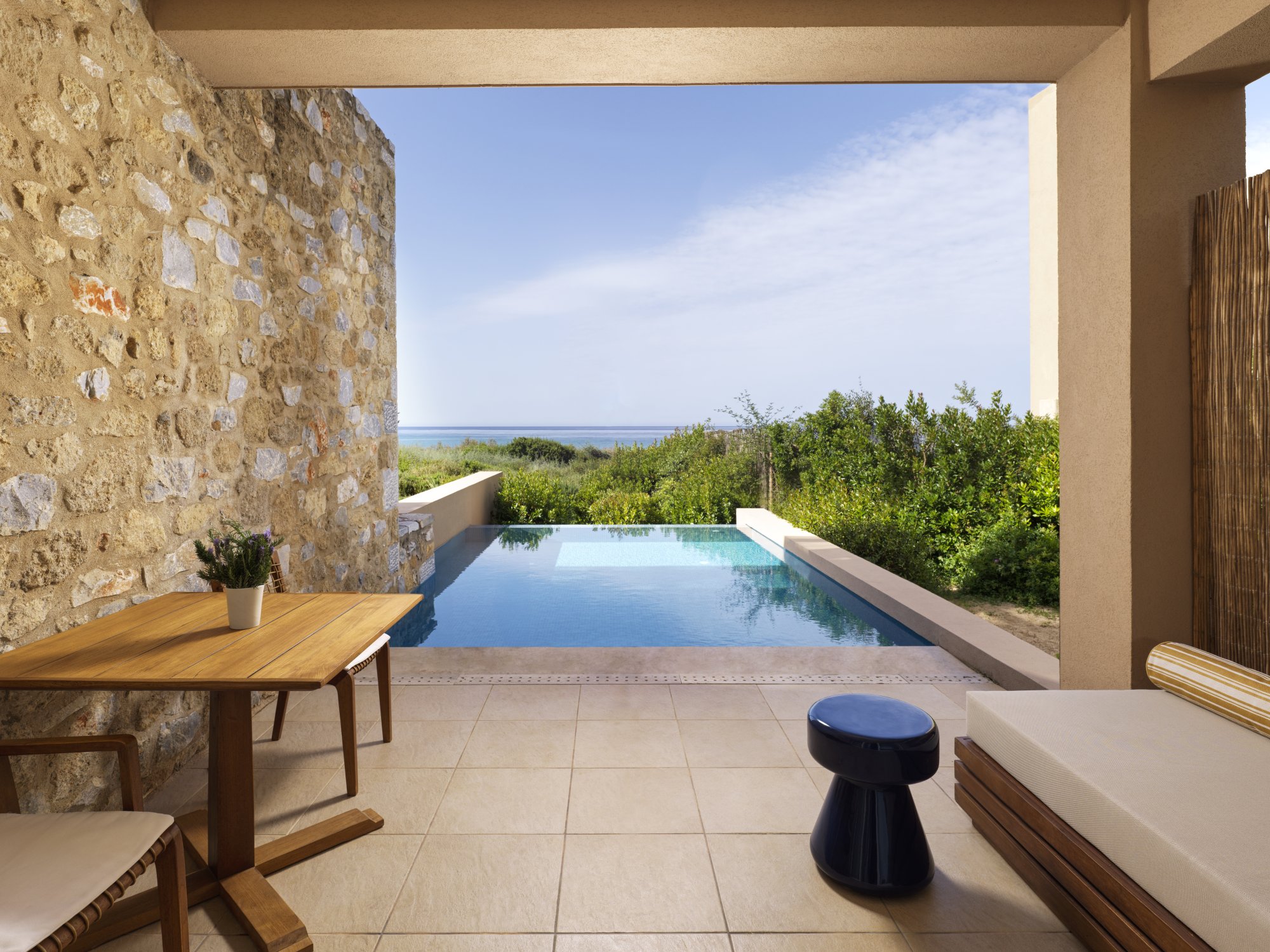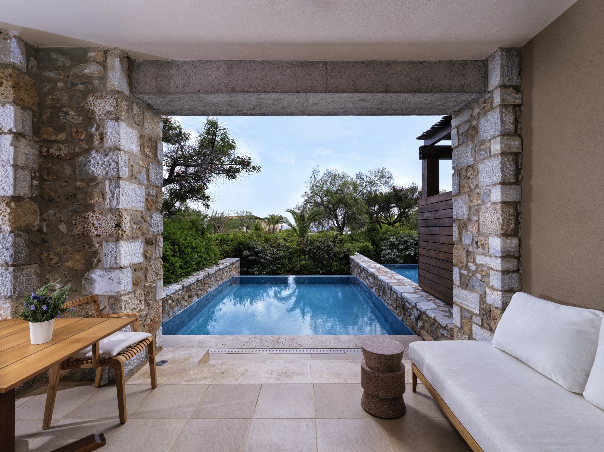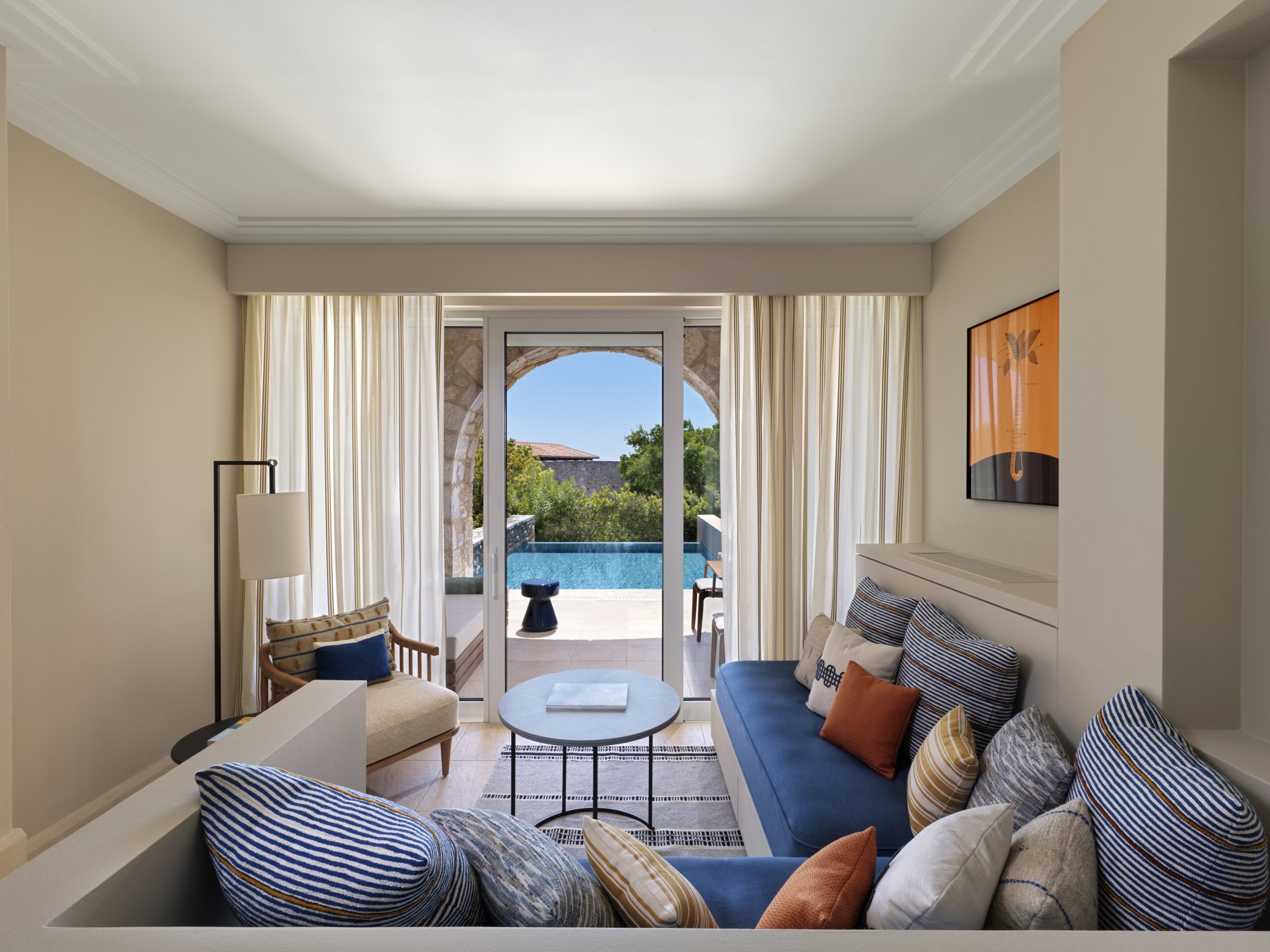 Dovoľte svojim potrebám expandovať do izieb s ešte väčším priestorom a súkromným bazénom s nekonečným okrajom (23 m2). Izby sú skvelým miestom pre tých, čo chcú mať súkromie nielen vo vnútri, ale aj vonku. Z privátnej terasy si užijete výhľad na krásne záhrady rezortu. Vďaka vysokým olivovníkom budete mať dostatok pokoja. Hostia cestujúci s deťmi môžu využiť pohodlnú rohovú pohovku. Na výber je medzi spálňami s manželskou posteľou King alebo dvoma oddelenými lôžkami.
