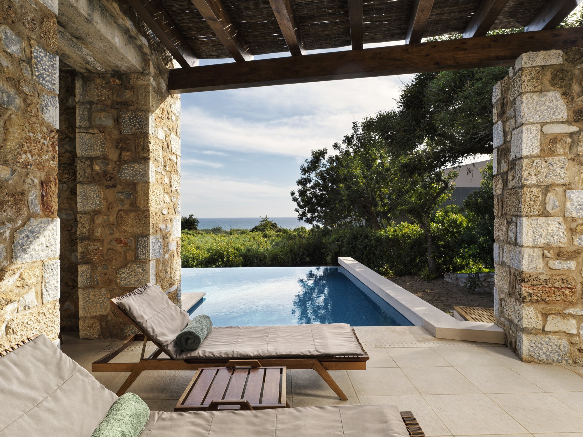 Doprajte si pohľad na trblietavé Iónske more, ktorý bude len a len váš. Tieto izby sľubujú prekrásne a ničím nerušené výhľady na more zo súkromnej terasy s bazénom s nekonečným okrajom (23 m2). Spálne s manželskou posteľou King ubytujú až troch dospelých (tretia osoba na pohovke) alebo dvoch dospelých a jedno dieťa, spálne s dvoma oddelenými lôžkami ponúkajú dostatok priestoru pre dvoch dospelých a jedno dieťa na pohovke, prípadne ďalšie v detskej postieľke.