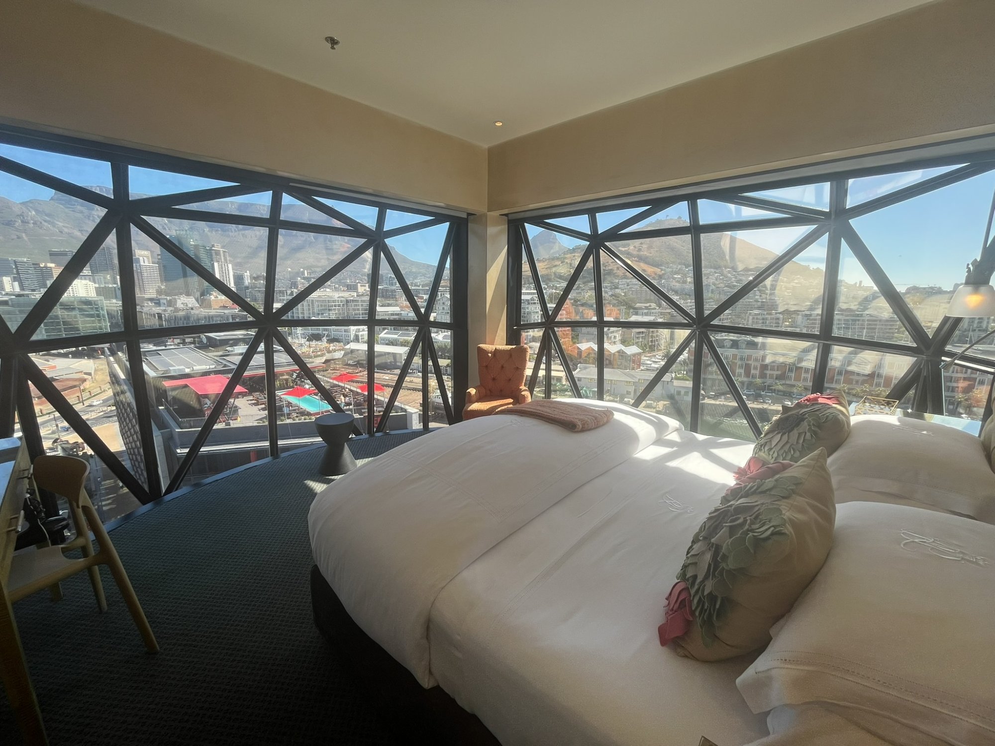 Oběd nás čekal v ikonickém The Silo Hotel, který sídlí v bývalém obilném silu nad muzeem současného afrického umění Zeitz MOCAA. Jde o výrazně art & design hotel s dramatickými prosklenými okny, originálními interiéry a silným důrazem na současné africké umění.