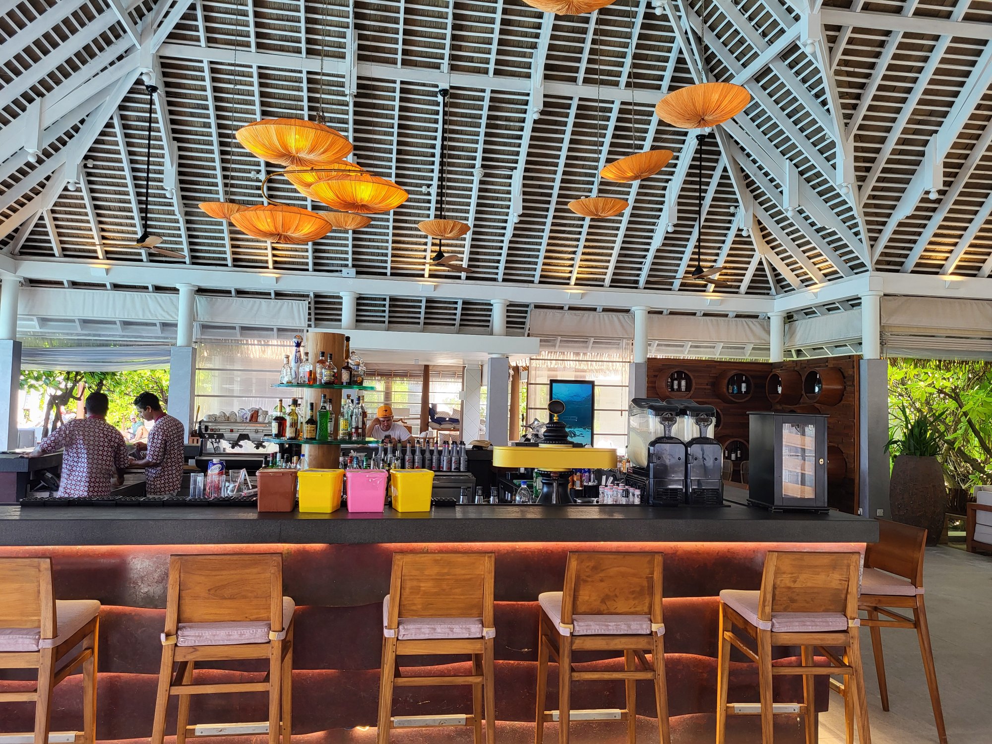 Co musím zvláště pochválit je servis a gastronomie. Kromě bufetové restaurace je možné snídat v a la card restauraci Ralu až do poledne, kdy provoz plynule přechází na obědy. Jelikož jsme byli ubytovaní v nadvodní vilce, byla to naše nejčastější volba. Úplně nás neoslovila nabídka Pizza Shack, navíc zde bylo přes den velmi rušno a kapacita neodpovídala zájmu. Na večeře jsme vyzkoušeli i další a la card možnosti, ale na bufetu a v Ralu jsme byli spokojenější.