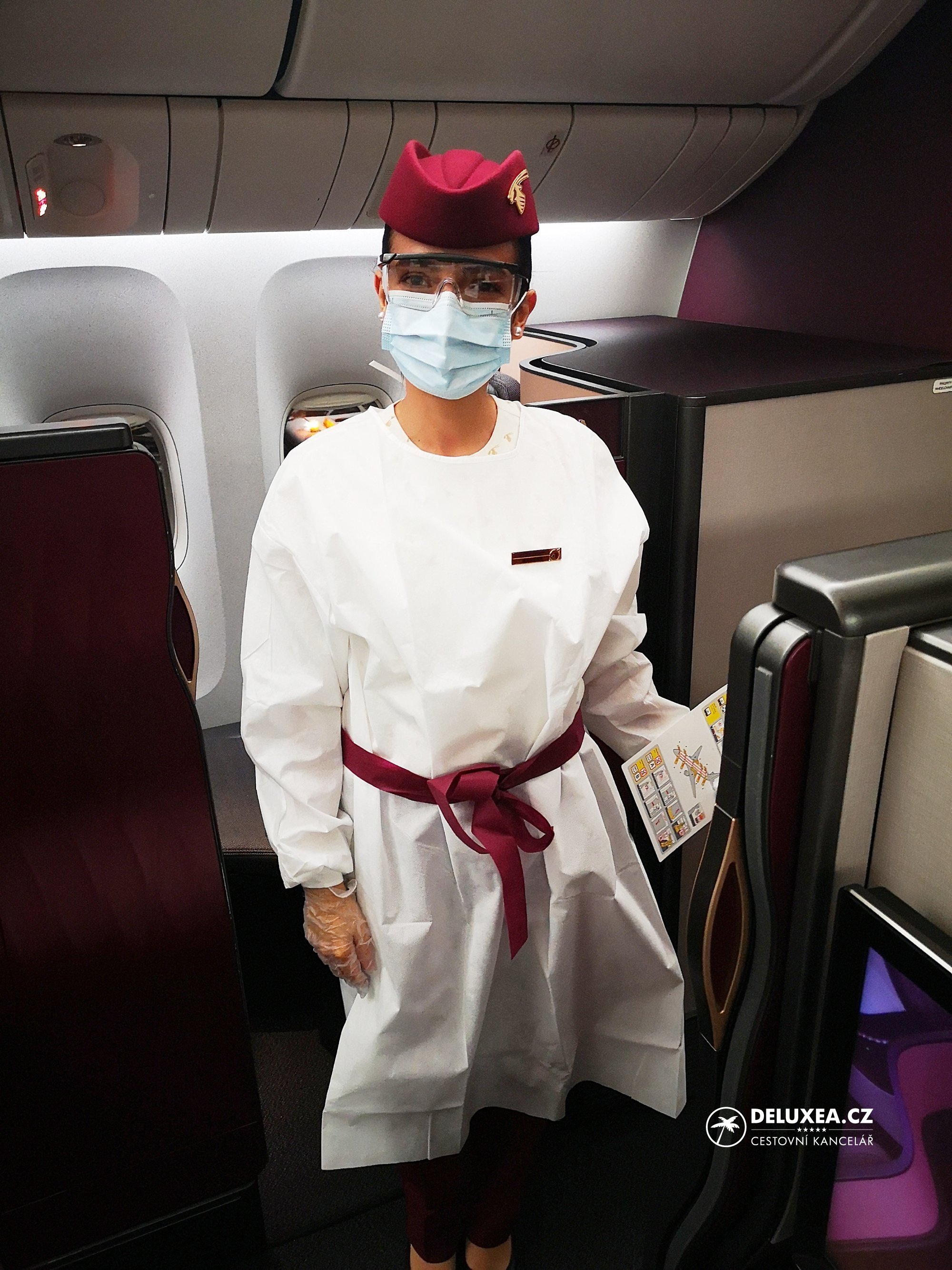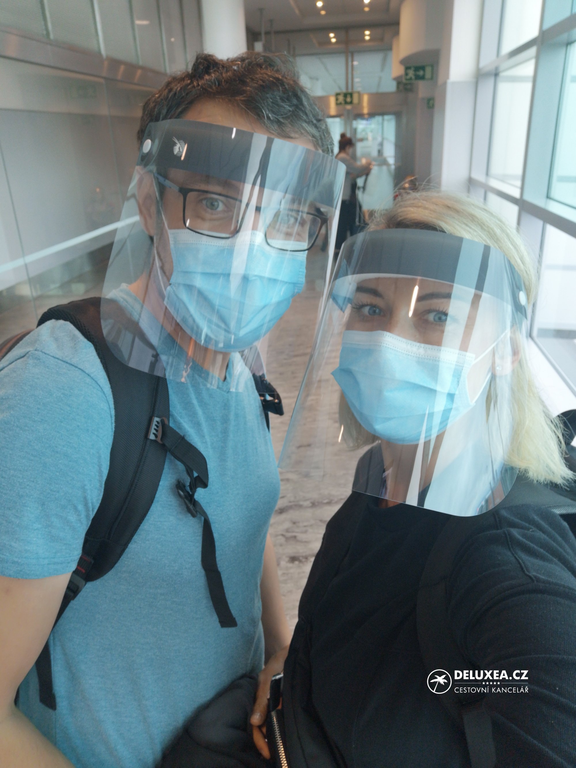Na letišti většina duty free obchodů otevřená, restaurace také. Letiště se v této době liší tím, že je zde méně lidí, v rouškách a všude jsou k dispozici desinfekce. V odletovém gatu Qatar Airways jsme po kontrole příručních zavazadel dostali štíty, se kterými, společně s rouškou, vstupujeme do letadla. Když se rozhlédneme, právě v tomto momentu si uvědomujeme jak se věci změnily a že by tomu ještě před rokem nikdo z nás nevěřil!