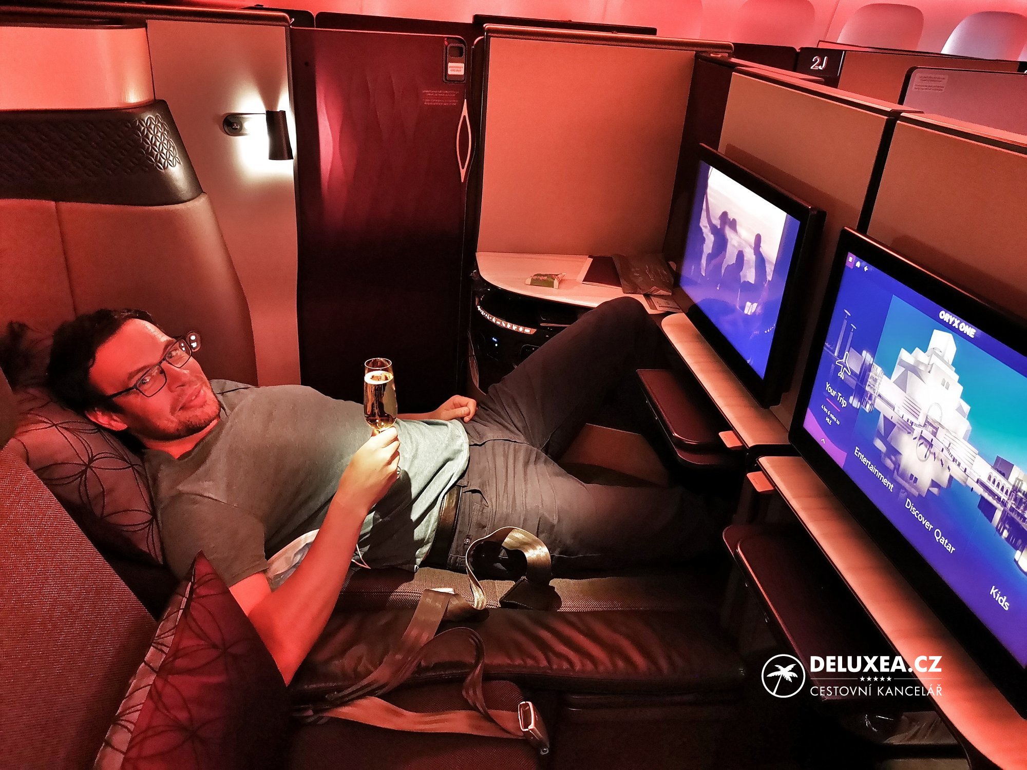 Přesouváme se do gatu a usmálo se na nás štěstí v podobě upgradu do business! Qatar má v boeingu 777ER naprosto vyjímečné a prostorné, uzavíratelné Qsuite. Právě protože jsou suity uzavíratelné, sundáváme si štíty až do přistání! Pomalu se vznášíme do oblak a vychutnáváme sklenku pravého šampaňského. Pak přicházejí krevety, mušle, dezert a Godiva... Jó, takhle bychom mohli létat pořád!