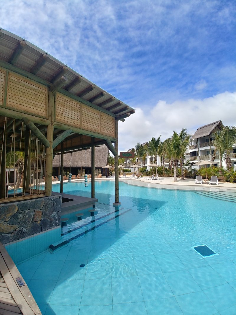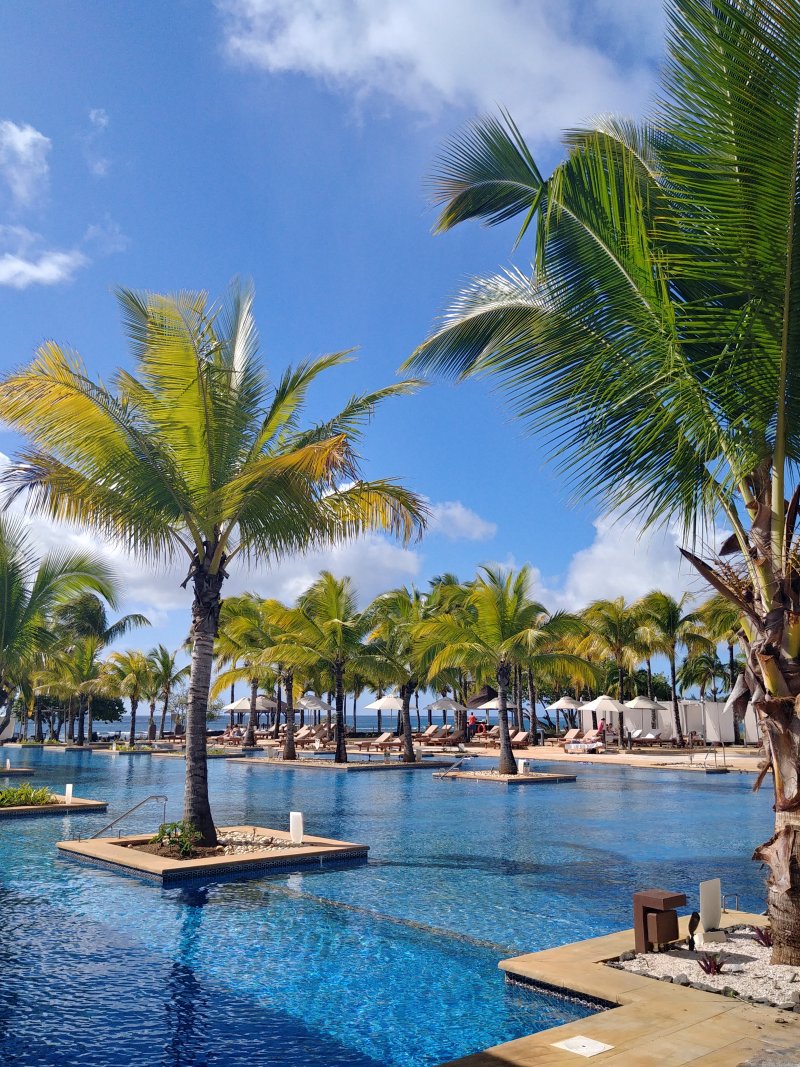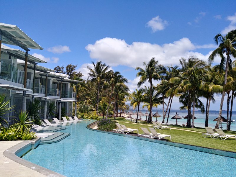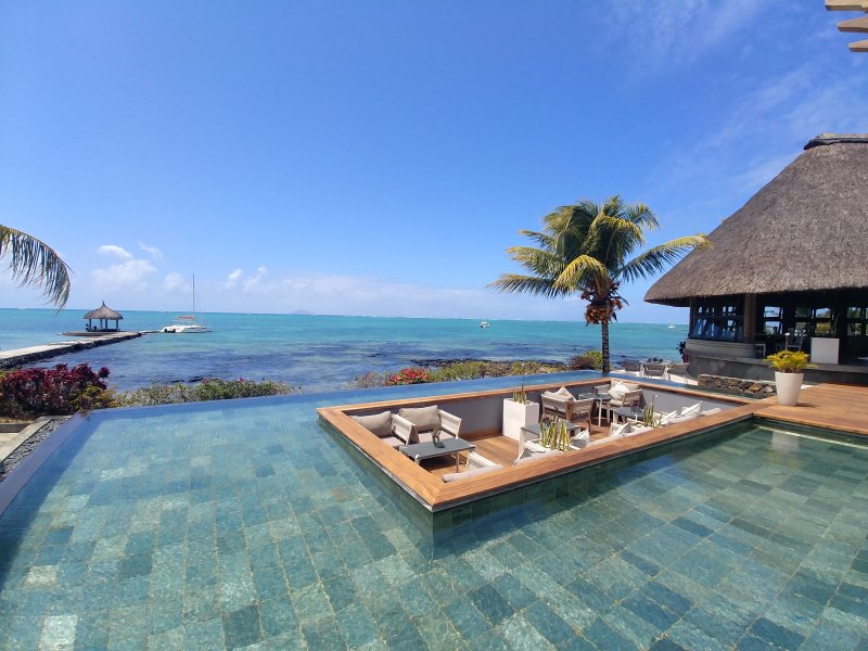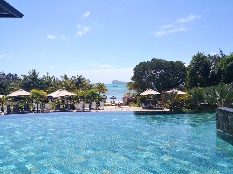 Pláž v hlavní části hotelu pokrývají kameny, pro koupání lze využít menší pláž v zadní části areálu hotelu, kde se nachází také centrum vodních sportů. Zde se nabízí i romantické molo s restaurací. Dalším zajímavým prvkem je umístění stolování uvnitř jednoho z bazénů, které jsme musely vyzkoušet. Oběd ve zdejší restauraci Isle de France s menu z mořských plodů nám velice chutnal. Tento resort určitě doporučíme těm, kteří hledají ničím nerušený odpočinek, uvolněnou atmosféru a pohodu.