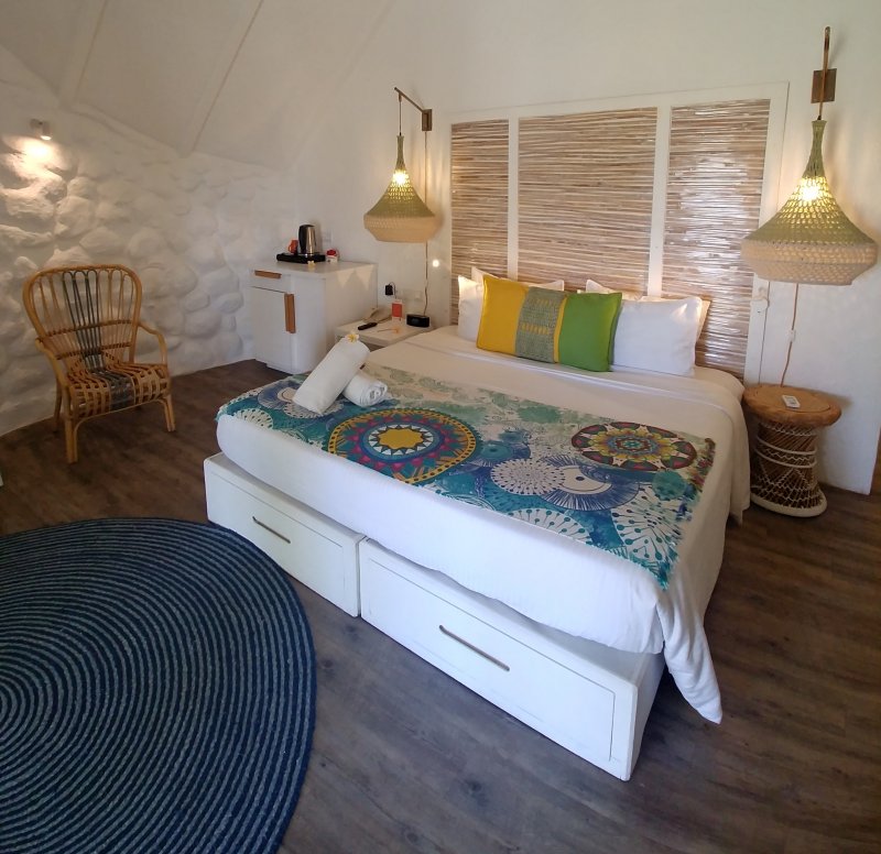 Pro La Pirogue je typické ubytování ve vilkách s doškovou střechou, které svým tvarem připomínají tradiční rybářskou loď, která se právě v kreolštině řekne “la pirogue”. Střechy vilek opravují postupně pořád dokola - tzn. začnou u jedné a když skončí u poslední, mohou začít zase od znova. Velmi nás zaujal také víno koutek, který se nachází kousek od hlavní restaurace. Hosté si zde mohou sníst večeři a k tomu si sami natočit víno, které si vyberou z poměrně široké nabídky.