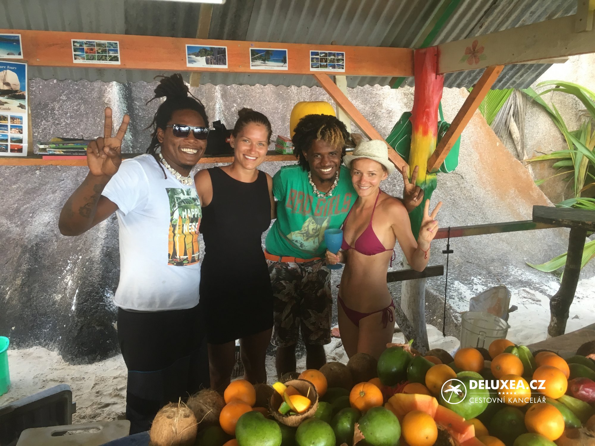Na ostrove všetci bývajú v Guest Housoch, v osobitných domčekoch alebo v penziónoch, ktoré spravujú domáci. Na pláži Anse Source D´argent nevynechajte Fruit Cabana Bar, kde Vám naši noví kamoši na fotke spravia perfektné koktejly a grilované ryby! :)