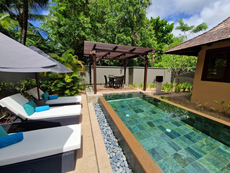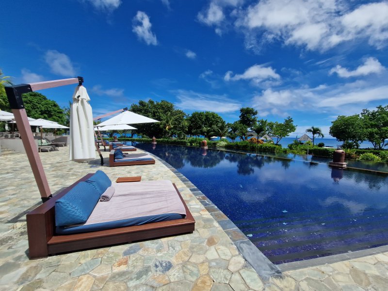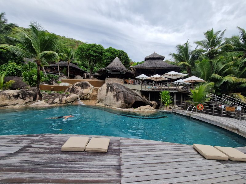 Pracovní harmonogram byl nabitý a tak jsem se přesunul na východ ostrova za prohlídkou hotelu Raffles, který je zdatným konkurentem “Lemurky”. Poměrně velký areál ve svahu nad východním pobřežím je posetý moderními a prostornými vilami, z nichž každá nabízí privátní bazén. K dispozici jsou jak jednoložnicové varianty, tak také rodinné vily až o čtyřech ložnicích. Osobně bych řekl, že je to nejlepší hotel na Praslinu, i když někomu nemusí vyhovovat poloha ve svahu a náročnost pohybu v rámci hotelu. Za zmínku stojí tři hotelové pláže, které jsou sice menší, ale mají své kouzlo a rozhodně nejsou přeplněné. Hotel má také vlastní helipad pro rychlé a zážitkové transfery z letiště.