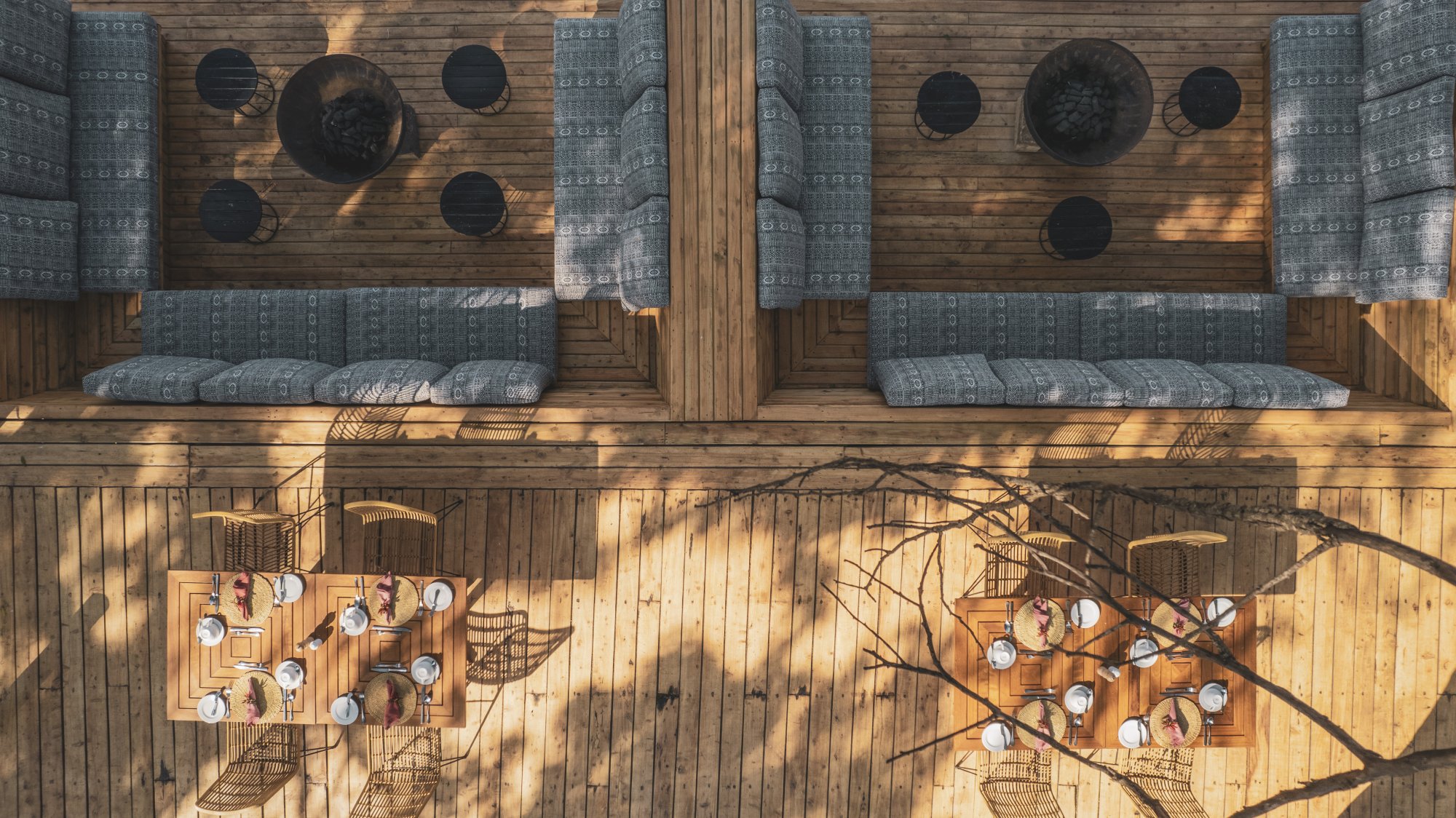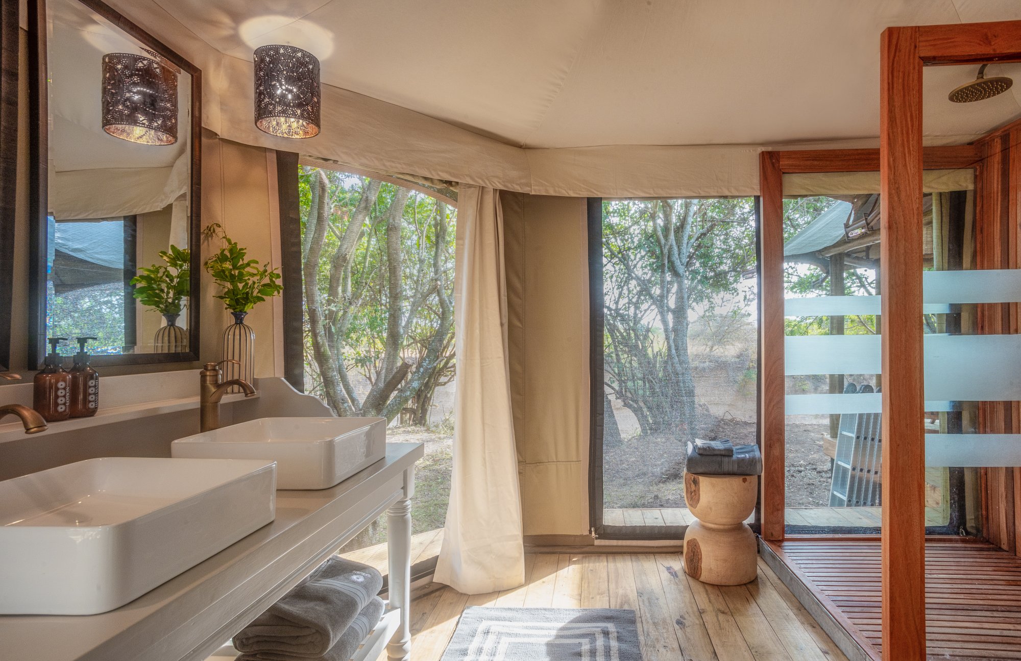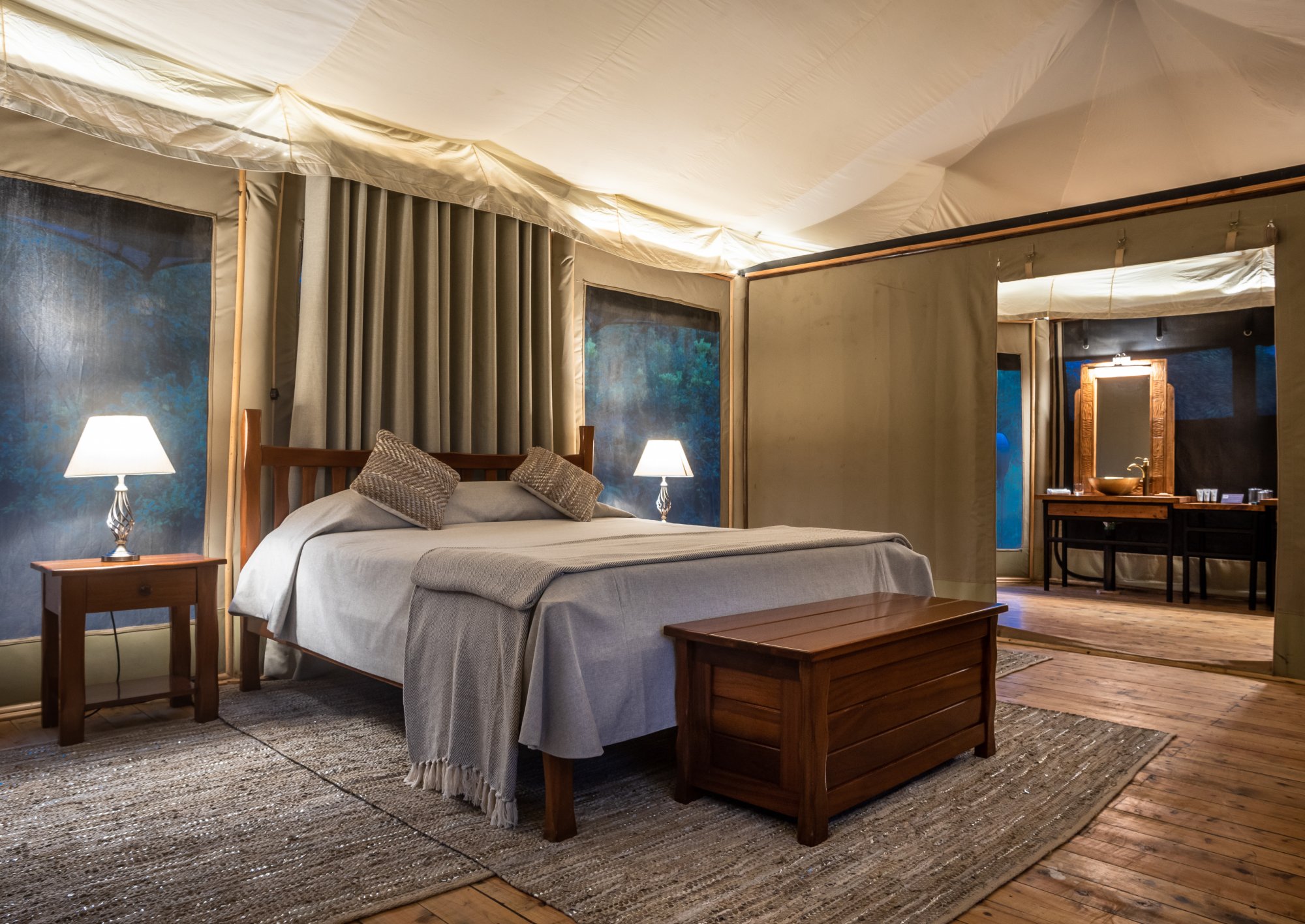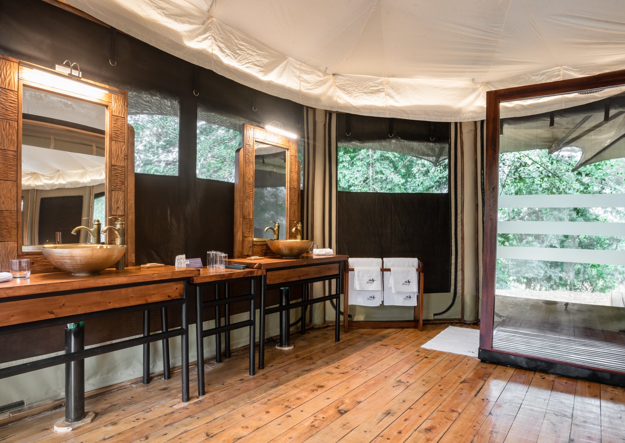 Každý apartmán disponuje rozľahlou drevenou terasou s odnímateľnými plátenými bočnými stenami. Elegantný interiér je zariadený luxusnými látkami, pohodlným nábytkom a decentným osvetlením. Kúpeľne s panoramatickým výhľadom sa skladajú z vnútornej i vonkajšej časti a sú vybavené sprchovacím kútom a špeciálnymi kúpeľňovými produktmi vyrobenými z miestnych prírodných zdrojov.