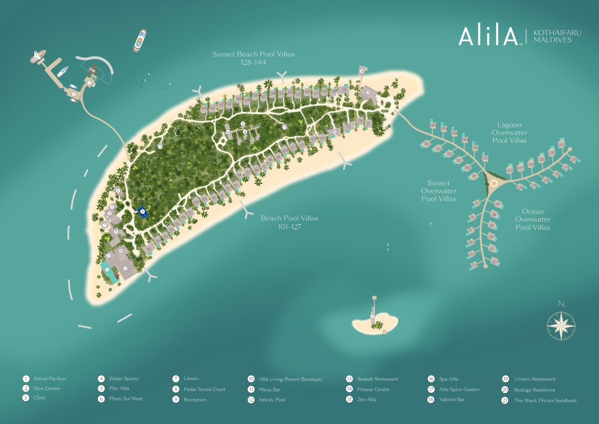 Rezort Alila Kothaifaru Maldives ponúka celkom 41 plážových víl a 36 víl, ktoré sa týčia priamo nad vodou. Všetky vily disponujú súkromným bazénom a sú navrhnuté v harmónii s okolitou prírodou. Priestranné moderné interiéry s upokojujúcou paletou farieb a prírodnými textúrami sú zariadené v sofistikovanom štýle tak, aby poskytovali dokonalé súkromie a pohodlie.