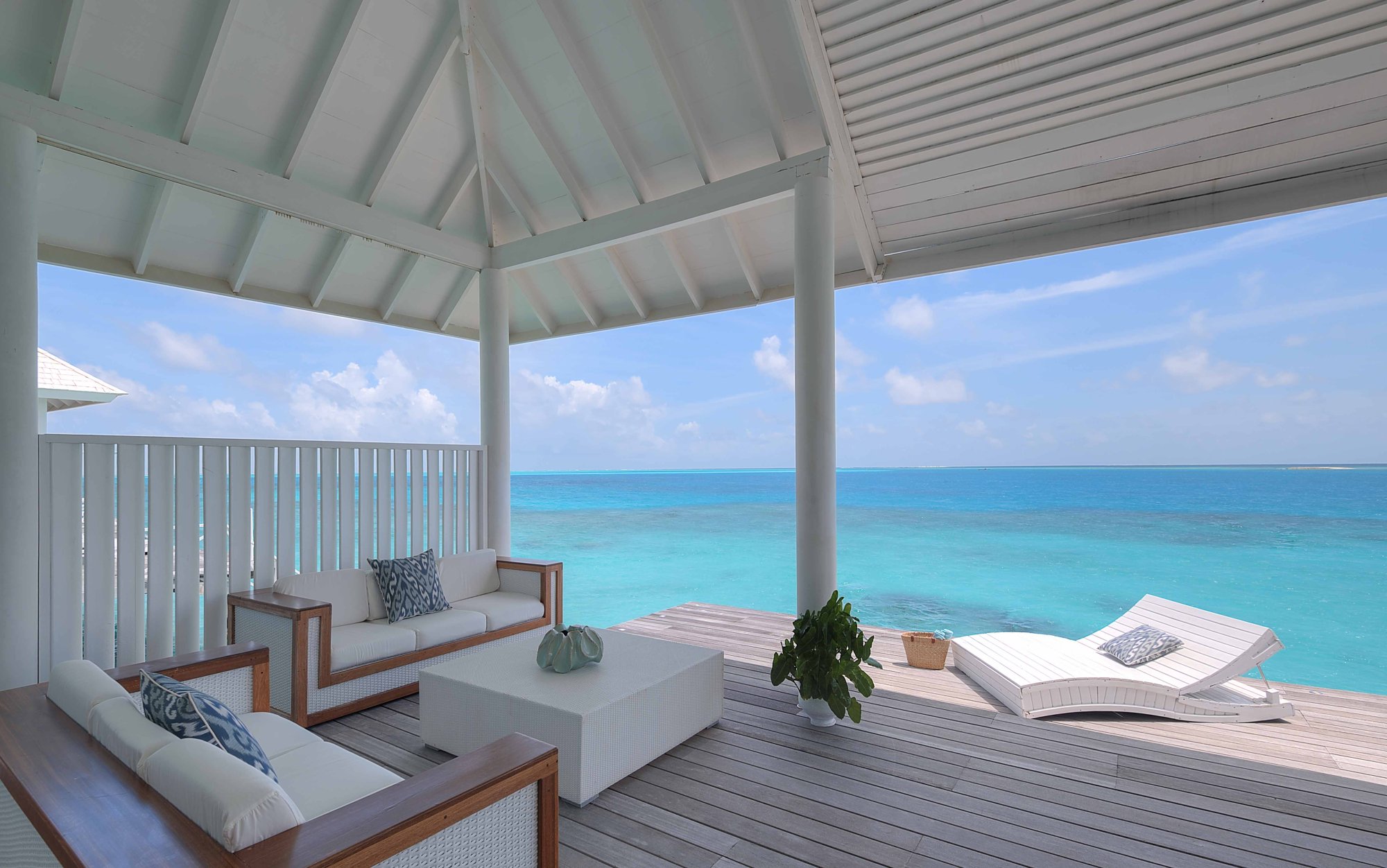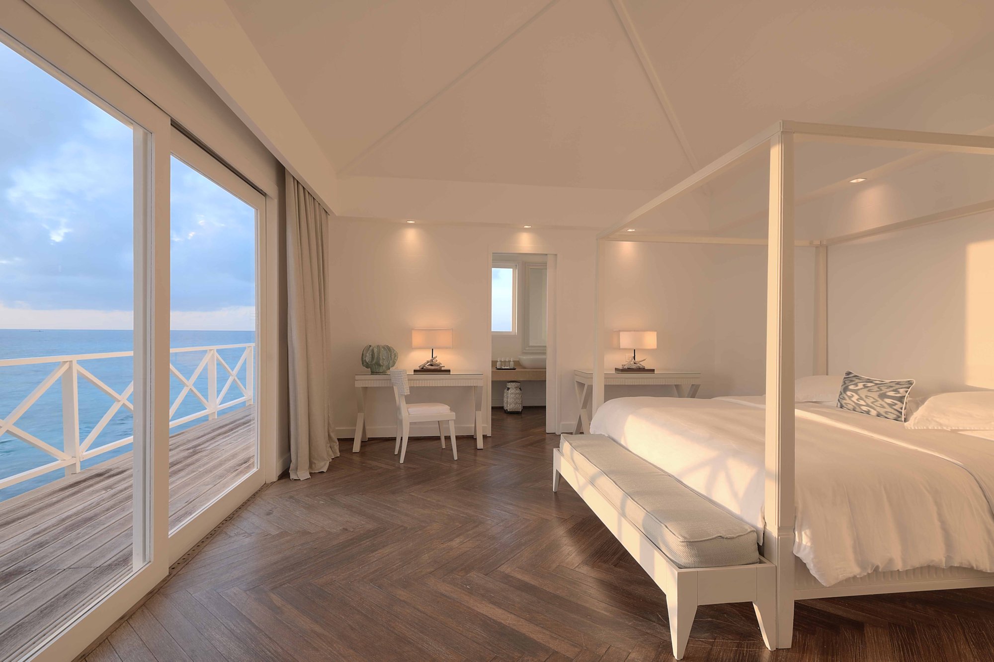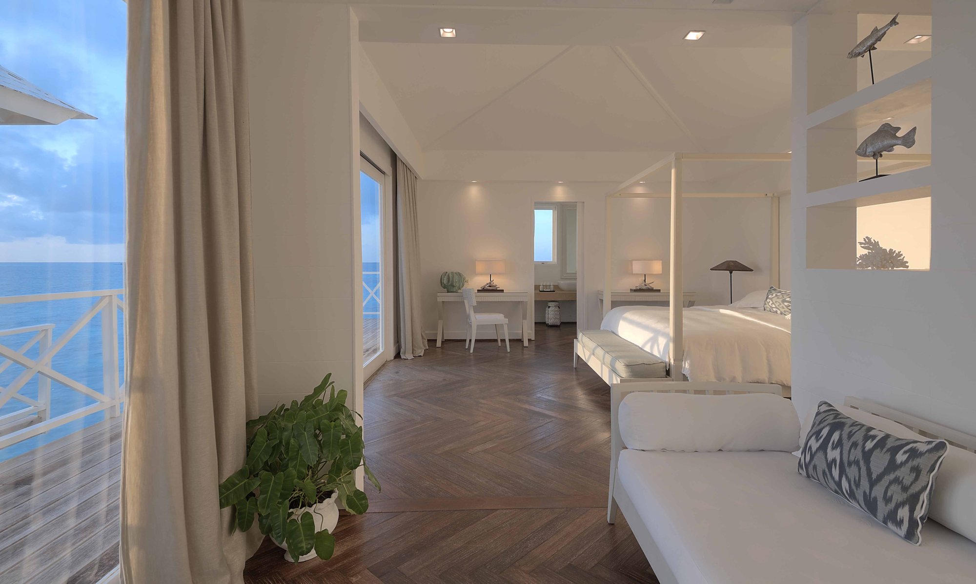 Každá z nadvodných víl ponúka veľkú súkromnú terasu s priamym prístupom k vode. K dispozícii je veľký obývací priestor s elegantným nábytkom, manželská posteľ s nebesami, pohodlný rozkladací gauč a rohový bar. Intímnu atmosféru dotvára moderné talianske osvetlenie a precízne parketové podlahy. Ďalej do vybavenia patrí individuálna klimatizácia, stropný ventilátor, telefón s IDD, zariadenie na prípravu kávy a čaju, Wi-Fi, denne doplňovaný minibar, Apple iMac s ponukou hudby a filmov, digitálny trezor, šatňa, veľký sprchovací kút s duálnou hlavicou a vlastným prístupom na terasu, dvojité umývadlo, zrkadlo, župany, osobné toaletné potreby, plážové osušky, službu upratovania dvakrát denne, bidet a sušič vlasov.