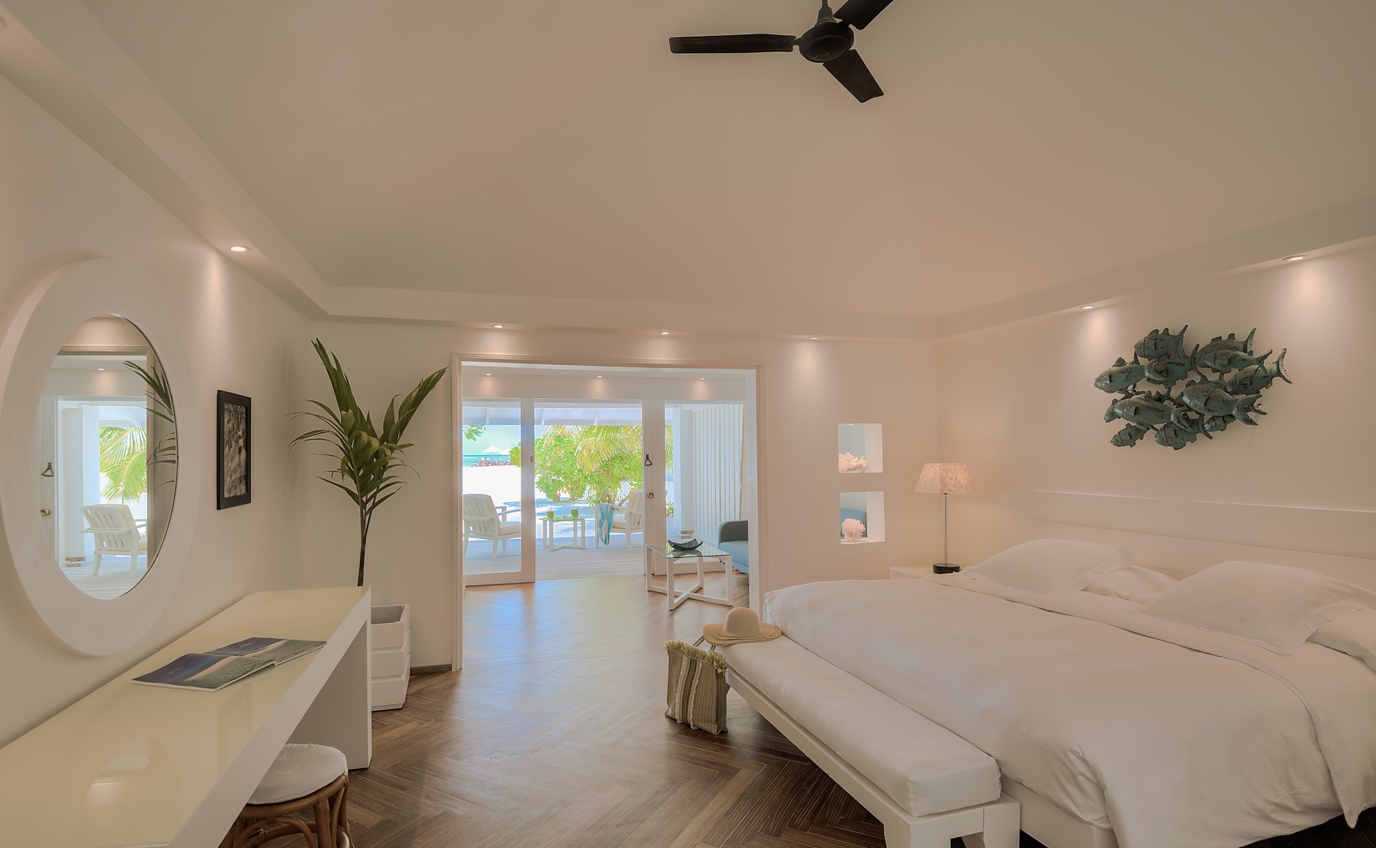 Unikátne nadvodné vily s 2 spálňami sú umiestnené na exkluzívnom mieste na konci móla, kde budete mať najviac súkromia. Každá vila má 2 spálne, ktoré zdieľajú veľkú terasu s bazénom. Izby sú vybavené ratanovým nábytkom na mieru, moderným talianskym osvetlením a precíznymi drevenými parketami. Tešiť sa môžete aj na veľkú obývaciu izbu s pohodlným rozkladacím gaučom a malým rohovým barom. Ďalej do vybavenia patria dve manželské postele s nebesami, individuálna klimatizácia, stropný ventilátor, telefón s IDD, zariadenie na prípravu kávy a čaju, Wi-Fi, denne doplňovaný minibar, Apple iMac s ponukou hudby a filmov, digitálny trezor, šatňa, veľký sprchovací kút s duálnou hlavicou a vlastným prístupom na terasu, dvojité umývadlo, zrkadlo, župany, osobné toaletné potreby, plážové osušky, služba upratovania dvakrát denne, bidet a sušič vlasov.