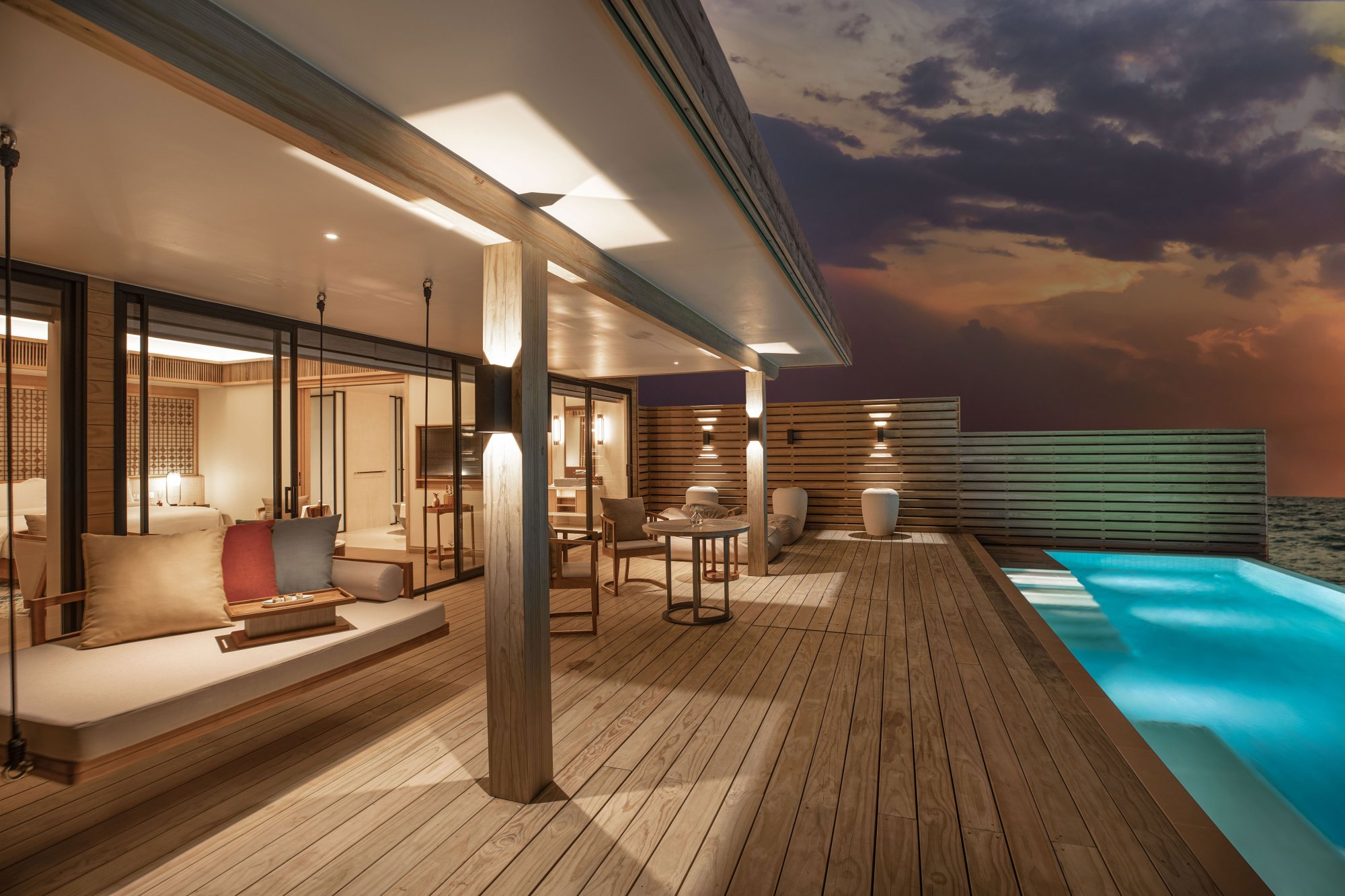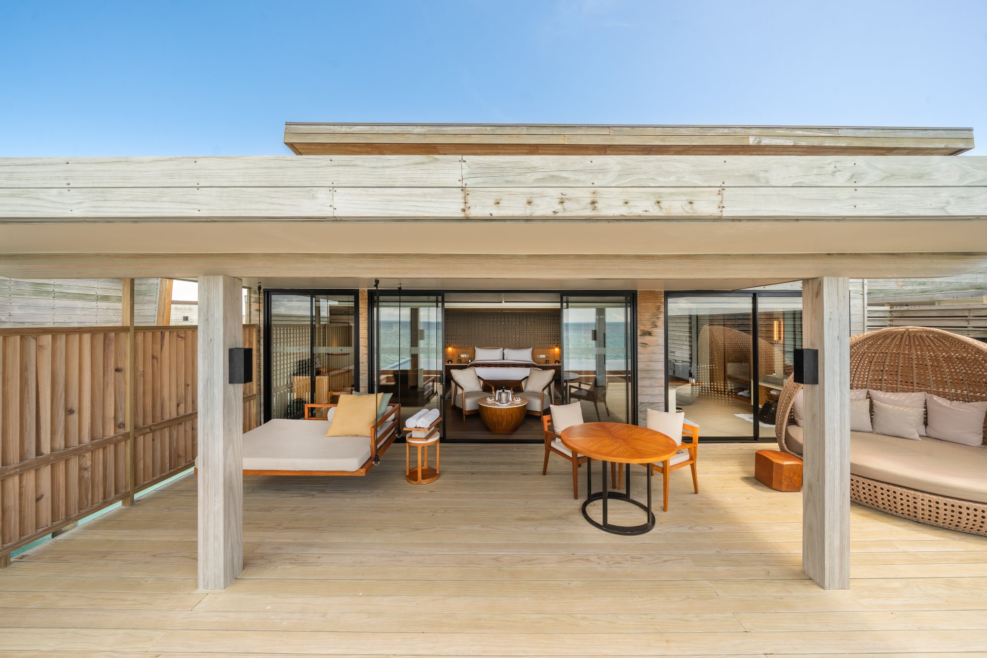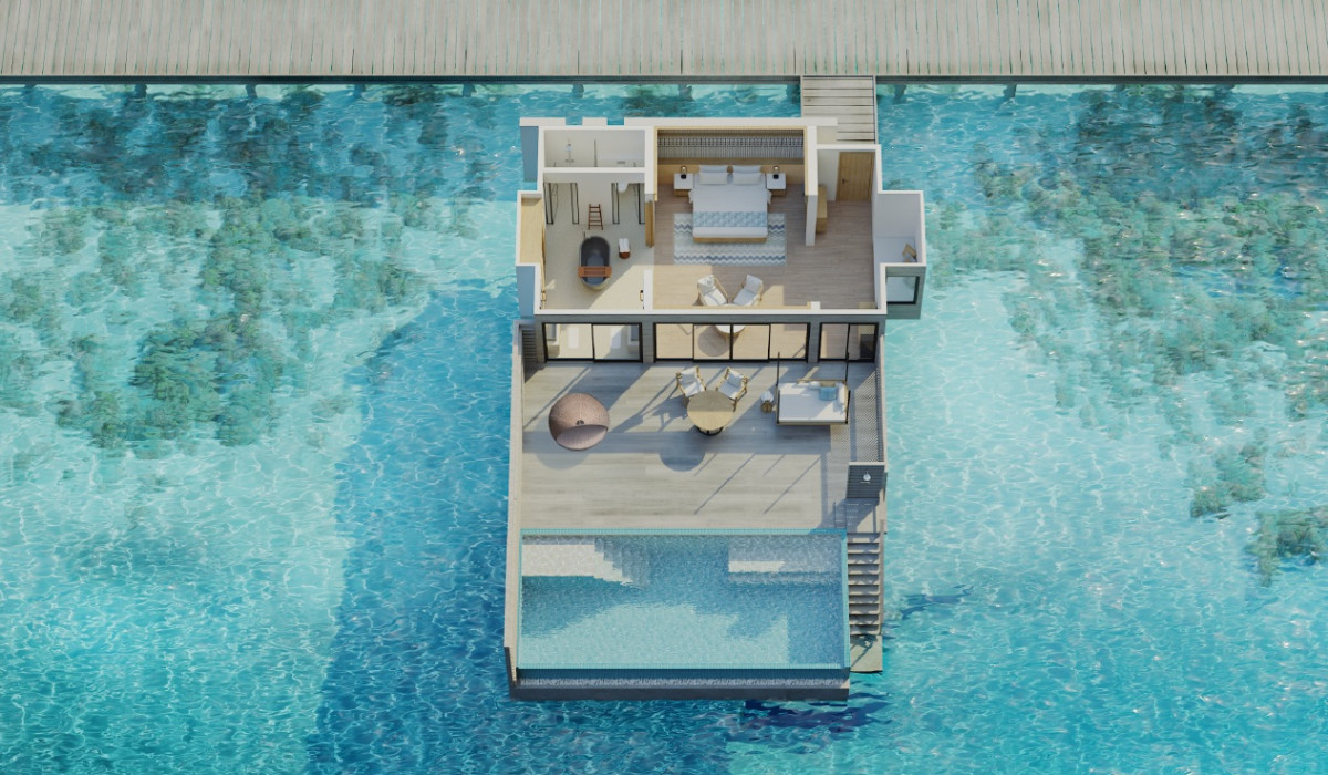 Priamo nad krištáľovo čistou hladinou sa týči táto priestranná vila (182 m2) s nerušeným výhľadom na oceán a súkromným bazénom. Vychutnajte si ranné lúče slnka na vonkajšej terase, uvelebte sa v pohodlnej hojdačke alebo sa osviežte v nádhernom nekonečnom bazéne. Elegantný interiér poskytuje intímne zázemie a špičkové vybavenie na pozadí okúzľujúcej lagúny. Maximálna kapacita: 3 dospelí alebo 2 dospelí a 2 deti.
