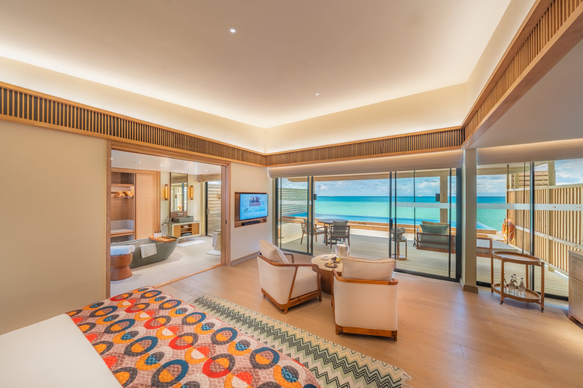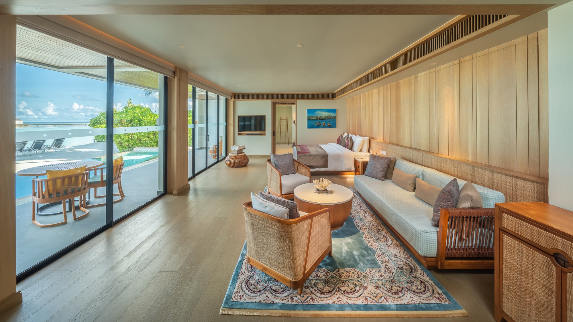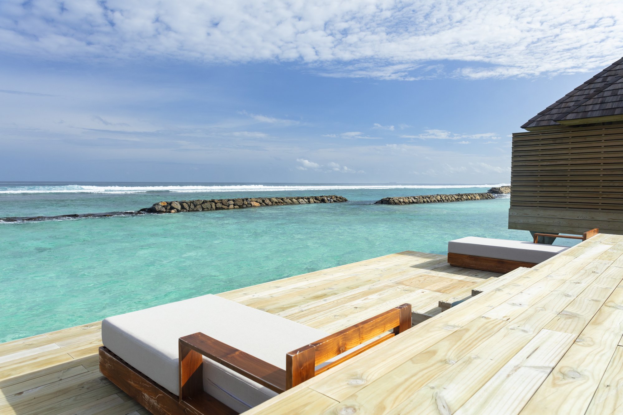 Priamo nad krištáľovo čistou hladinou sa týči táto priestranná vila (182 m2) s nerušeným výhľadom na oceán a súkromným bazénom. Vychutnajte si ranné lúče slnka na vonkajšej terase, uvelebte sa v pohodlnej hojdačke alebo sa osviežte v nádhernom nekonečnom bazéne. Elegantný interiér poskytuje intímne zázemie a špičkové vybavenie na pozadí okúzľujúcej lagúny. Maximálna kapacita: 3 dospelí alebo 2 dospelí a 2 deti.
