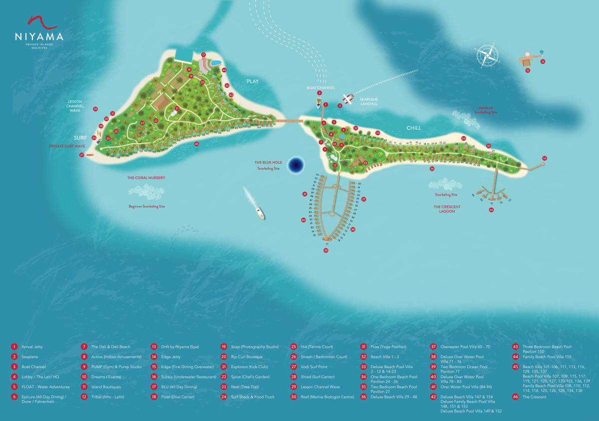 Hotel ponúka 134 prepychovo vybavených víl a pavilónov, ktoré sú rozosiate po pláži a nad tyrkysovou lagúnou. Vybrať si môžete hneď z dvoch ostrovov - Play a Chill. Pokiaľ hľadáte hlavne zábavu, cestujete s deťmi a chcete svoj pobyt tráviť aktívne, zvoľte štýlovú plážovú vilu na ostrove Play. Ak túžite predovšetkým po pokoji a odpočinku, bude pre vás ideálna elegantná vila stojaca nad vodou na ostrove Chill v blízkosti kúpeľov Drift Spa. Už ste niekedy večerali na morskej hladine, pod vodou alebo v korunách stromov? Deväť špičkových reštaurácií a barov na neobyčajných miestach obohatí váš pobyt o nevšedné kulinárske zážitky.