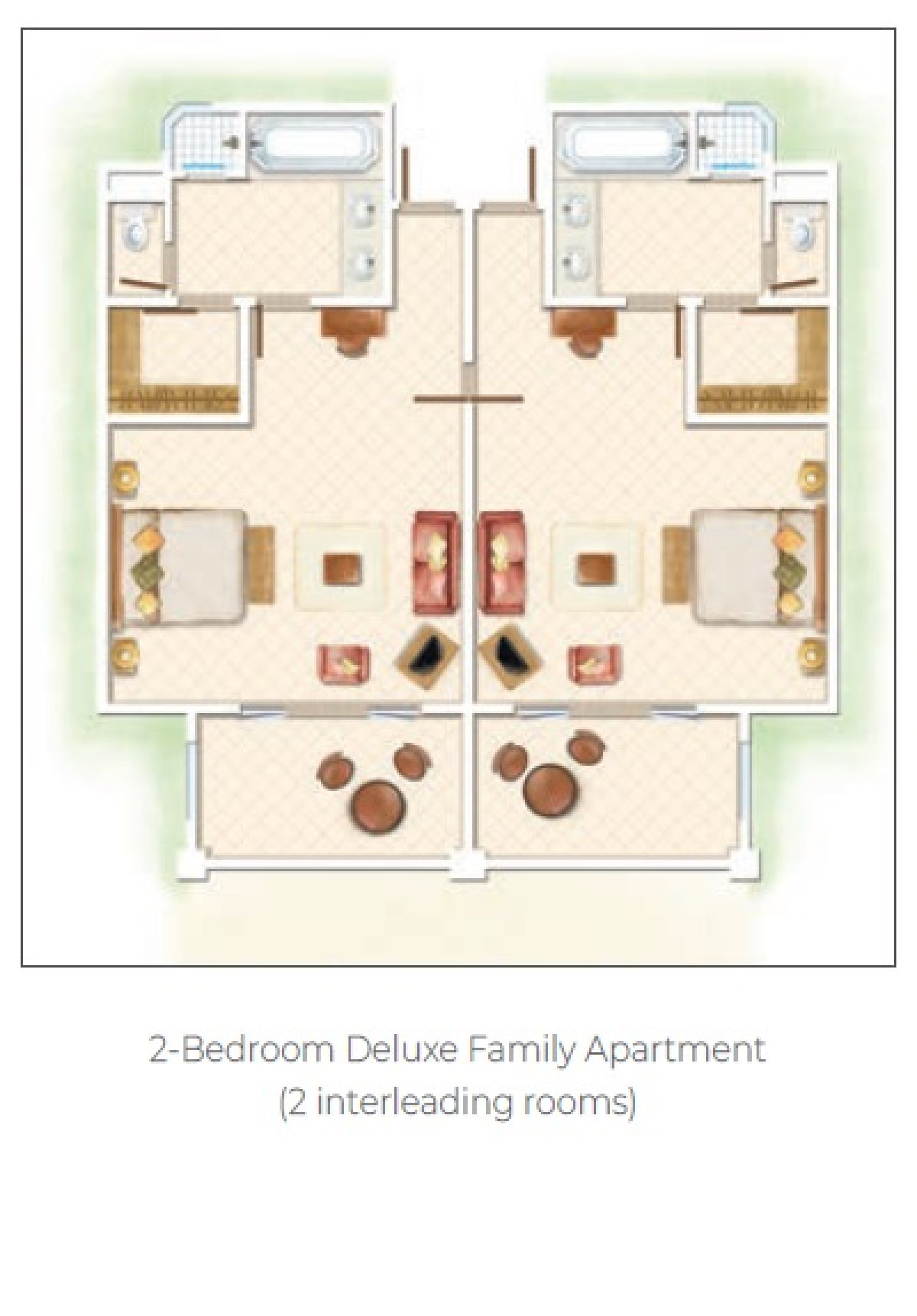 Boli navrhnuté tak, aby vyhovoval väčším rodinám, ktoré chcú spoločne stráviť dovolenku. Luxusné rodinné apartmány sa nachádzajú na prvom poschodí a ponúkajú kapacitu 2 dospelí + 4 deti. Apartmány zahŕňajú dve spálne, obývací priestor na oddych a vlastnú kúpeľňu s vaňou, samostatným sprchovacím kútom, dvoma umývadlami, šatníkom a oddelenou toaletou. Obe izby tiež ponúkajú oddelené balkóny na relaxáciu. Kapacita izby. max. 2 dospelí a 4 deti.