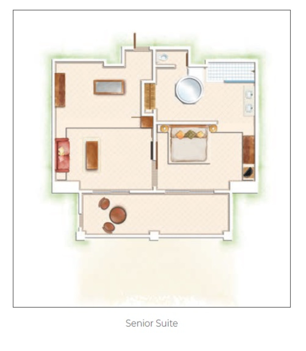 Senior apartmány (110 m²) sú ideálnym miestom pre mladé páry na medových týždňoch. Ponúkajú priamy výhľad na more a priestranné izby s elegantnou drevenou podlahou. Nachádzajú sa na 1. poschodí. Kapacita izby: max. 2 osoby.