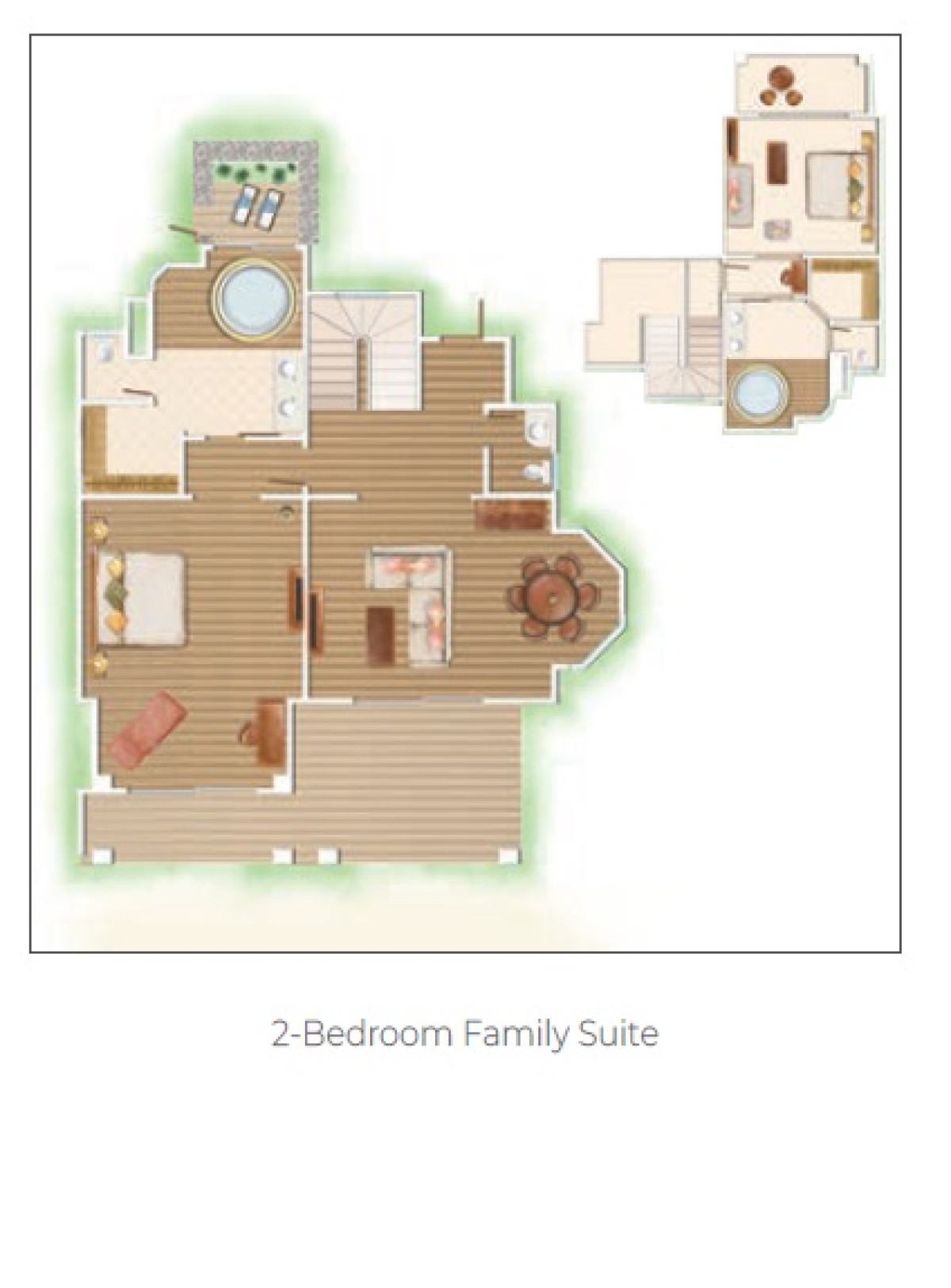 Nachádzajú sa na špičke polostrova a disponujú skvelou polohou priamo pri pláži. Ponúkajú dostatok priestoru s prízemím pre rodičov a horným poschodím, ktoré je určené deťom. Rodinné suity majú vyhradený vstup, priamy vstup na pláž a súkromné zabezpečené záhrady vybavené pieskoviskami pre deti. Kapacita izby: max. 2 dospelí a 3 deti.