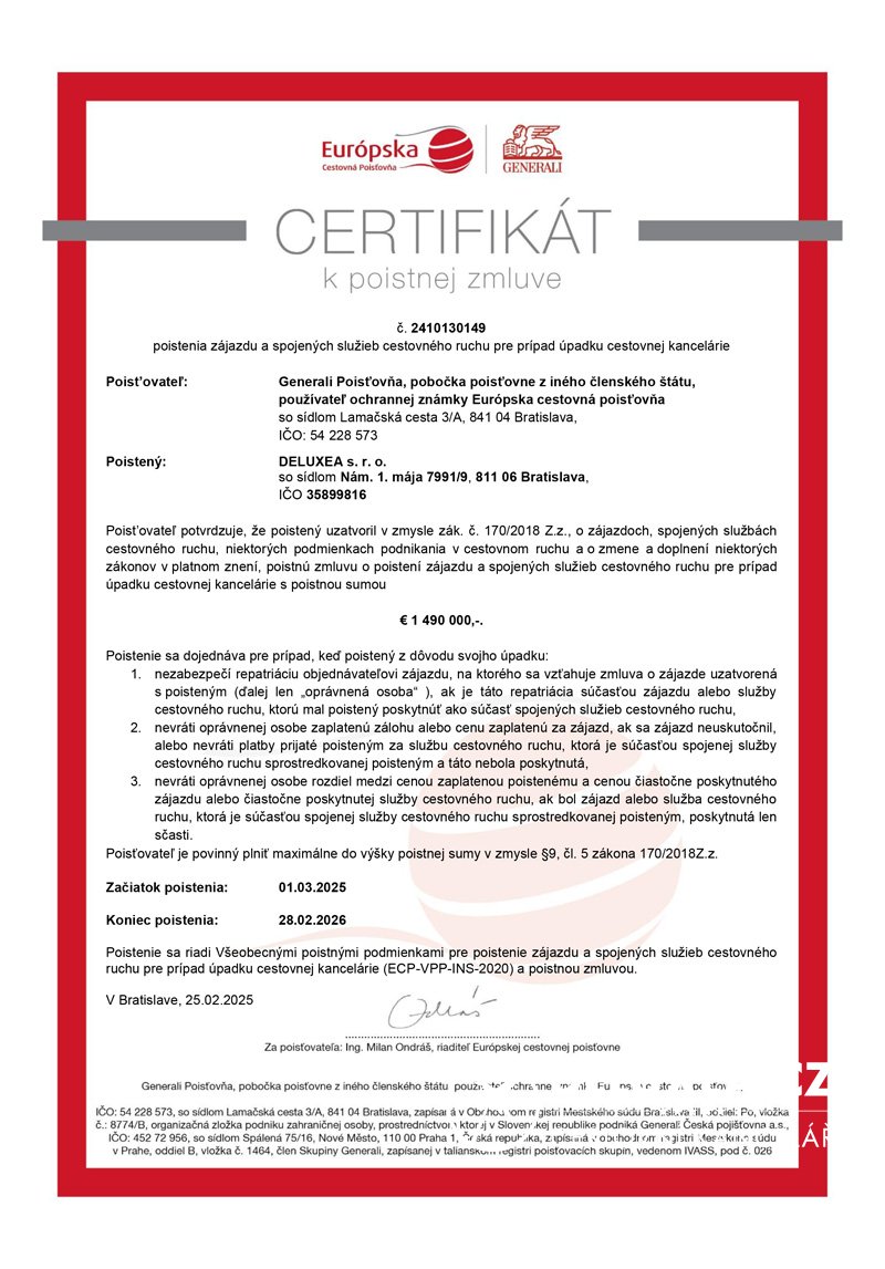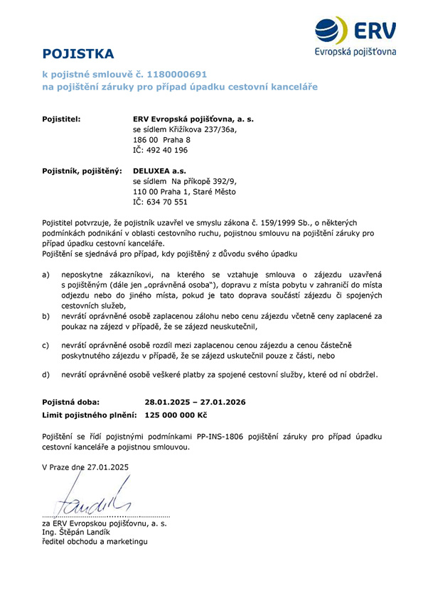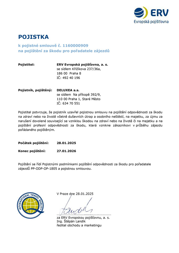Pre istotu vás našich klientov je cestovná kancelária Deluxea a.s. zo zákona poistená pre prípad úpadku v ERC Európska poisťovňa, a. s. Limit poistného plnenia má DELUXEA nastavený extrémne vysoko na 125 000 000 Kč v ČR s platnosťou do 27.01.2026 a 1 490 000 EUR v SR s platnosťou do 01.03.2026 . Ďalej máme uzavretú aj veľmi nadštandardnú poistku zodpovednosti za škodu usporiadateľa zájazdov.
