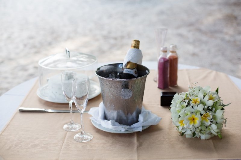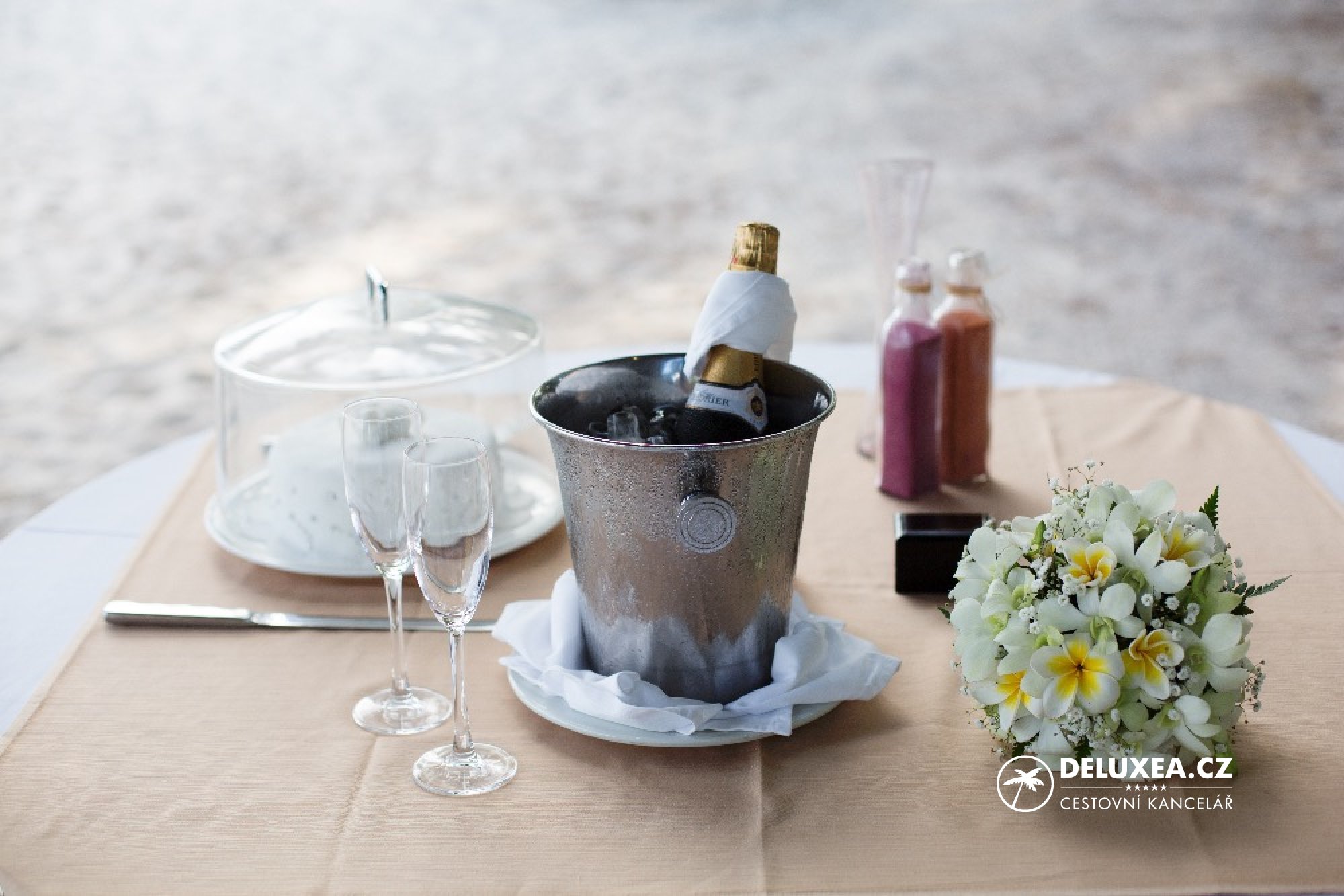 Obrad je zakončený prípitkom, nasledovať môže fotenie na pláži pri západe slnka. Samozrejmosťou je romantická večera pri sviečkach.