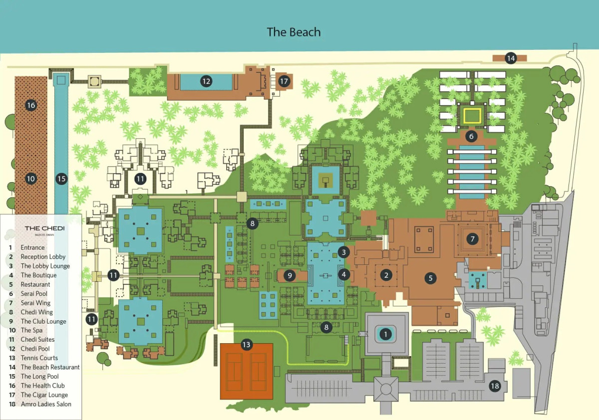 Hotel The Chedi Muscat sa nachádza uprostred elegantne upravenej tropickej záhrady s malebnými jazierkami, na mieste, kde sa majestátne pohorie Al Hadžar zrkadlí v pokojných vodách Ománskeho zálivu. Tento päťhviezdičkový luxusný rezort v meste Maskat bol otvorený v roku 2003 ako prvý moderný plážový hotel v Ománe. Okrem 370 metrov dlhej súkromnej pláže ponúka hotel The Chedi Muscat hosťom výber z troch bazénov a špičkové služby vrátane exkluzívnych kúpeľov, posilňovne a tenisových kurtov.