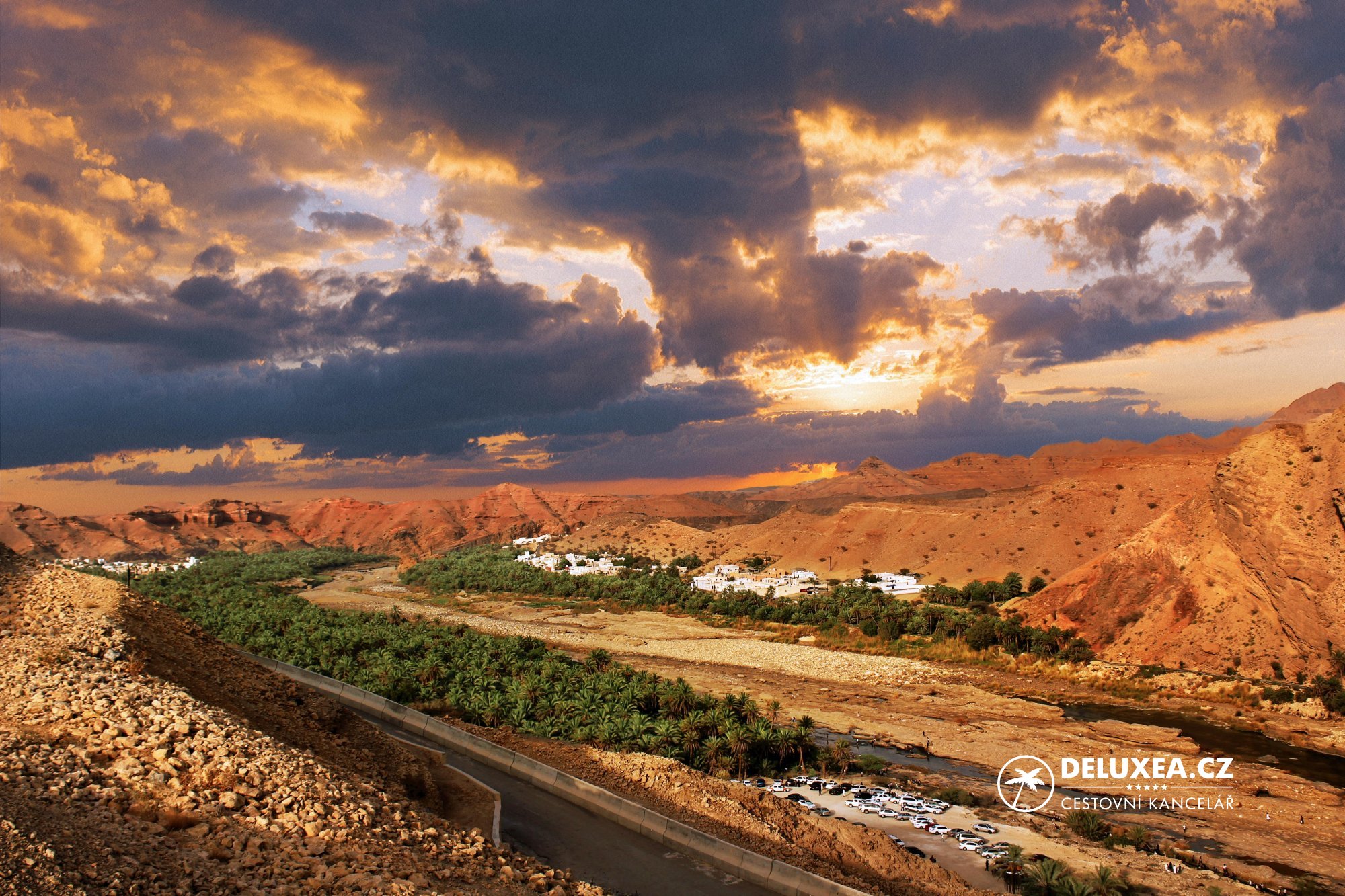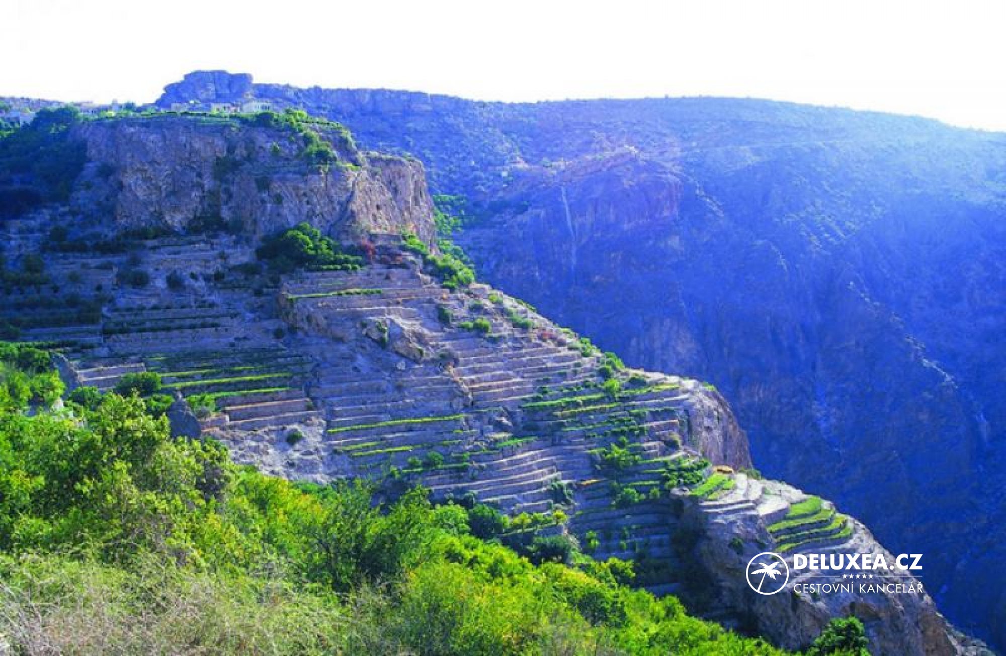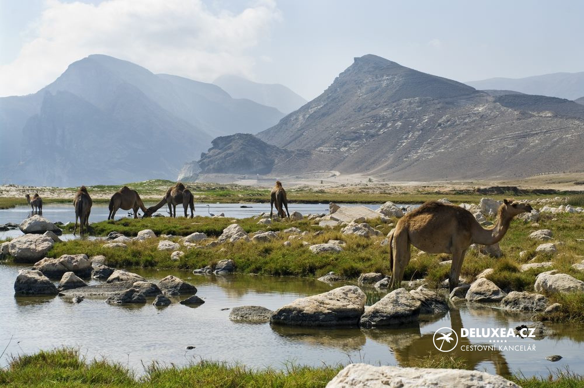 Jebel Akhdar: zelená hora – Vádí, náhorné plošiny, vrcholky a terasovité svahy spoločne s príjemnými nižšími teplotami a vyššími úhrnami zrážok v okolí Jebel Akhdar sú v rámci Ománu unikátne a dávajú regiónu inú tvár ako vo zvyšku krajiny. Cestu začnete stúpaním do dediny Birkaz Al Mauz s plantážami banánov, horskými jazierkami, starými domčekmi a mešitou zo 17. storočia. Dedina je bránou do vádí Madaeen. Po asfaltovej ceste dorazíte na náhornú plošinu Saiq – rozsiahlu vyvýšeninu v nadmorskej výške 2000 m. Náhorná plošina bola obývaná a obrábaná po mnoho rokov, avšak jej prostredie pôsobí nedotknuto z hľadiska civilizácie. Hore je mnoho zaujímavých miest ako vádí Bani Habib s opustenými domami a s kultivovanou pôdou s rastúcim cesnakom a stromami s granátovými jablkami. Za návštevu stojí aj dedina Al Ayn s možnosťou prechádzky medzi tradičnými domami v horskom svahu s pekným výhľadom. Následne sa vydáte na horu Jebel Akhdar s dostatkom zelene a skalnatého terénu. Obed v miestnej reštaurácii alebo piknikový balíček. Púšť Wahiba Sands – Výlet do púšte Wahiba (alebo Sharqiya) je skvelým spôsobom, ako spoznať arabské púštne prostredie. Ružovkasté, vetrom opracovávané a premenlivé duny sú tiež domovom beduínskych rodín, ktoré v týchto drsných podmienkach stále žijú tradičným nomádskym spôsobom a chovajú zvieratá. V programe je návšteva jednej takej rodiny. Rozhodnúť sa ďalej môžete pre prechádzku v dunách vo vozidle s pohonom 4x4 a skúseným vodičom. K dispozícii je možnosť prenocovania v jednom zo skvele vybavených púštnych kempov s tým, že budete môcť pozorovať čarovný západ slnka a zažiť jazdu na ťave.