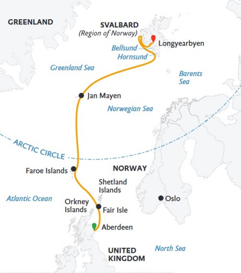 Expedíciu Artic Saga: Exploring Spitsbergen via the Faroes and Jan Mayen zahájite odletom zo škótskeho mesta Aberdeen a navštívite počas nej hneď štyri vzdialené arktické ostrovy s jedinečnou ľadovou atmosférou a zvieracími obyvateľmi. V priebehu tejto 14 dennej plavby (na lodi Ocean Adventurer) sa budete plaviť severným Atlantikom a zastavíte sa na ostrove Fair Isle, ktorý je domovom svetoznámeho vtáčieho observatória. Po návšteve Fair Isle vás čakajú dva dni skúmania jednotlivých ostrovčekov, ktoré tvoria Faerské ostrovy a ktoré obývali bájni Vikingovia. Počas plavby zavítate aj na najsevernejšie umiestnený sopečný ostov Jan Mayen. Celá plavba je zakončená prehliadkou ostrova Západný Špicberg, ktorý je domovom ľadových medveďov.