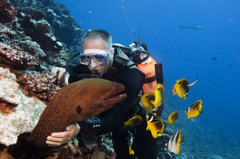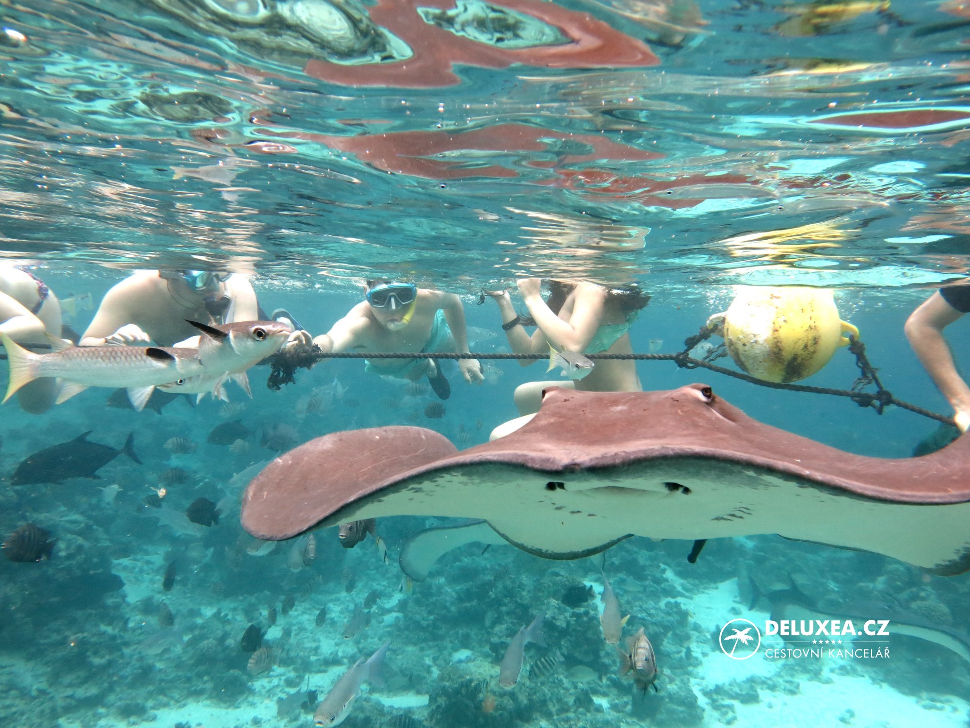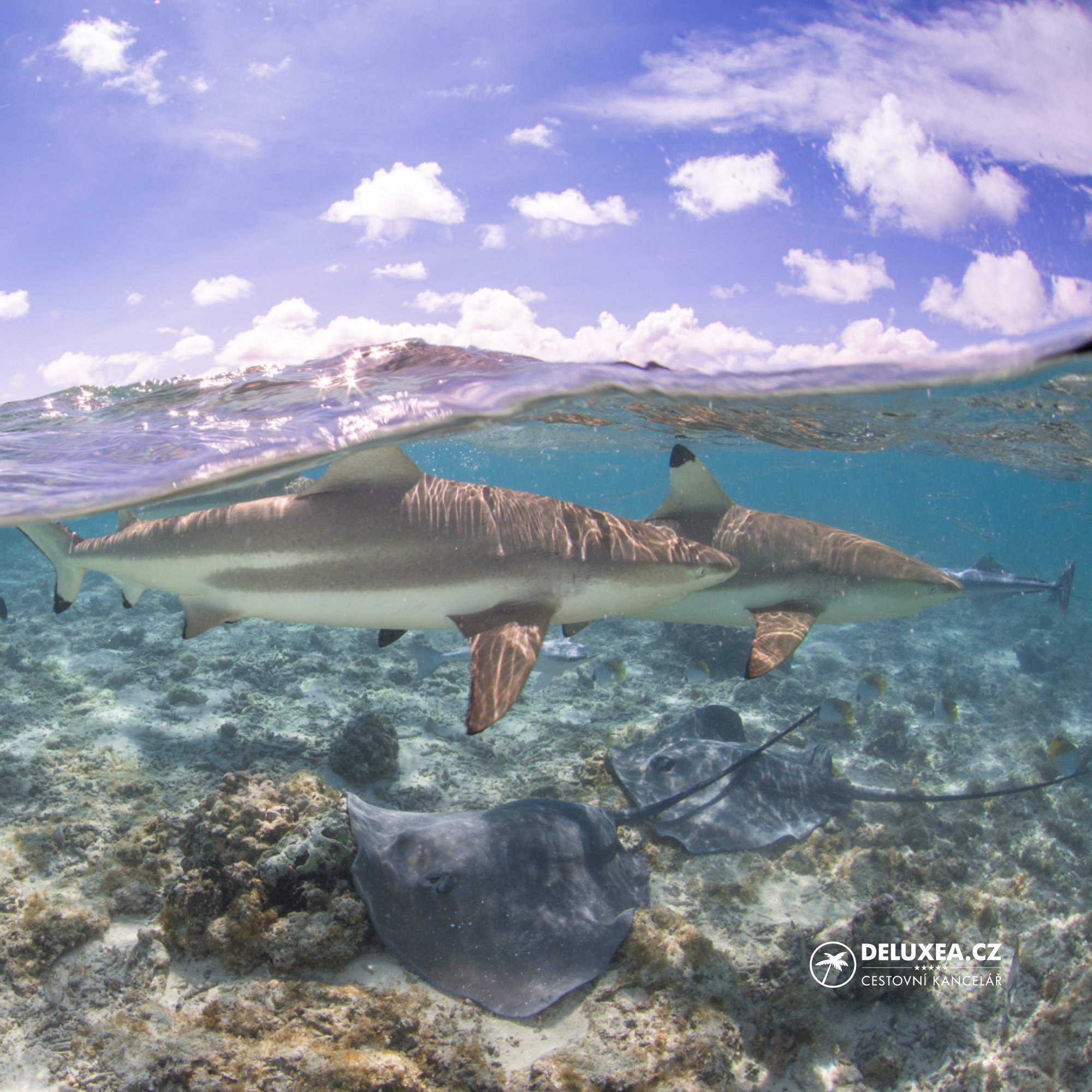 • Pozorovanie žralokov a rají s polynézskym motu piknikom – celý deň