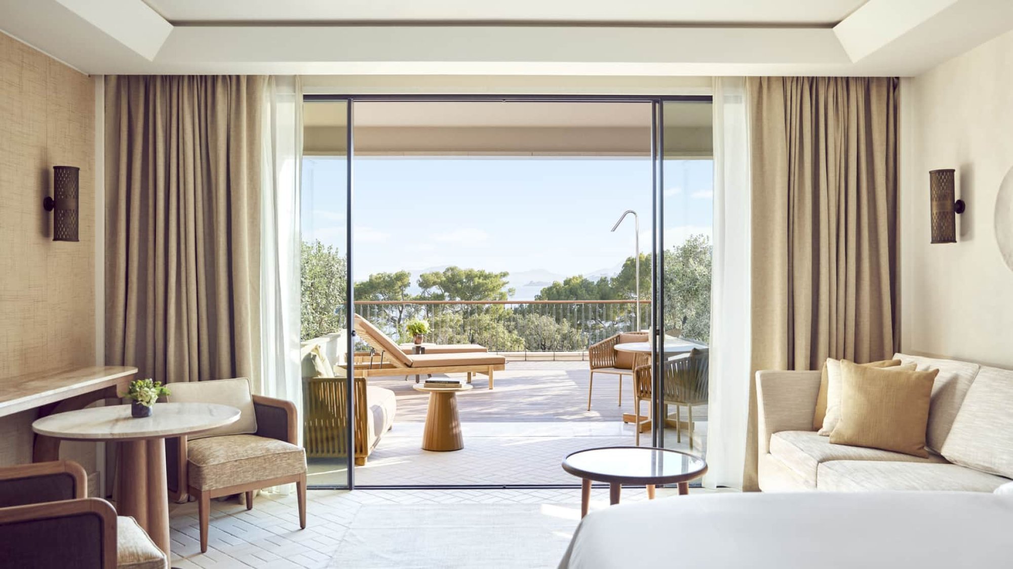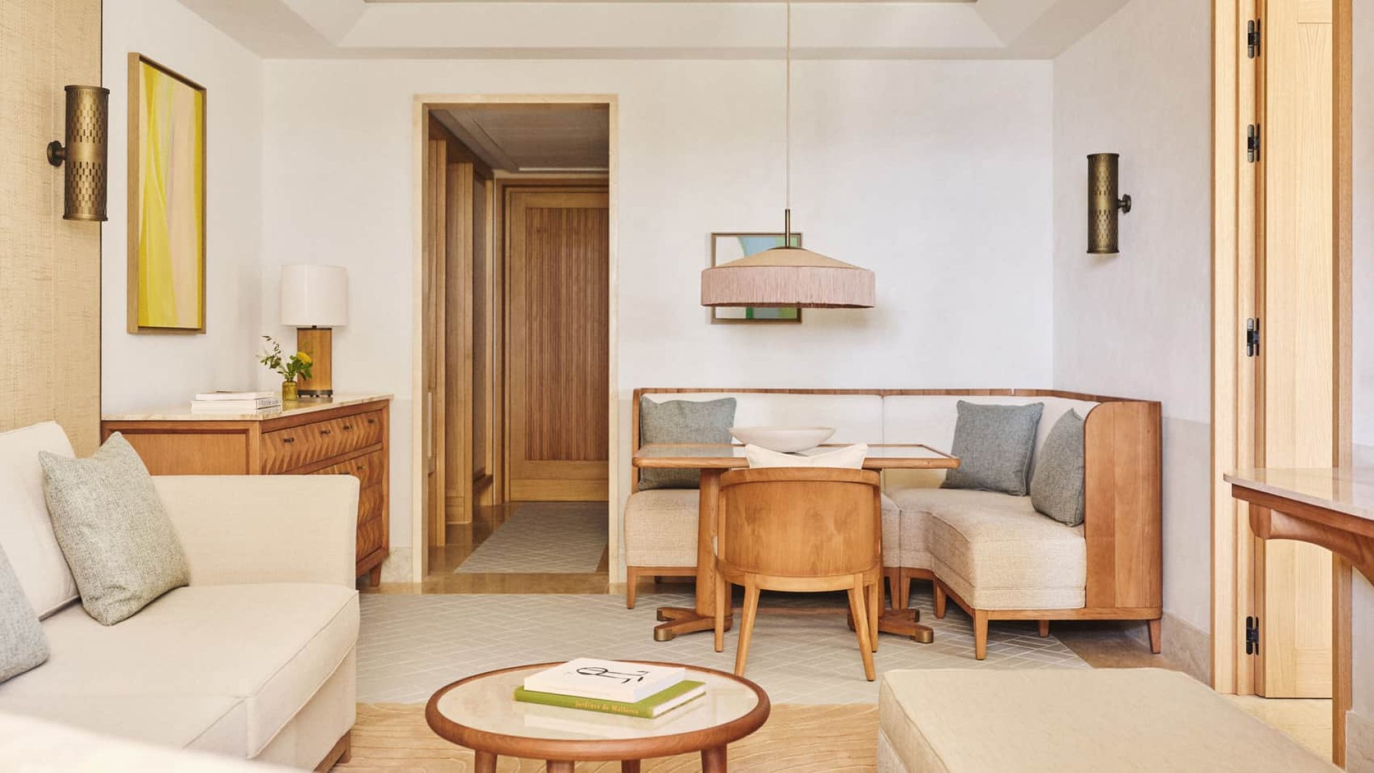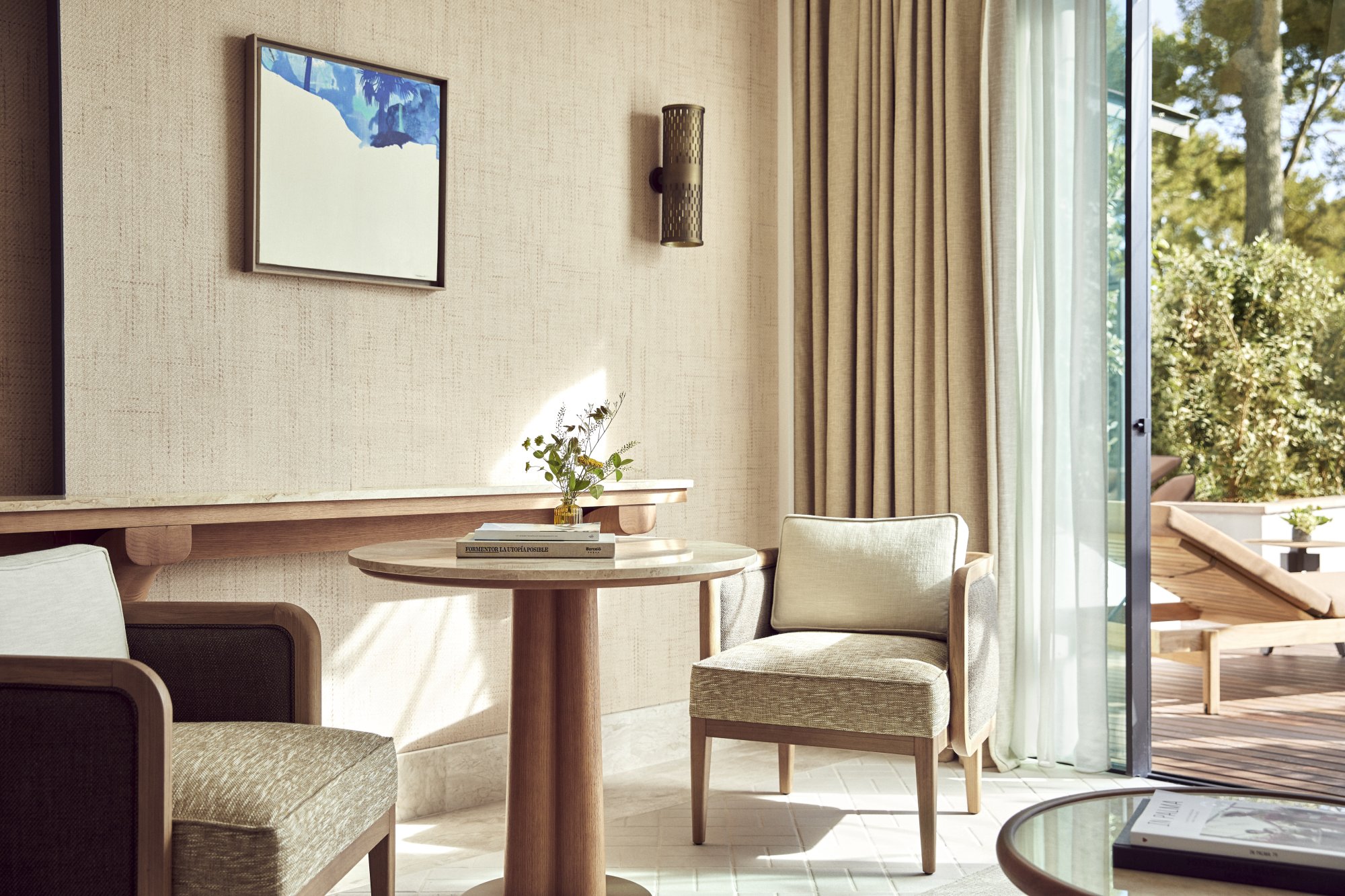 Dominantou interiéru je prostorný obývací pokoj s jídelním stolem pro čtyři osoby, plynule propojený s mimořádně prostornou terasou vybavenou lehátkem, pohodlnými křesly a dalším jídelním stolem pro čtyři. Součástí je plně vybavená koupelna se dvěma umyvadly, vanou a samostatným sprchovým koutem, doplněná o oddělenou koupelnu pro hosty se sprchou. Velkoformátová okna od podlahy ke stropu zajišťují maximální přirozené světlo a propojují interiér s okolní scenérií. Mezi nadstandardní benefity patří zpáteční doprava z letiště, soukromá cabana u bazénu, přední řada lehátek na pláži a také nealkoholické nápoje a drobné občerstvení zdarma z privátního baru. Z pokoje se otevírá panoramatický výhled na moře, který podtrhuje jeho vzdušný a elegantní charakter. Kapacita: 3 dospělí a 1 dítě nebo 2 dospělí a 2 děti.