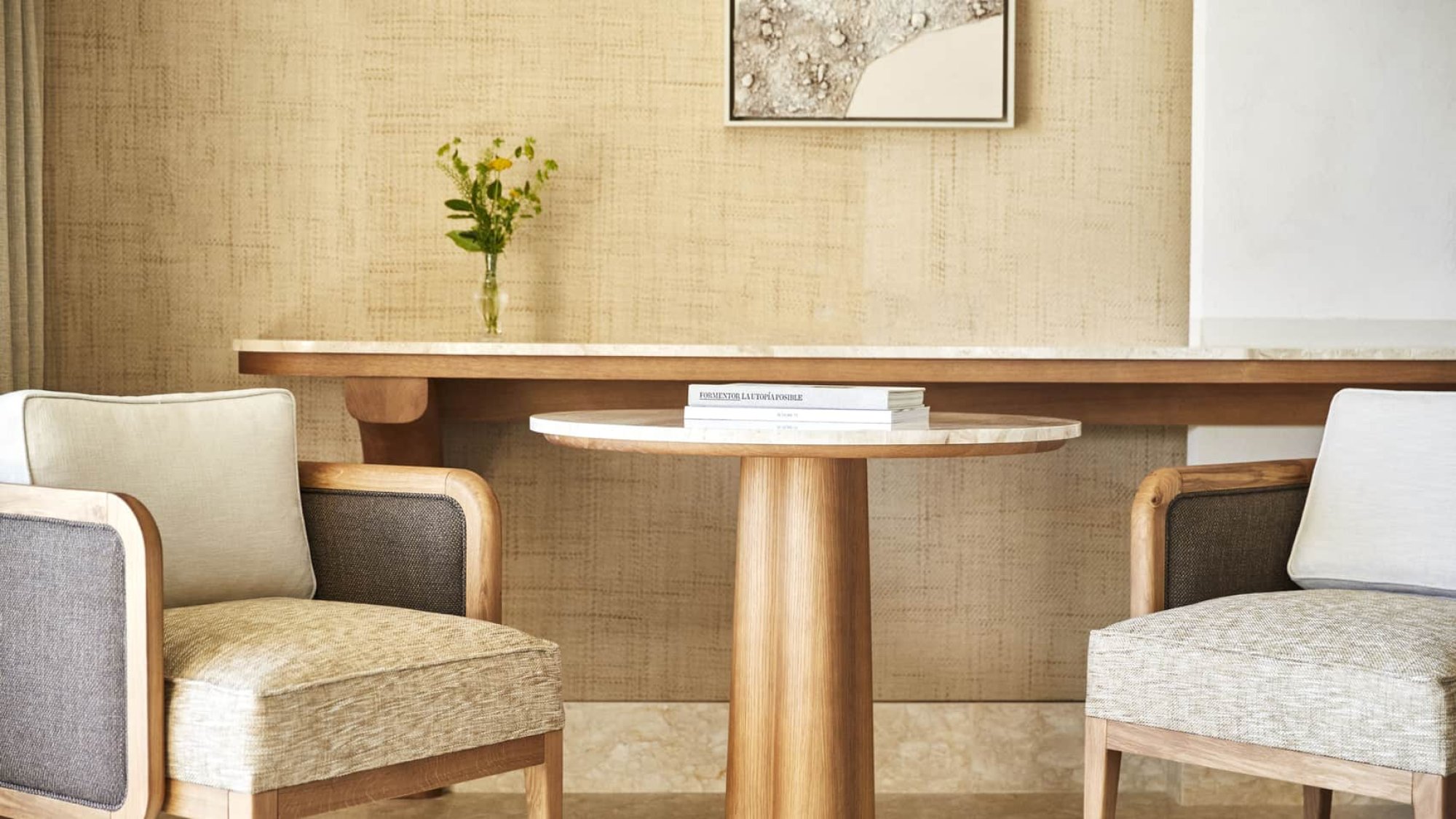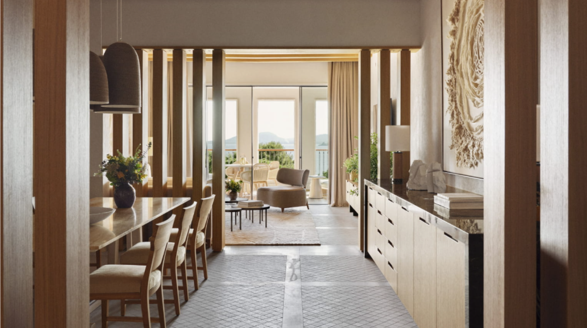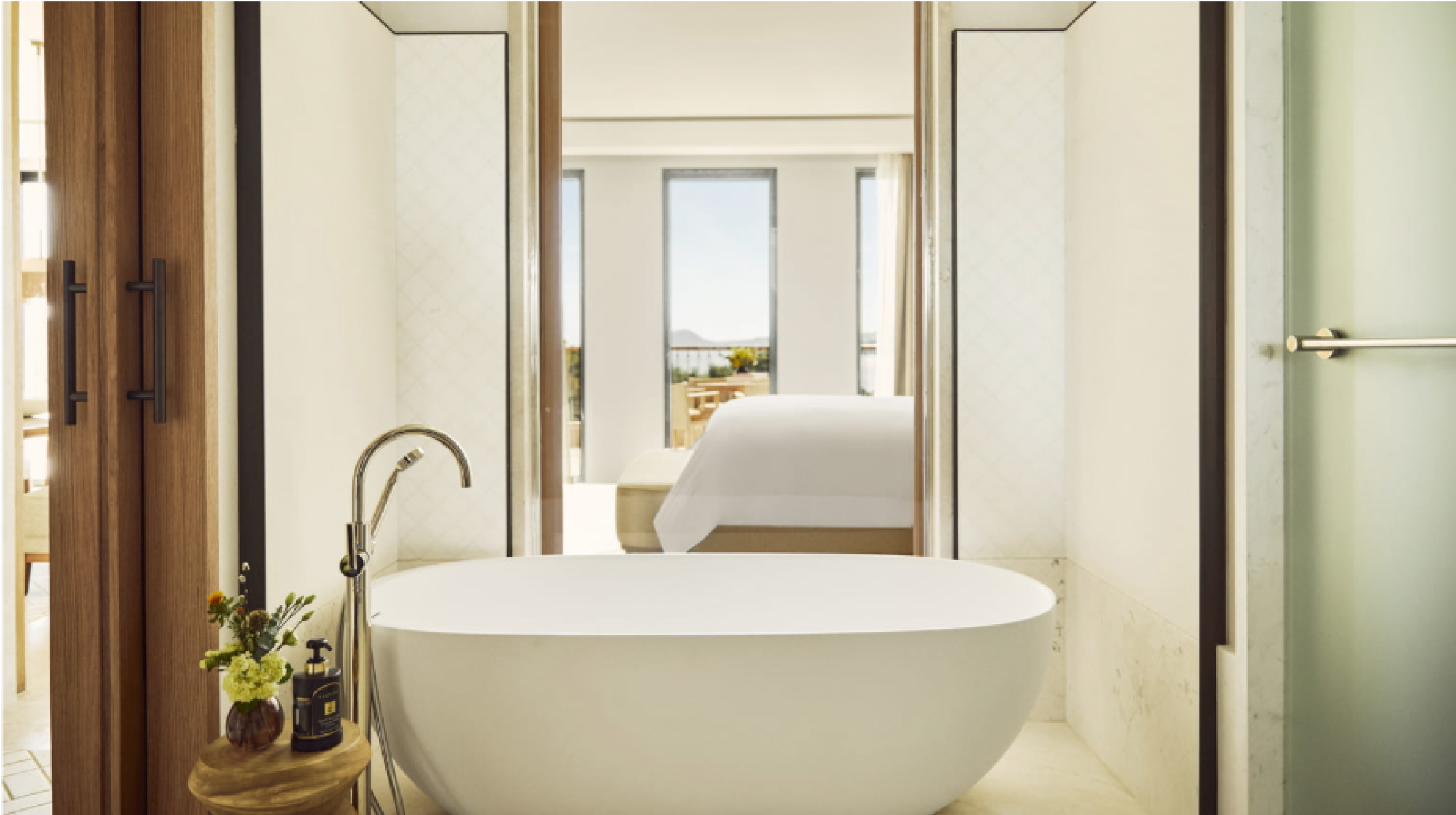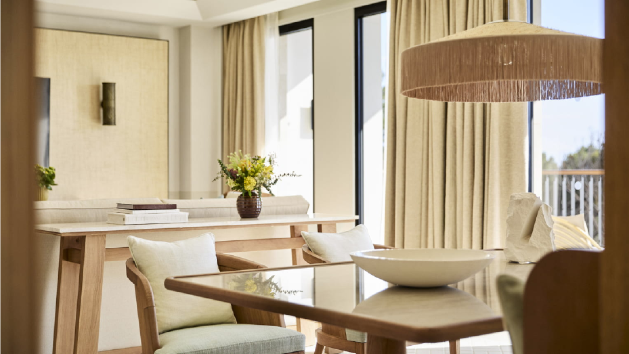 Dominantou interiéru je prostorný obývací pokoj s jídelním stolem pro čtyři osoby, plynule propojený s mimořádně prostornou terasou vybavenou lehátkem, pohodlnými křesly a dalším jídelním stolem pro čtyři. Součástí je plně vybavená koupelna se dvěma umyvadly, vanou a samostatným sprchovým koutem, doplněná o oddělenou koupelnu pro hosty se sprchou. Velkoformátová okna od podlahy ke stropu zajišťují maximální přirozené světlo a propojují interiér s okolní scenérií. Mezi nadstandardní benefity patří zpáteční doprava z letiště, soukromá cabana u bazénu, přední řada lehátek na pláži a také nealkoholické nápoje a drobné občerstvení zdarma z privátního baru. Z pokoje se otevírá panoramatický výhled na moře, který podtrhuje jeho vzdušný a elegantní charakter. Kapacita: 3 dospělí a 1 dítě nebo 2 dospělí a 2 děti.