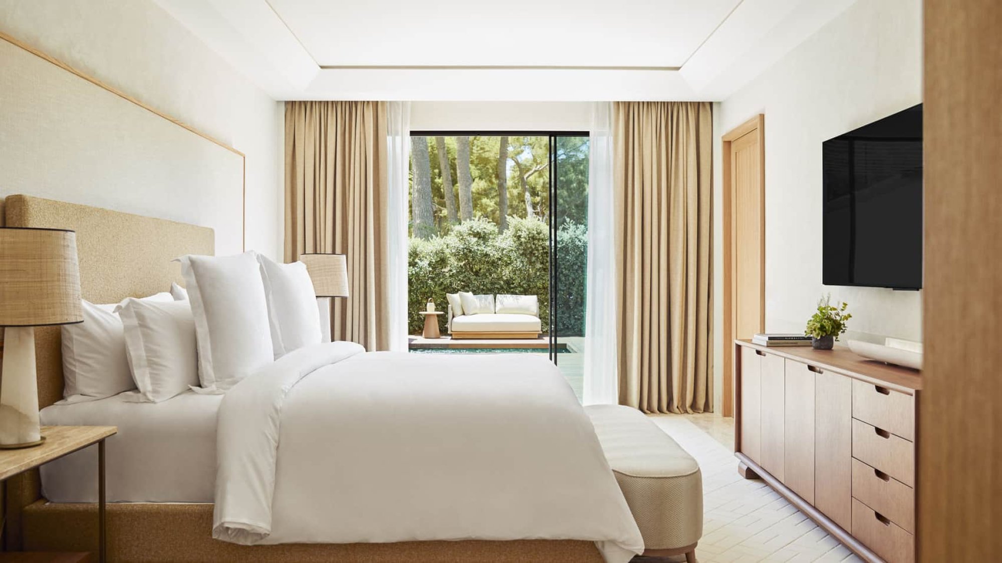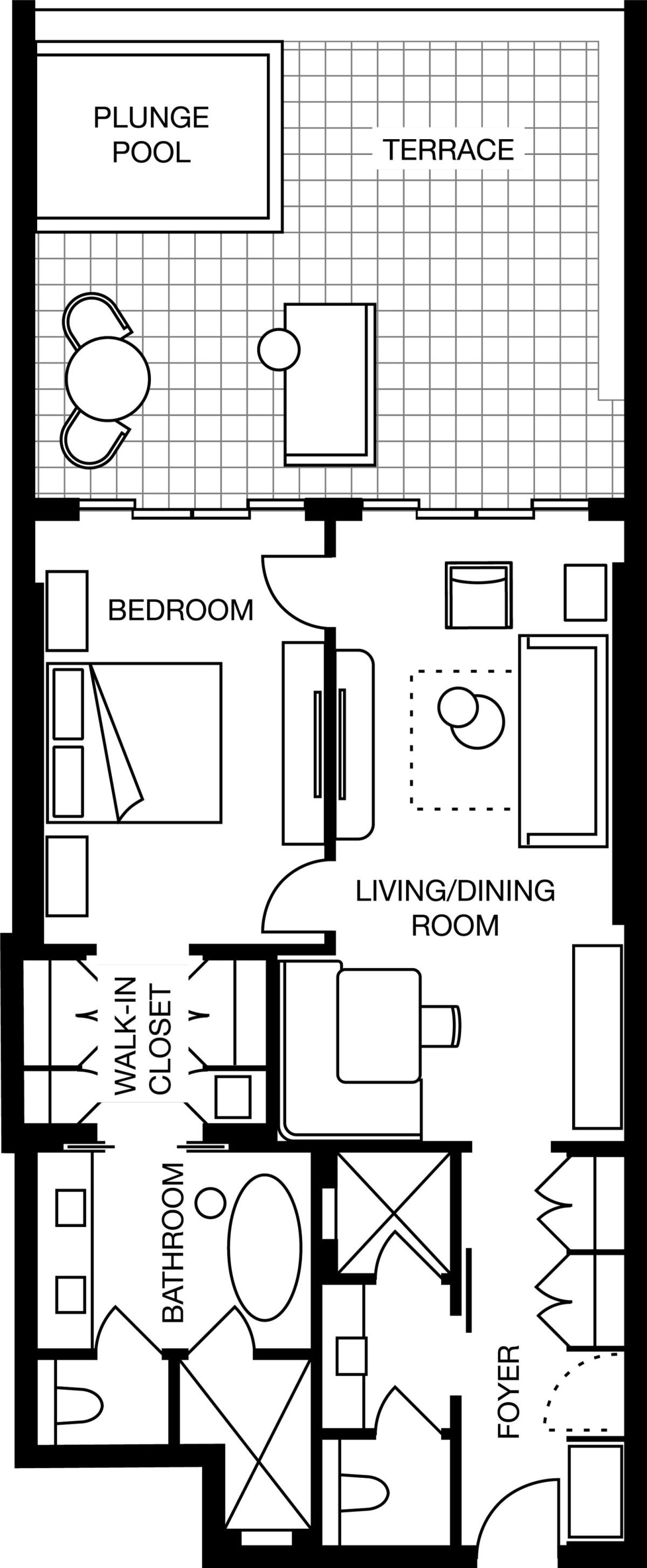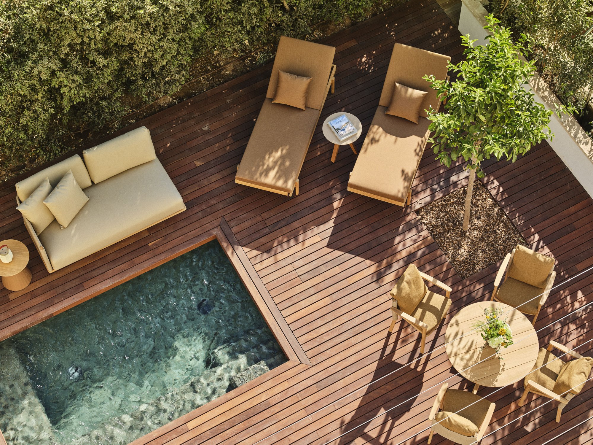 Pokoj nabízí jednu manželskou king-size postel nebo dvě dvoulůžka, rozkládací pohovku a na vyžádání dětskou postýlku. Má rozlohu 49 m² a nachází se v 1. a 2. patře. Součástí je plně vybavená koupelna s vanou a samostatným sprchovým koutem. Z pokoje se otevírá výhled do zahrad. Mezi unikátní prvky patří soukromý bazének (plunge pool), rozšířená terasa vybavená lehátkem, pohodlnými křesly, slunečníky a jídelním stolem pro dvě osoby, přímý vstup do zahrad a k bazénům, velkoformátová okna od podlahy ke stropu a psací nebo jídelní stůl pro dvě osoby, které dohromady vytvářejí komfortní a propojený vnitřně-venkovní prostor. Kapacita: 3 dospělí nebo 2 dospělí a 1 dítě.