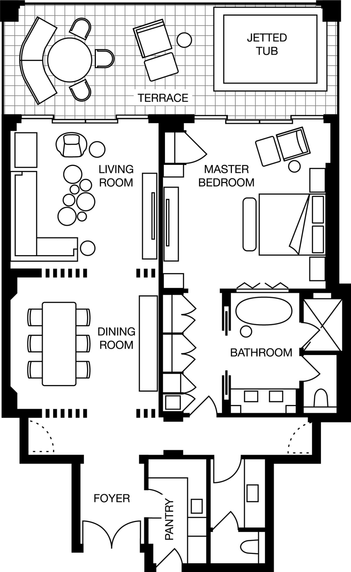 Toto ubytování v přízemí má jednu manželskou king-size postel, rozkládací pohovku a na vyžádání dětskou postýlku. Dominantou je prostorný obývací pokoj s jídelním stolem pro čtyři osoby, plynule navazující na prodlouženou, dvojitou terasu vybavenou lehátkem, pohodlnými křesly a dalším jídelním stolem pro čtyři. O dokonalý relax se stará soukromý plunge pool a přímý vstup do zahrad i k bazénu. Interiér doplňuje plně vybavená koupelna se dvěma umyvadly, vanou a samostatným sprchovým koutem, spolu s oddělenou koupelnou pro hosty se sprchou. Výhled směřuje do zahrad a velkoformátová okna od podlahy ke stropu propojují vnitřní a venkovní prostor v jeden celek. Tento typ ubytování je k dispozici také ve variantě se dvěma ložnicemi. Kapacita: 3 dospělí nebo 2 dospělí a 1 dítě.