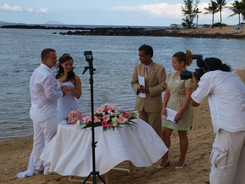 Svadba na Mauríciu prebieha v súlade s miestnymi právnymi predpismi v anglickom jazyku. Ženích a nevesta opakujú po oddávajúcom krátky svadobný sľub. Vzorový text prísahy v angličtine dostanete od našej cestovnej kancelárie. Obrad nie je jazykovo náročný, ale obaja novomanželia musia mať konverzačnú znalosť angličtiny. Môžete využiť  prekladateľa, ktorý ale musí byť zaistený vopred za príplatok alebo ním môže byť niekto zo sprievodu (rodičia, priatelia) a musí pred miestnymi úradmi osvedčiť znalosť oboch jazykov. Sľub zakončí výmena prstienkov a bozk. Manželstvo je spečatené podpismi do úradných kníh. Potom nasleduje prípitok, prípadne krájanie svadobnej torty a fotenie na pláži.