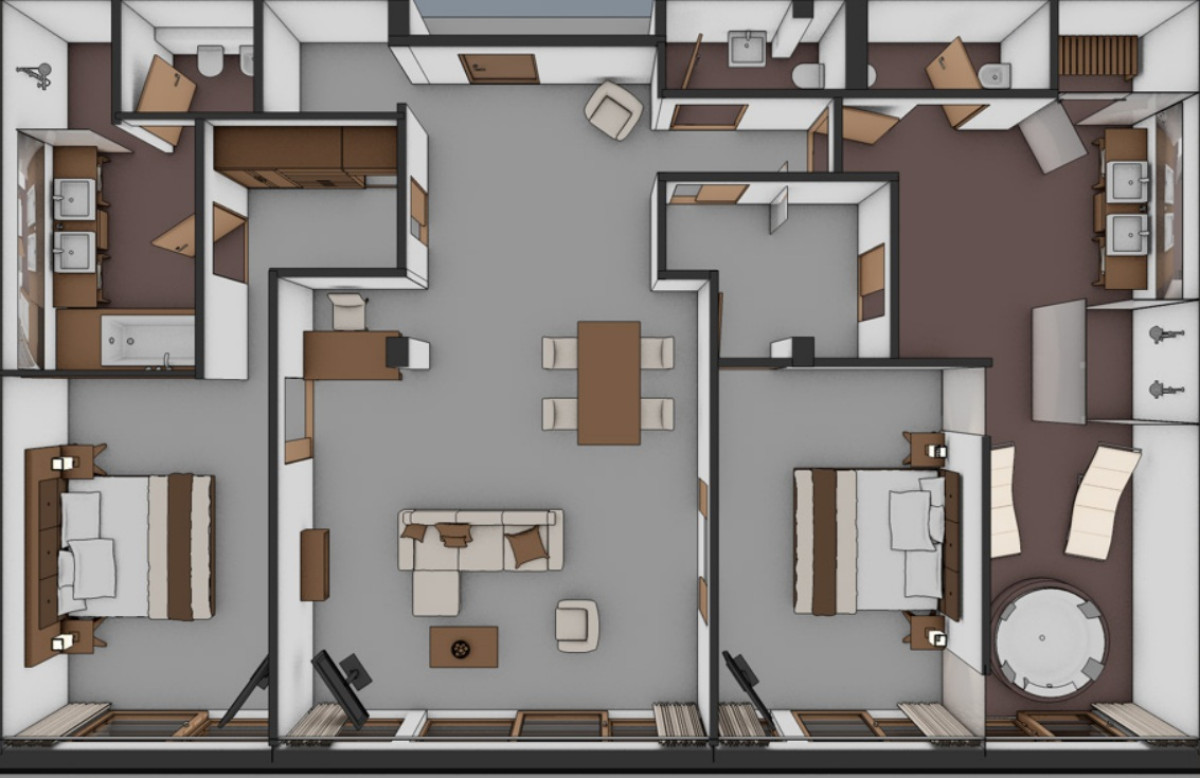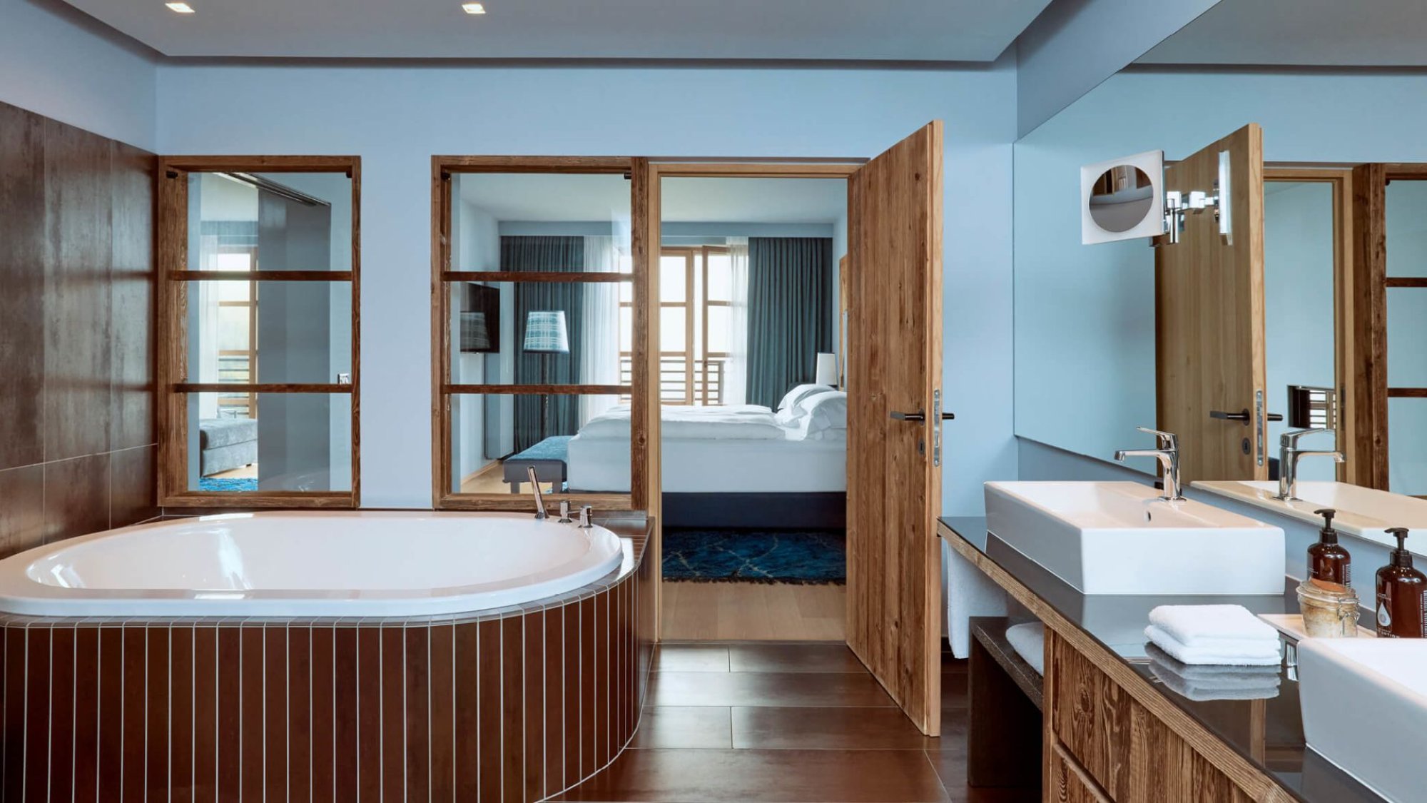 Tento priestranný apartmán (170 m2) predstavuje kombináciu Chalet Room a Alpina Chalet Suite a ponúka ideálne zázemie pre rodiny alebo malé skupinky. Vnútri nájdete dve spálne s manželskou posteľou alebo dvoma samostatnými lôžkami a vlastnou kúpeľňou, priestranné šatníkové skrine, toaletu pre hostí, kuchynku a veľkú obývaciu izbu s jedálenským stolom. Okrem toho sa môžete tešiť na nádherný výhľad na okolité hory. Maximálna kapacita: 4 dospelí.