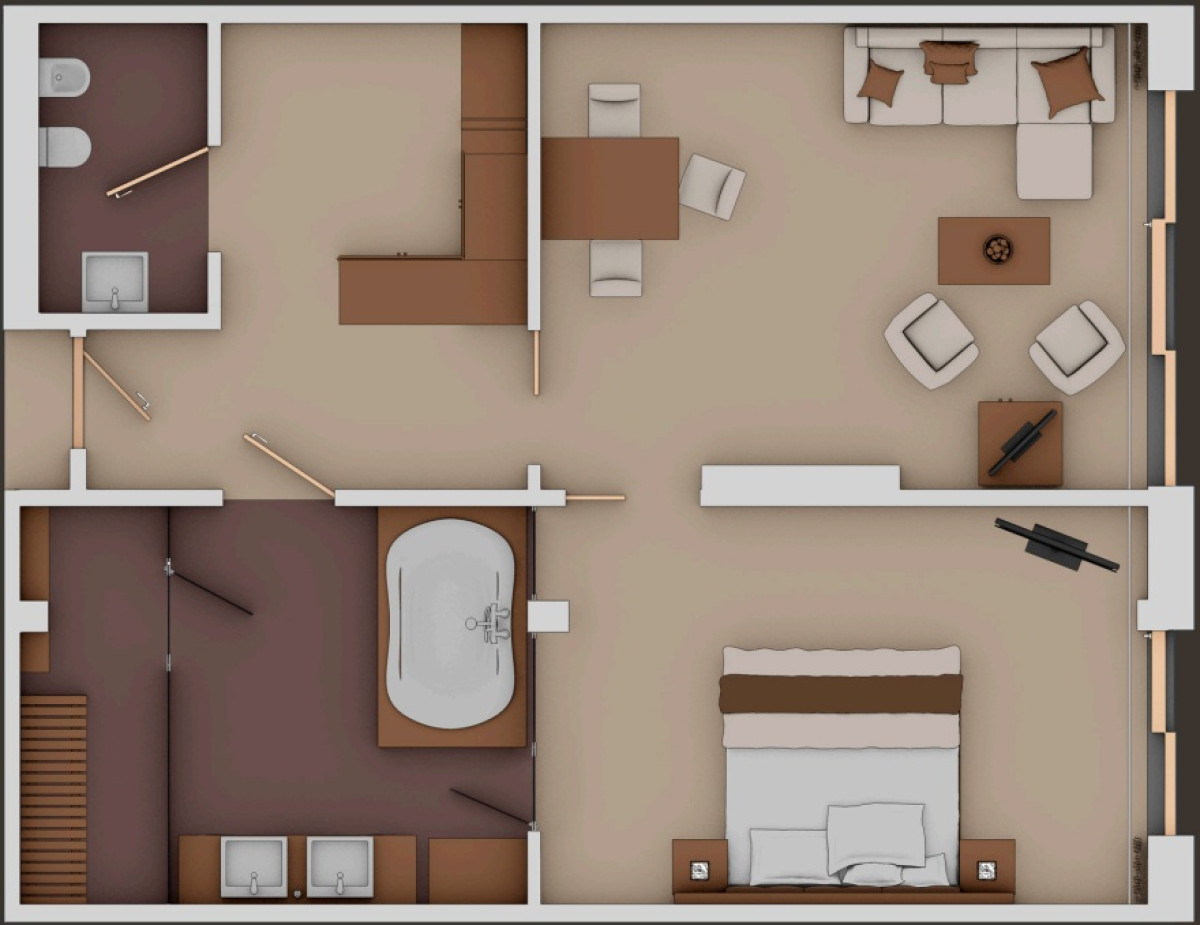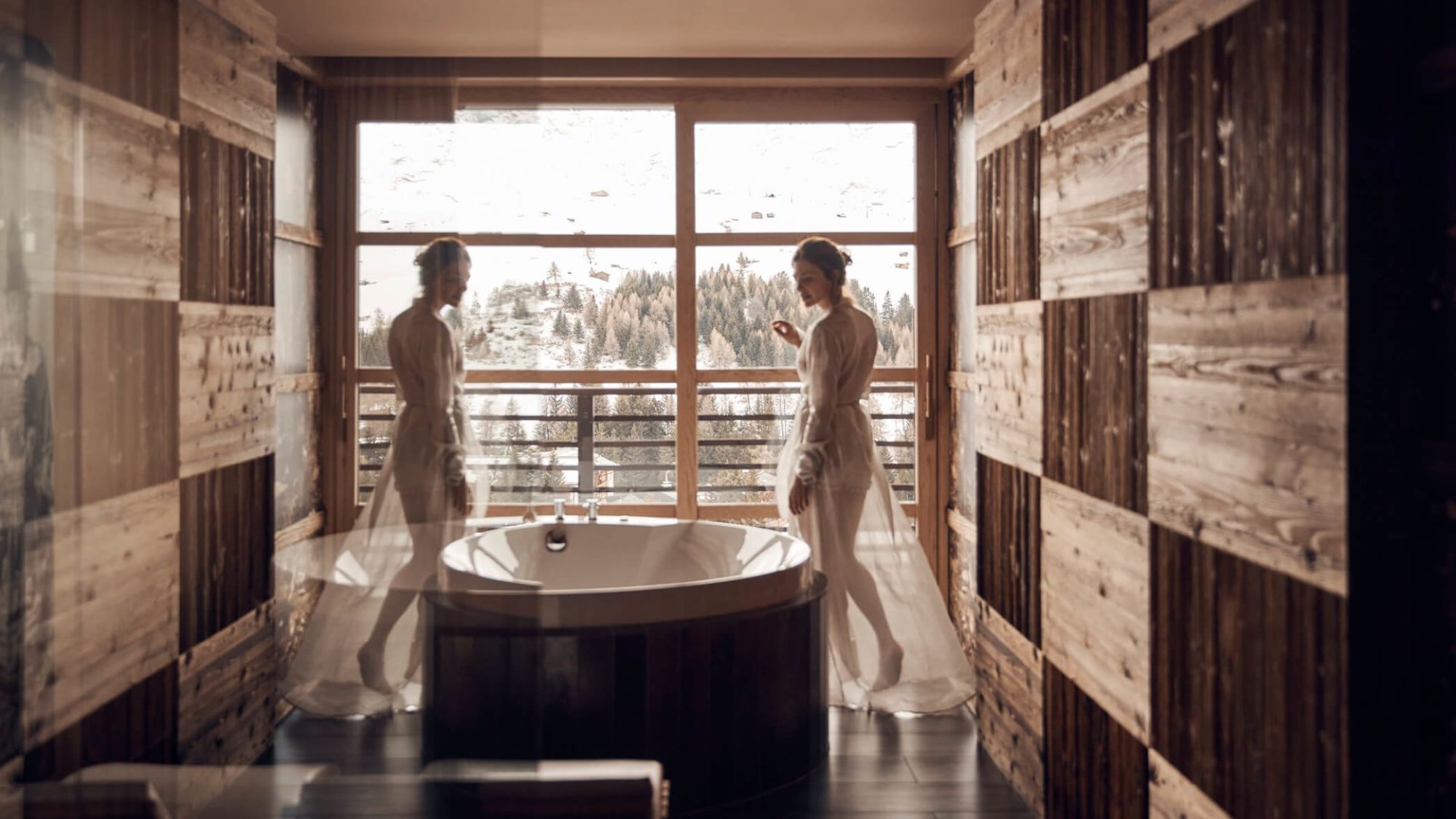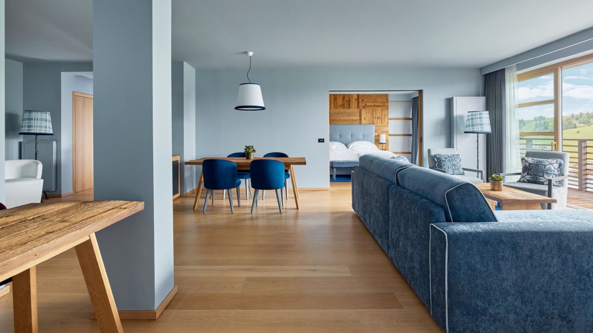 Pre rodiny či väčšie skupiny je k dispozícii tento priestranný apartmán (150 m2), umiestnený v unikátnej kruhovej budove Chalet susediacej s hlavnou budovou hotela. Súčasťou interiéru sú dve spálne s manželskou posteľou alebo dvoma samostatnými lôžkami a vlastnou kúpeľňou vybavenou vaňou aj sprchovacím kútom, priestranné šatníkové skrine, toaleta pre hostí, kuchynka a veľká obývacia izba s jedálenským stolom a ekologickým krbom na bioetanol, ktorý vytvára útulnú atmosféru. Zo súkromnej terasy s posedením sa navyše ponúka nádherný výhľad na Dolomity. Maximálna kapacita: 4 dospelí.