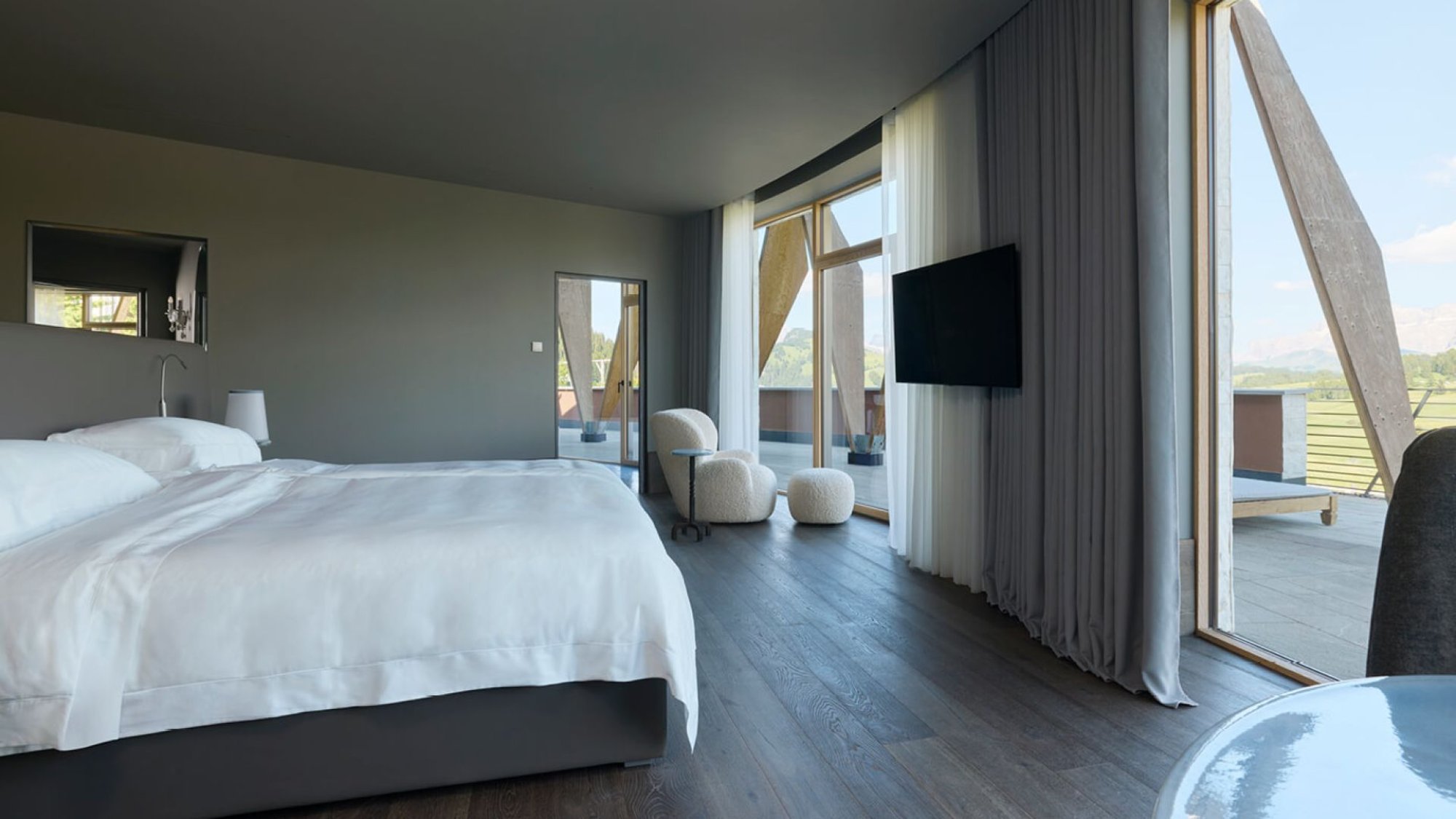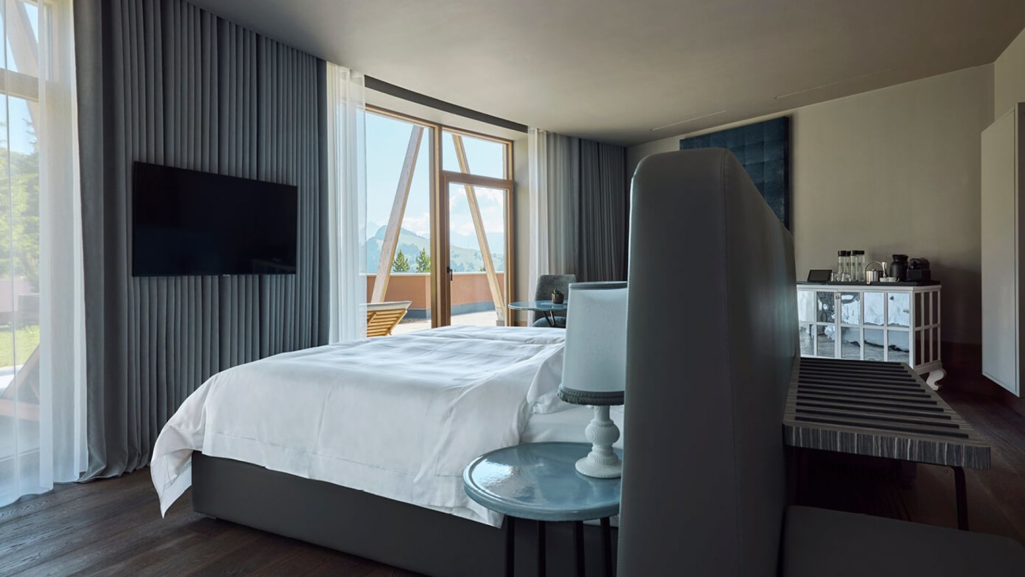 K dispozícii je celkom 60 nádherne zariadených izieb a apartmánov, ktoré sú rozmiestnené v hlavnej hotelovej budove a v pôsobivej kruhovej stavbe Chalet. Veľké okná odkrývajú výhľad na dych vyrážajúce horské scenérie a prepájajú interiéry s okolitou prírodou. K dispozícii sú varianty pre jednotlivcov a páry aj možnosť prepojenia izieb pre rodiny či skupiny priateľov.