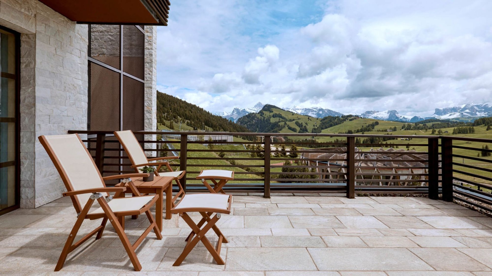 Vychutnajte si dych vyrážajúci výhľad na Dolomity zo súkromnej terasy tejto luxusnej izby (50 m2)...
