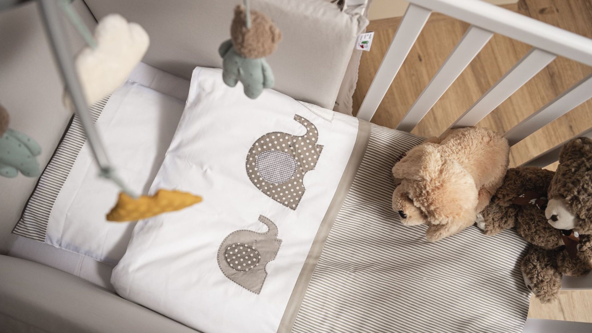 vybavení pro miminka na pokoji: dětská postýlka, vanička, přebalovací podložka, koš na pleny, kočárek a nosítko