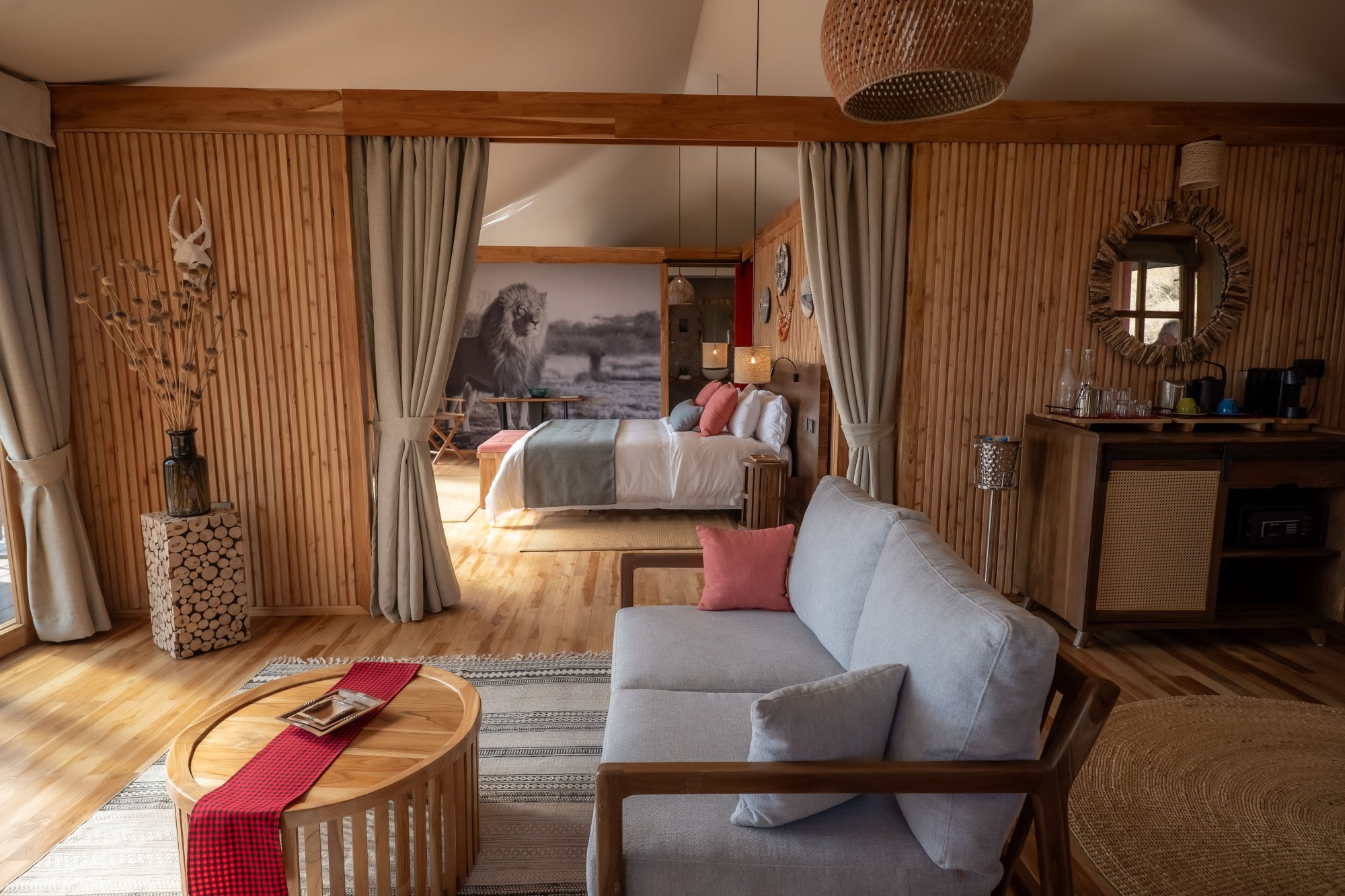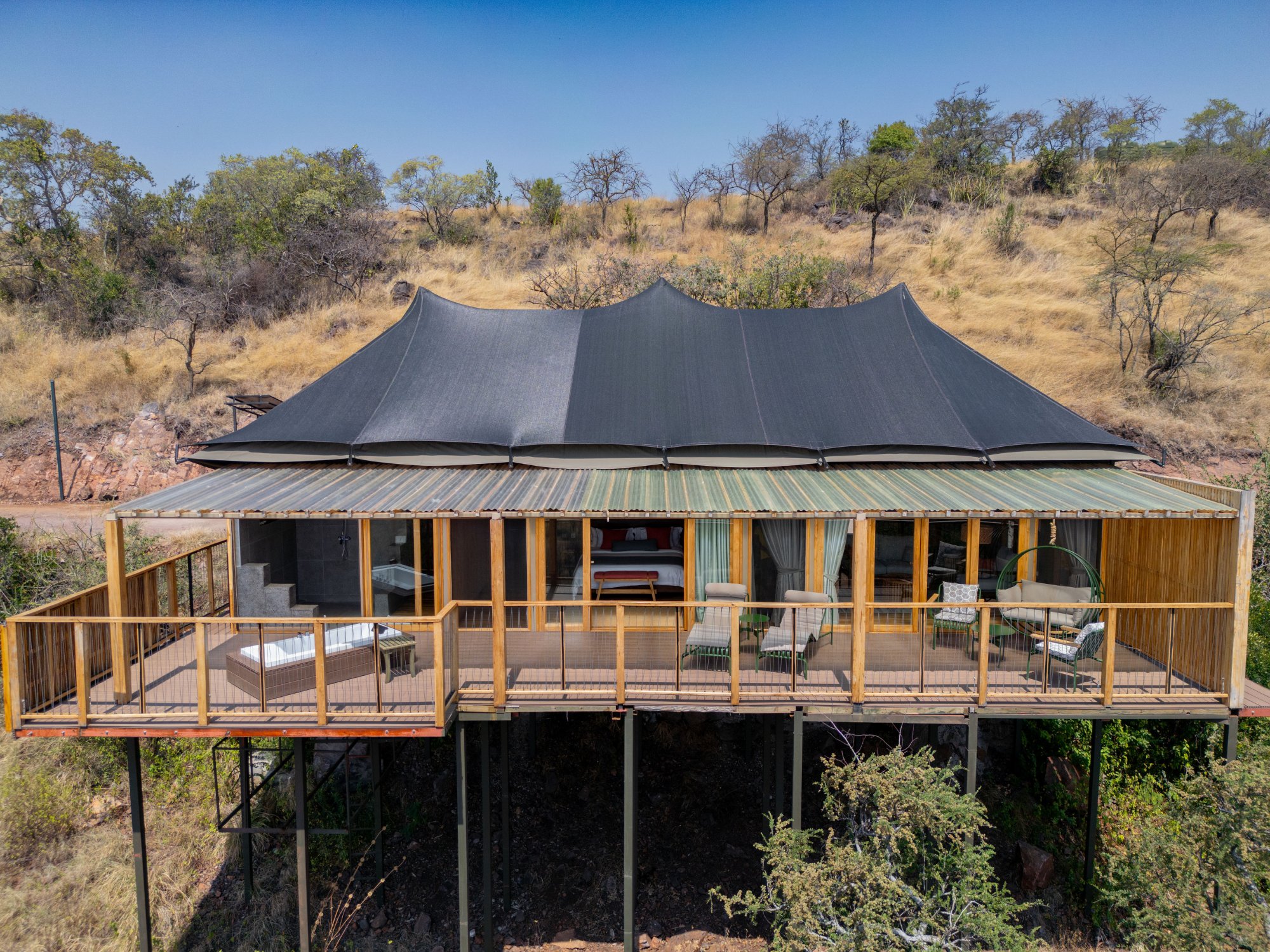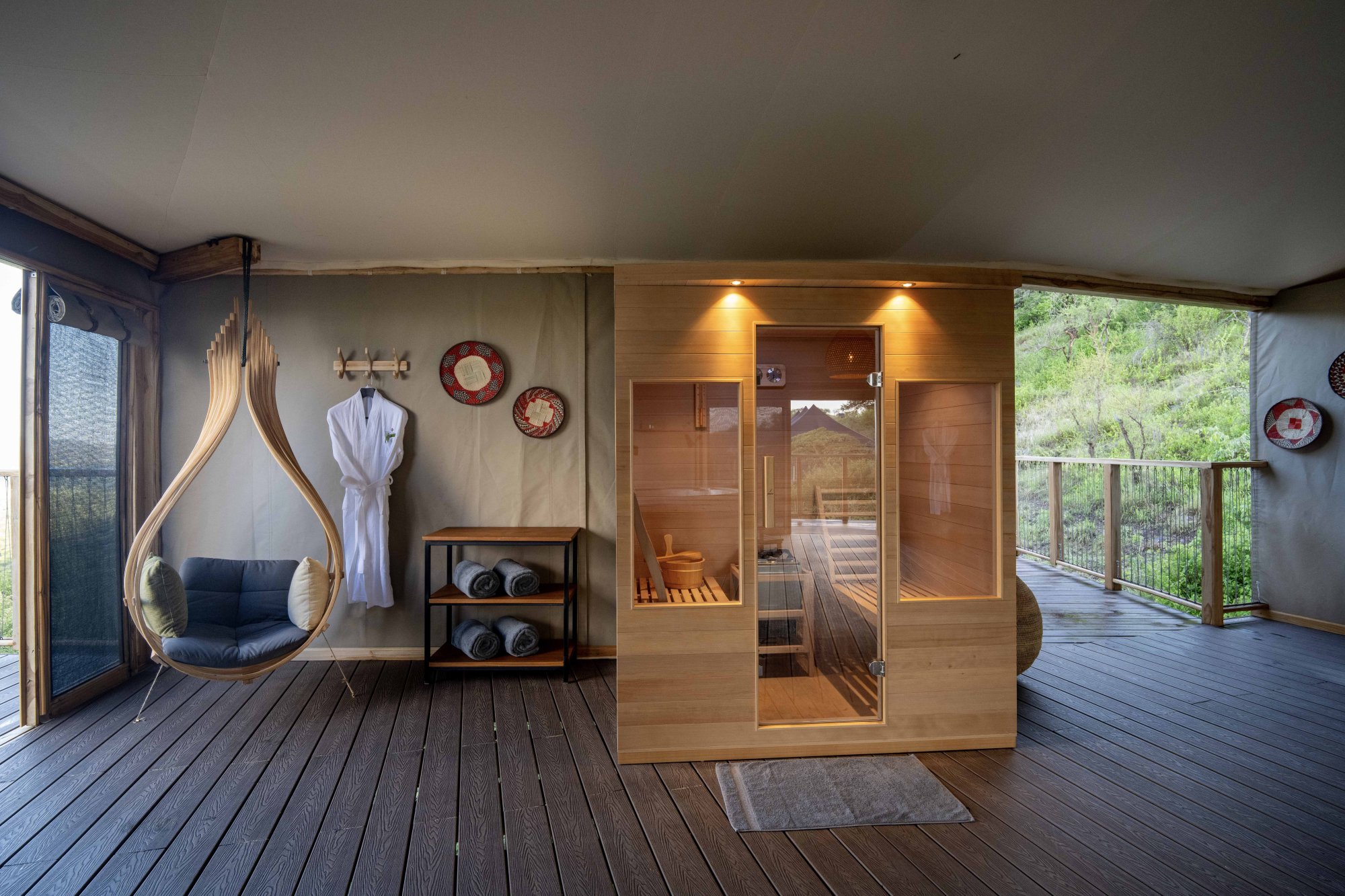 Součástí interiéru je ložnice, obývací část, šatna a koupelna vybavená vnitřní i venkovní sprchou. Všechny stany se nacházejí poblíž hlavní budovy hotelu. K dispozici je také možnost propojení dvou stanů pro rodiny nebo skupiny přátel, které si chtějí užít společné chvíle, a přitom si zachovat vlastní soukromí.