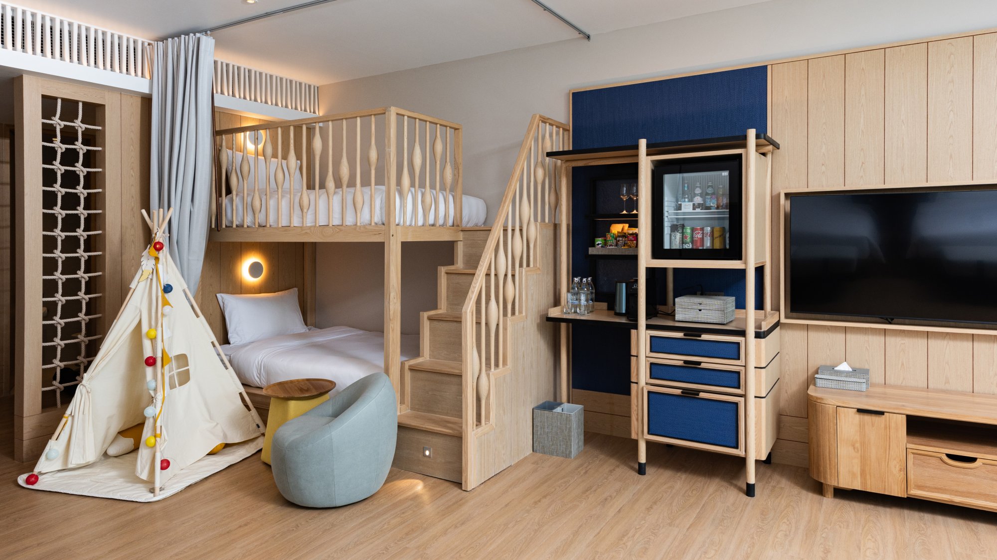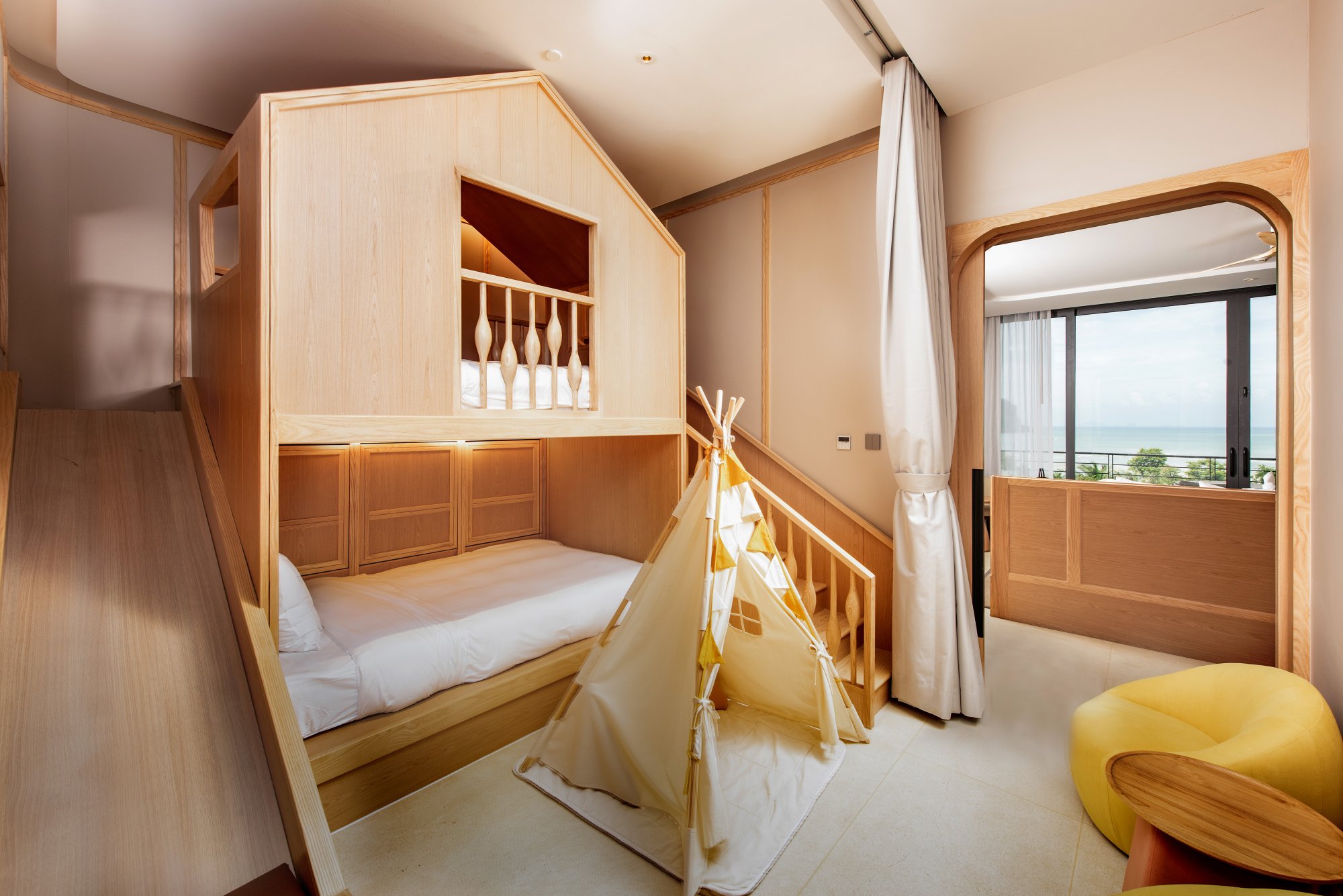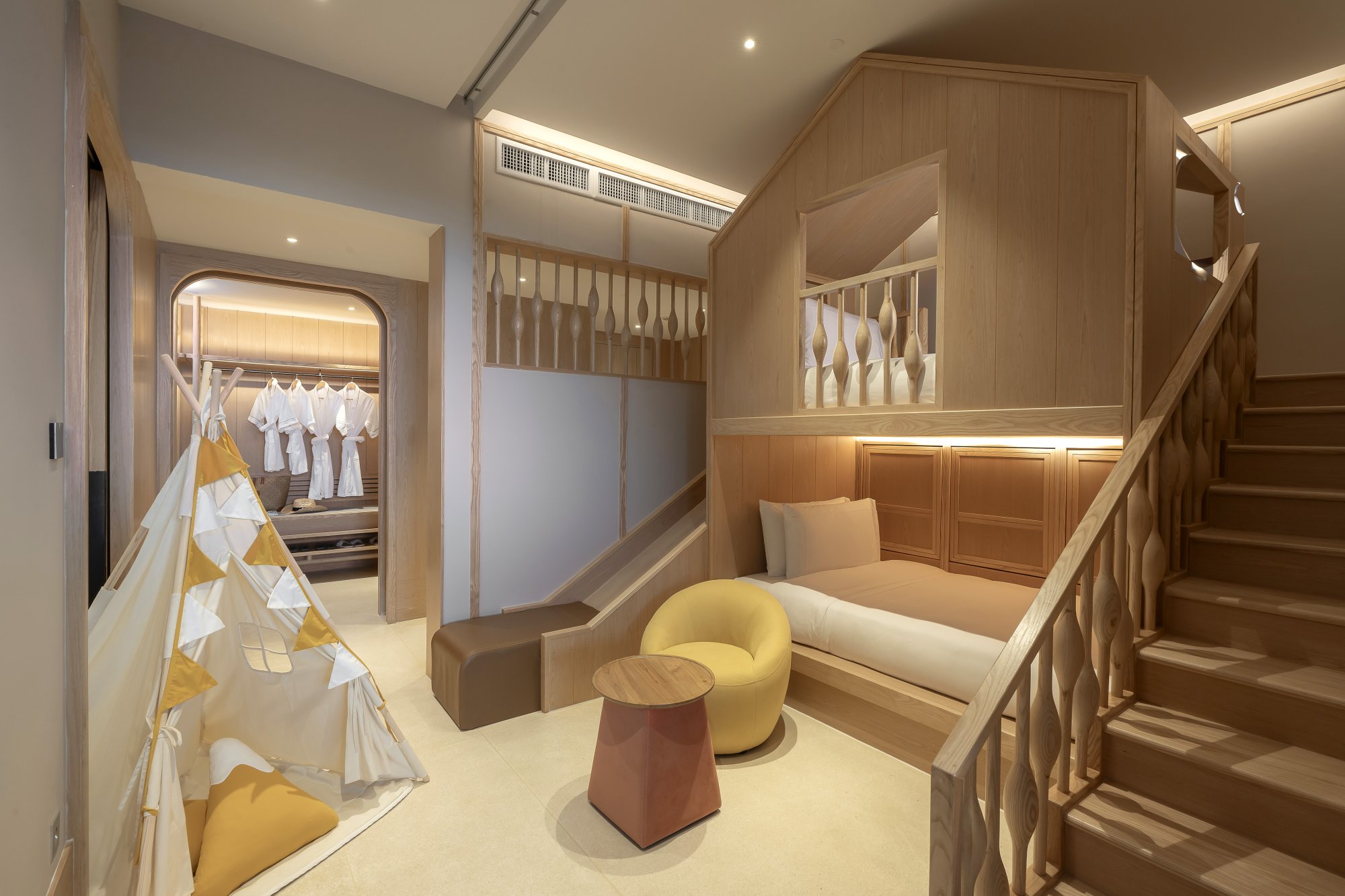 Tento unikátny apartmán (91 m²) so súkromnou terasou a priamym prístupom do hotelového bazéna predstavuje ideálnu voľbu pre rodiny s deťmi. Vnútri nájdete manželskú posteľ či dve samostatné lôžka pre dospelých, poschodovú posteľ a priestor na hranie pre deti, šatník a kúpeľňu vybavenú dažďovou sprchou aj relaxačnou vaňou. Špičkové vybavenie zahŕňa aj kávovar a televíziu s plochou obrazovkou. Zatiaľ čo budete odpočívať v priestrannej obývacej časti, cez francúzske okná môžete pozorovať deti hrajúce sa vonku. Alebo sa zájdite osviežiť do neďalekého bazénového baru. Maximálna kapacita: 3 dospelí a 2 deti.