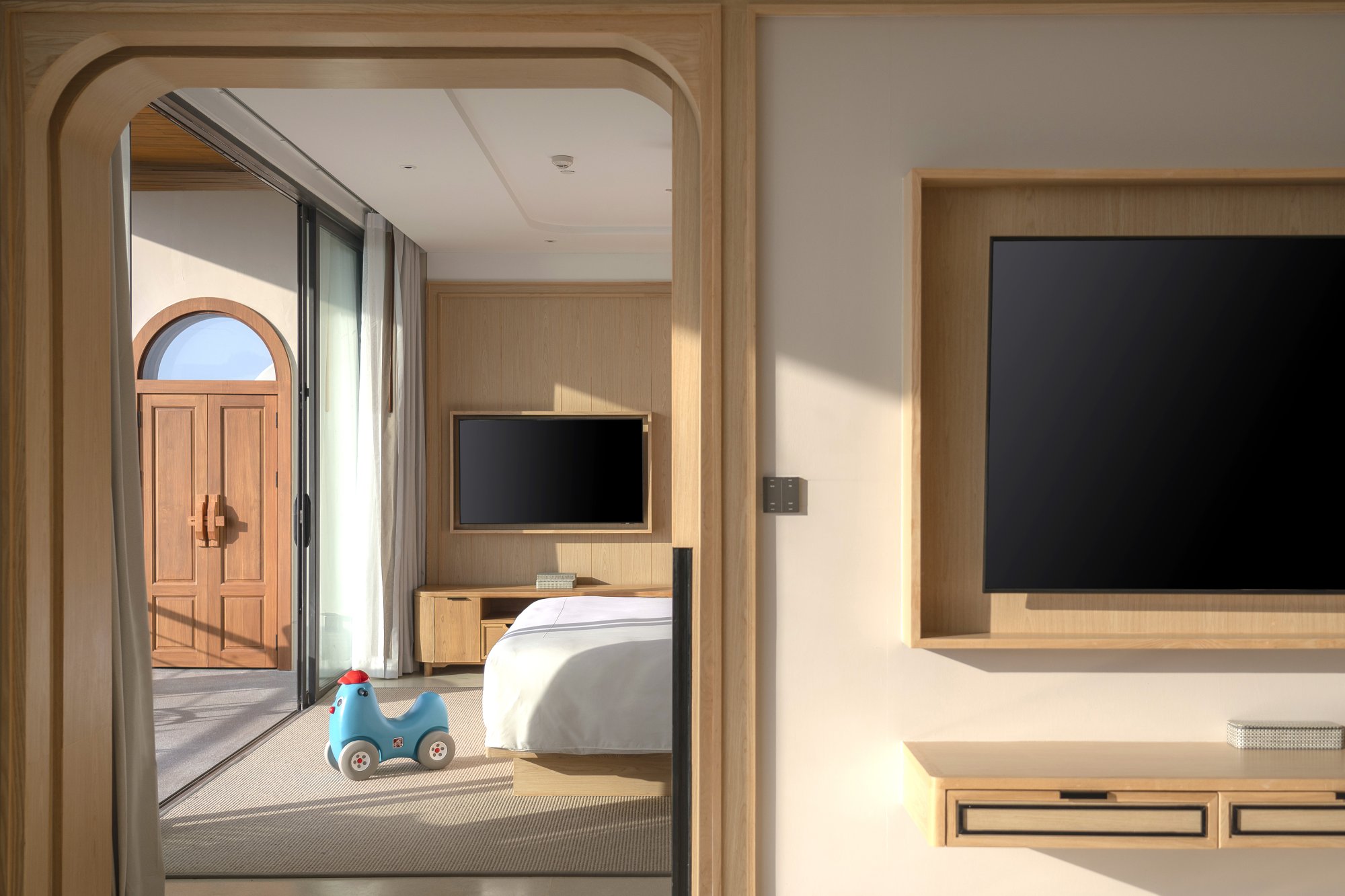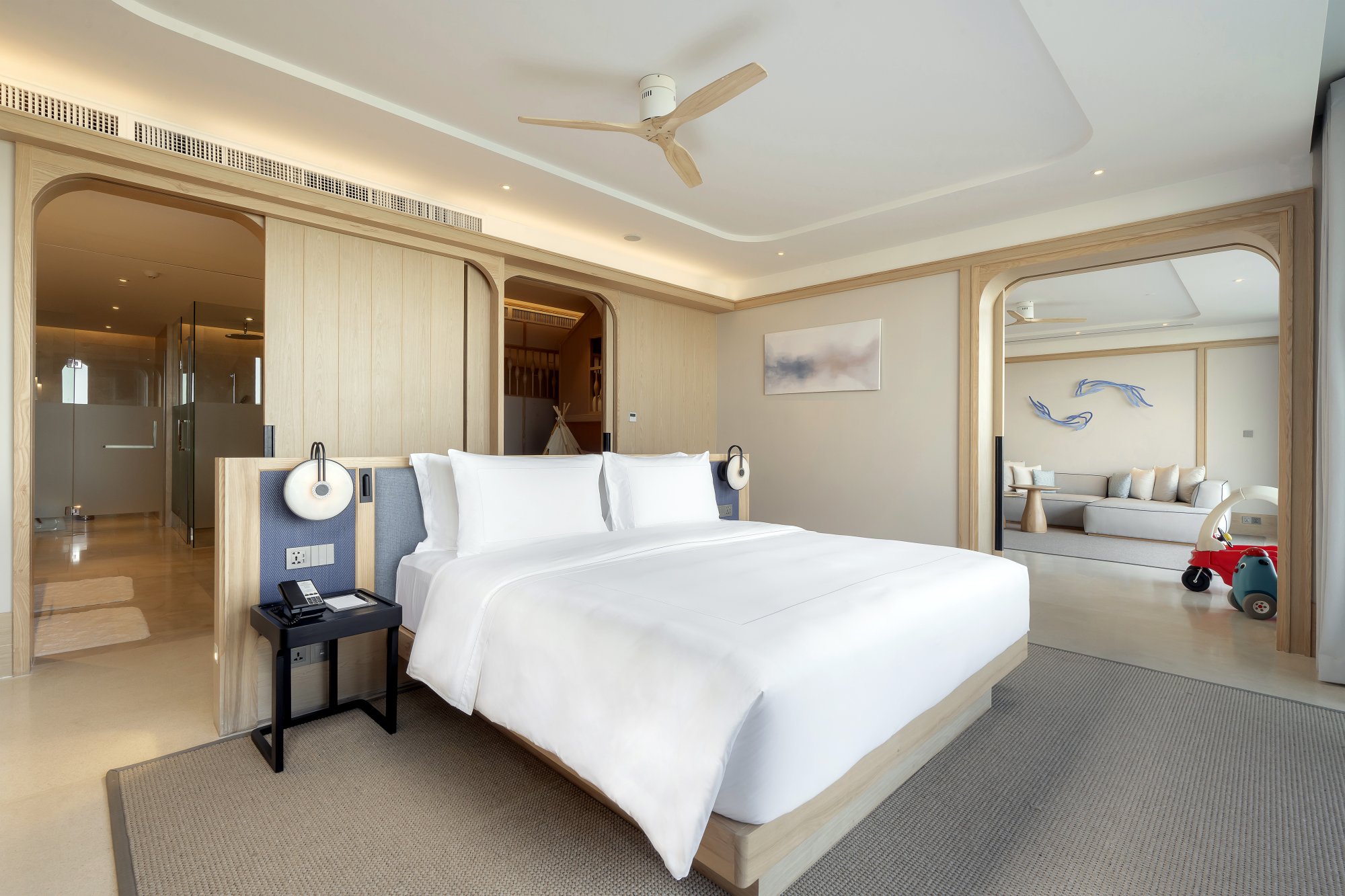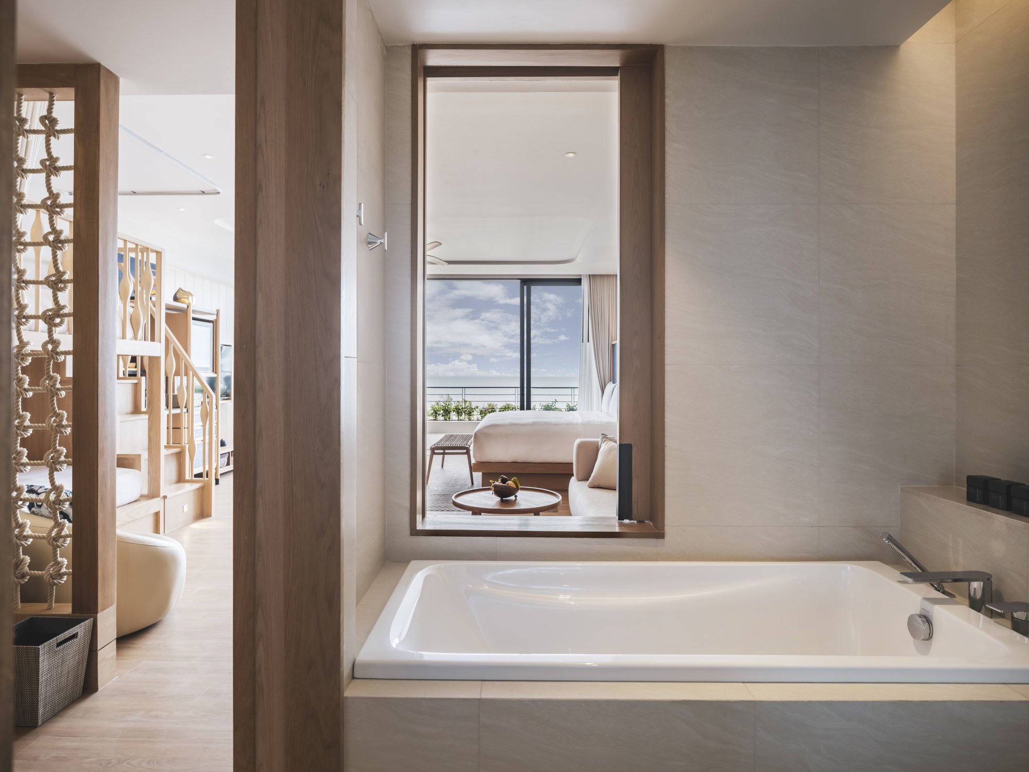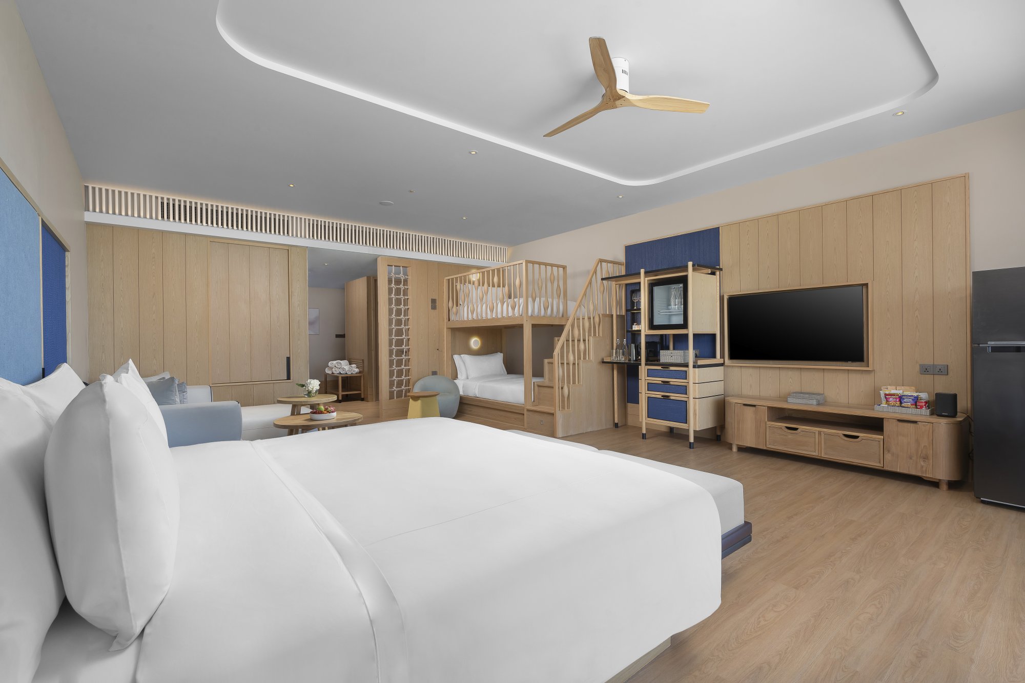 Pre rodiny s deťmi je k dispozícii tento útulný apartmán (91 m²), ktorý zahŕňa manželskú posteľ či dve samostatné lôžka pre dospelých, poschodovú posteľ pre deti a priestor na hranie. Akonáhle deti zaspia, môžete sa uvelebiť na súkromnom balkóne a vychutnať si výhľad na trblietajúcu sa hladinu mora s kokteilom v ruke. Súčasťou izby je aj kúpeľňa vybavená dažďovou sprchou a relaxačnou vaňou, šatník, kávovar a televízia s plochou obrazovkou. Maximálna kapacita: 3 dospelí a 2 deti.