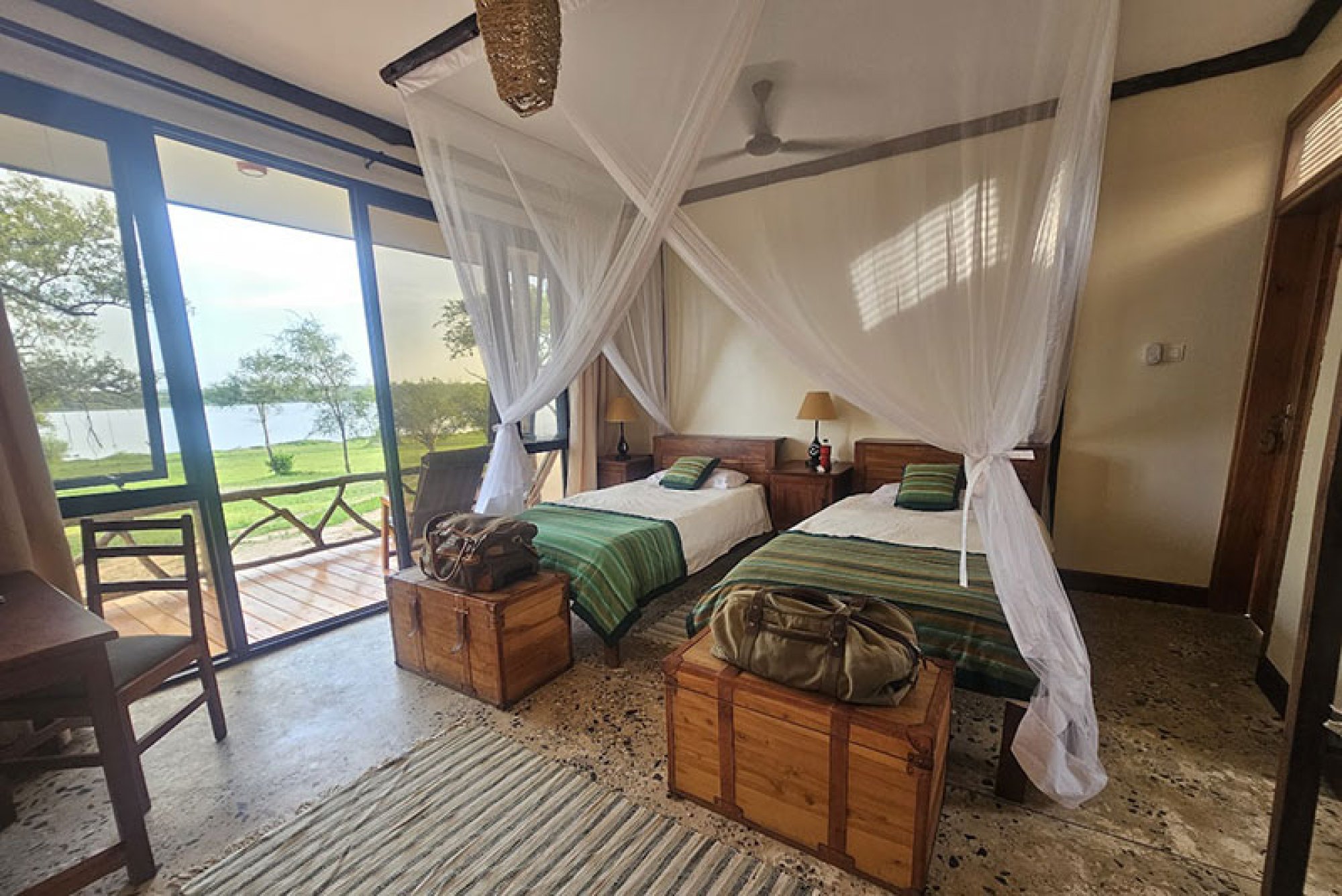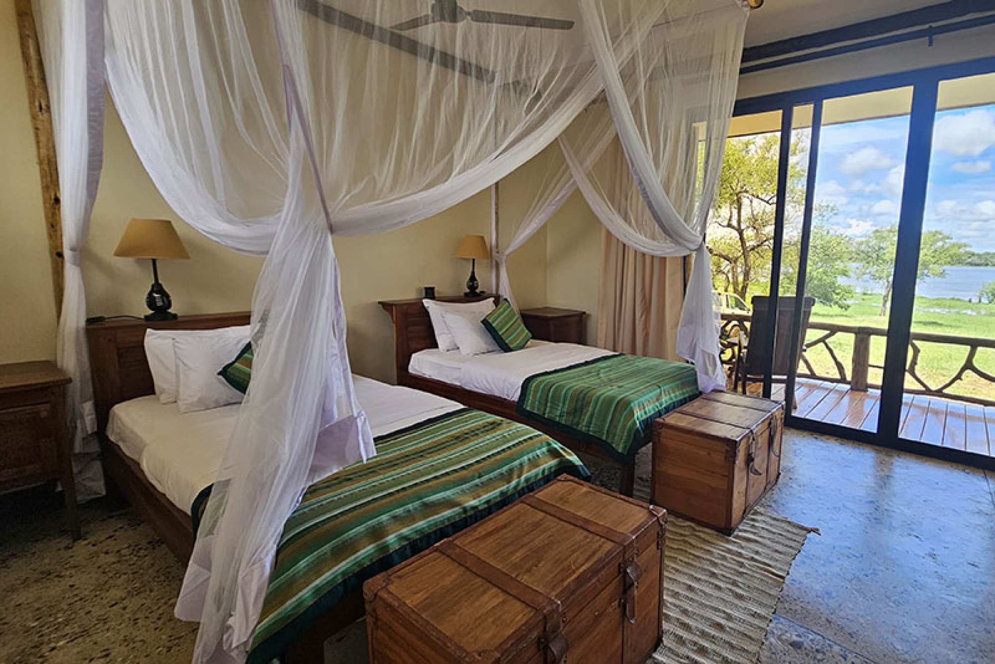 Každý ze čtyř individuálně zařízených dvoulůžkových pokojů (s manželskou postelí nebo oddělenými lůžky) je vybaven posuvnými dveřmi, které vedou na soukromou verandu s výhledem na řeku. Světlý, vzdušný a prostorný interiér zdobí nábytek z masivu vyrobený na míru a speciálně vybrané doplňky dotvářející safari atmosféru. Součástí vybavení je také stropní ventilátor a závěsné moskytiéry. Otevřené koupelny jsou zařízené sprchou a dvěma umyvadly. Vila Anyadwe stojí na vyvýšených sloupech a je navržena s ohledem na životní prostředí – od využití dešťové vody přes výrobu bioplynu až po elektřinu a ohřev vody na solární energii. Všechna okna a dveře ve vile jsou opatřeny moskytiérou, což umožňuje přirozené větrání a chlazení interiérů. V areálu je k dispozici bezplatné Wi-Fi připojení.