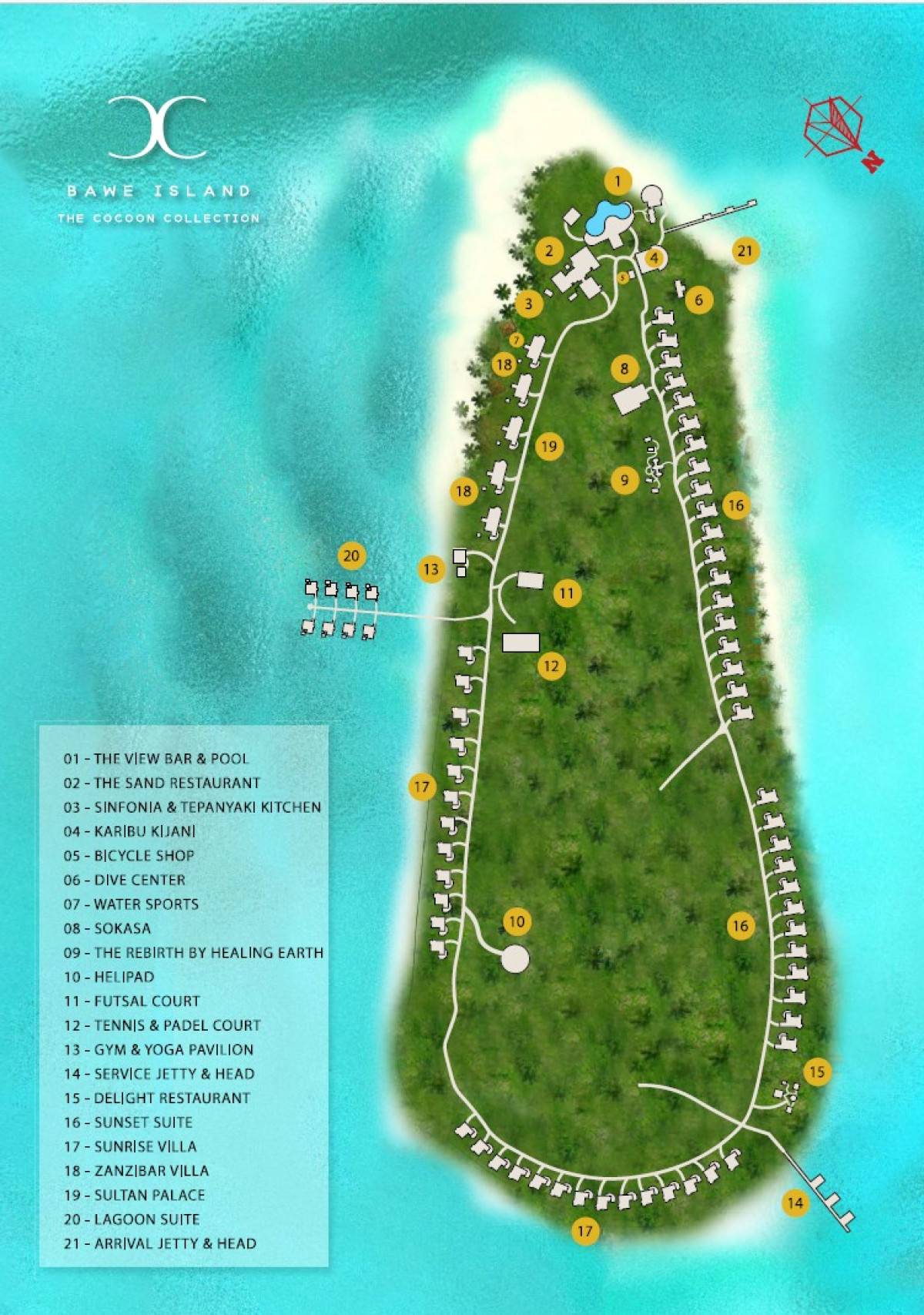 Rezort Bawe Island zastupuje exkluzívnu novinku z overeného hotelového reťazca The Cocoon Collection. Nachádza sa na samostatnom ostrovčeku v blízkosti Zanzibaru obklopený bujnou vegetáciou. Rezort ponúka maximálnu súkromie aj exkluzivitu, a zároveň výhodnú polohu len 15 minút jazdy motorovým člnom od historického centra zanzibarského hlavného mesta. Pristávacia plocha pre vrtuľník navyše umožňuje ľahké spojenie s najvýznamnejšími tanzánskymi safari destináciami. Každý detail v tomto modernom elegantnom africkom rezorte je navrhnutý tak, aby zaistil hosťom nezabudnuteľný pobyt.